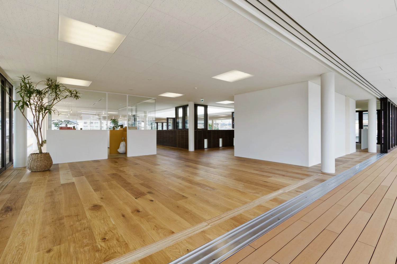 Дома-короба со встроенными сидениями устанавливаются в стеклянные балюстрады на втором этаже, в которых есть окна с отверстиями на каждой стороне высокого коридора, которые стремятся к крыше здания.