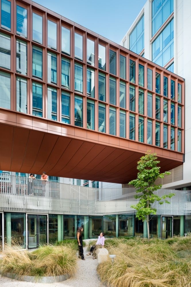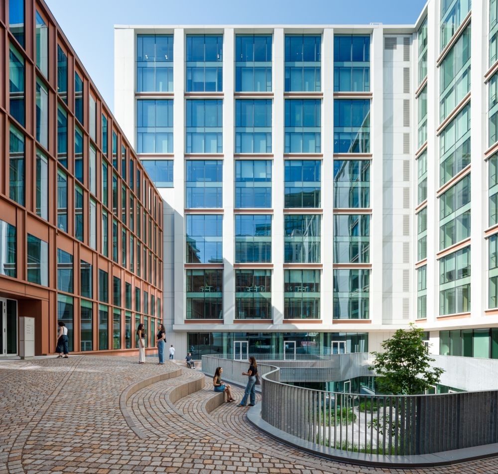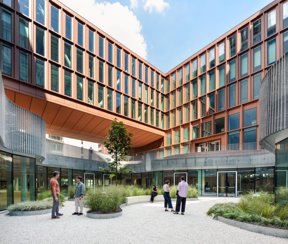 Изначально это был классический, тяжеловесный и абсолютно герметичный офисный блок. Архитекторы провели радикальную операцию по адаптивному повторному использованию: они буквально вскрыли глухие фасады здания, впустили внутрь максимум естественного света и организовали сквозные пешеходные проходы. Неприступная коммерческая крепость превратилась в проницаемую структуру, первые этажи которой плавно перетекают в городские тротуары и открытый внутренний сад.