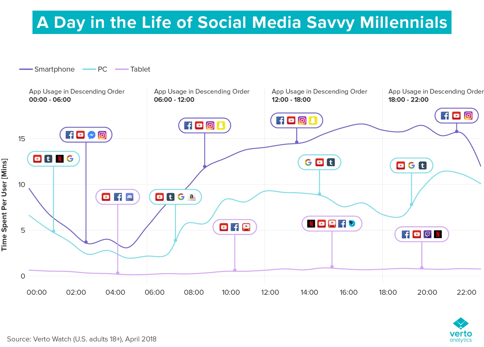 Изучение того, как проводит своё время человек поколения «Игрек» дает возможность лучше его понять. Мы уже знаем, что это цифровой человек, который привык свободное время проводить в виртуальном мире, погружаясь в просмотр новостей на медиа каналах или общаясь в социальных сетях. Какие платформы, приложения и технику он использует в конкретное время дня? Исследование Verto показывает следующую статистику:
