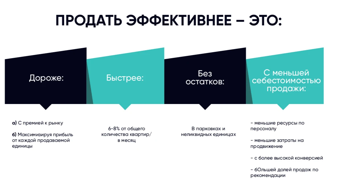 - Быстрее. Или в правильный срок. В классике считается, что проект (например, дом) строится 12-18 месяцев. Задача – полностью продать его до ввода в эксплуатацию. То есть, нормальный темп продаж 6-8% от общего количества квартир в доме. Вы можете продавать быстрее, но тогда что есть вероятность, что вы продаете дешевле и недополучаете прибыль. Вне классики на это могут влиять и другие условия, например, необходимость вывода новой очереди.