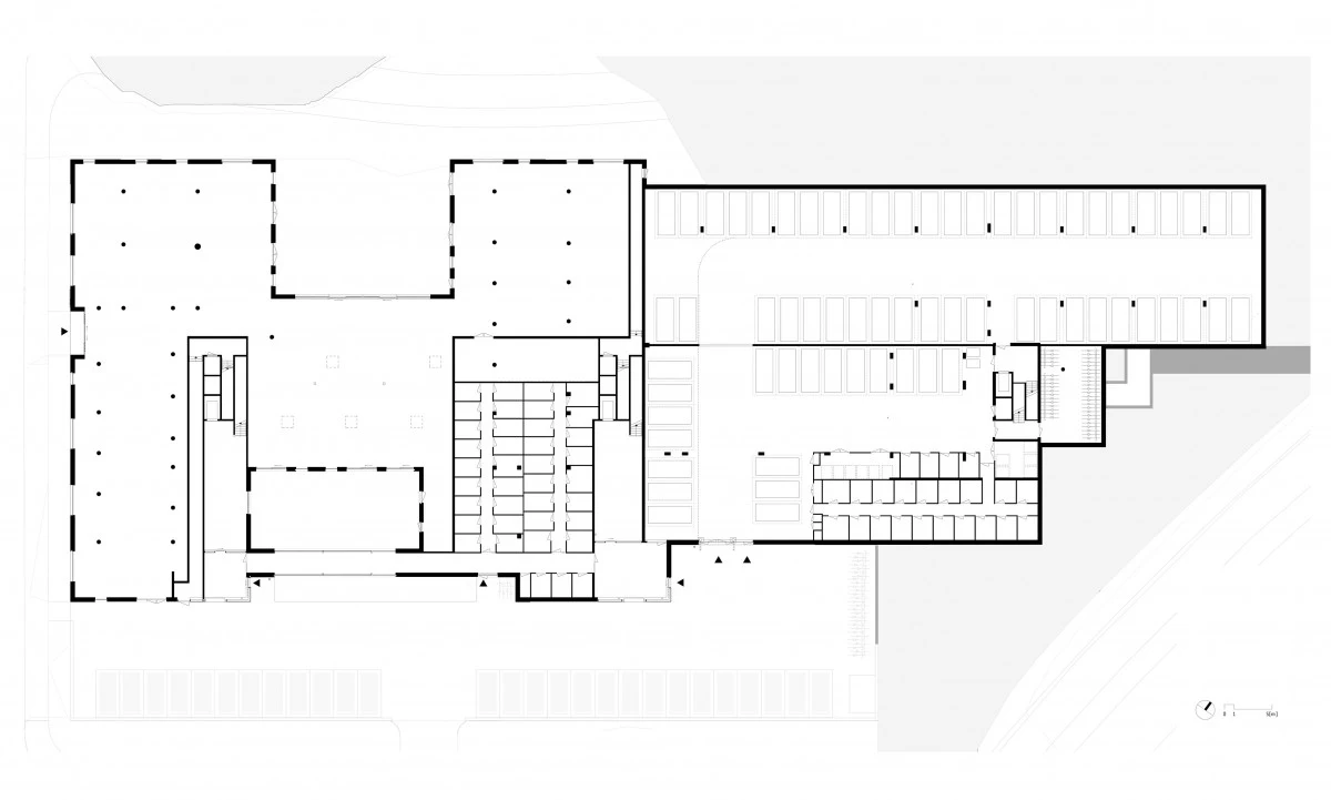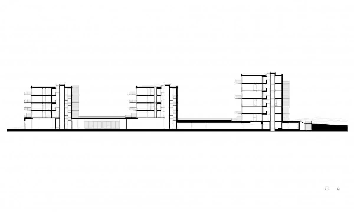 Исходя из вышеупомянутых отправных точек, Atelier PRO architects спроектировало здание, которое умело решает сложную задачу на этом уникальном месте. Это компактное, многогранное здание, сочетающее жизнь в городском и зеленом контексте, динамично реагирует на качество местности.