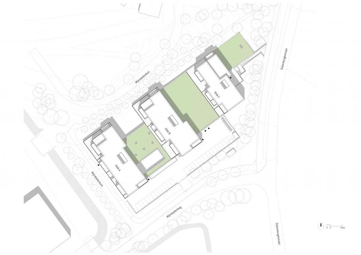 К северу от участка зеленый склон соединяет два уровня автостоянки с зеленой дюной. Блок A и B, в котором находятся центры по уходу за детьми и после школы, стоит на городском постаменте, расположенном напротив Международной школы. Над дюной находится верхний уровень земли, который поддерживает блок C. Все три блока имеют свои собственные входы – A и B на первом этаже выходят на Wijndaelerweg и C на втором этаже на Ockenburgstraat. Все три входа обеспечивают внутренний доступ к автостоянке.
