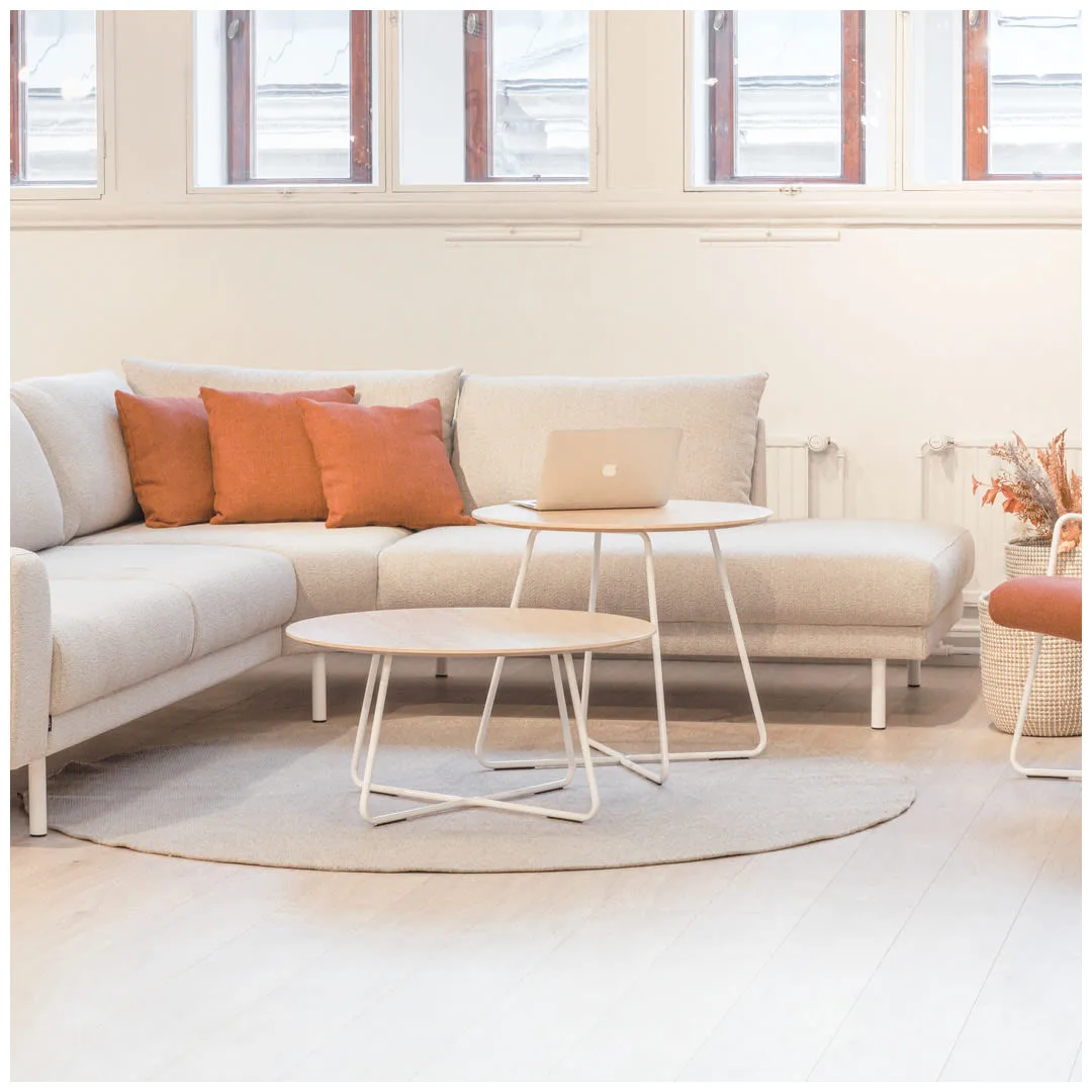 Solt – изящный дизайнерский стол в современном скандинавском стиле. Стол доступен в двух вариантах высоты и в разных материалах.В линейку продуктов Solt также входят мягкое кресло и подставка для ног.