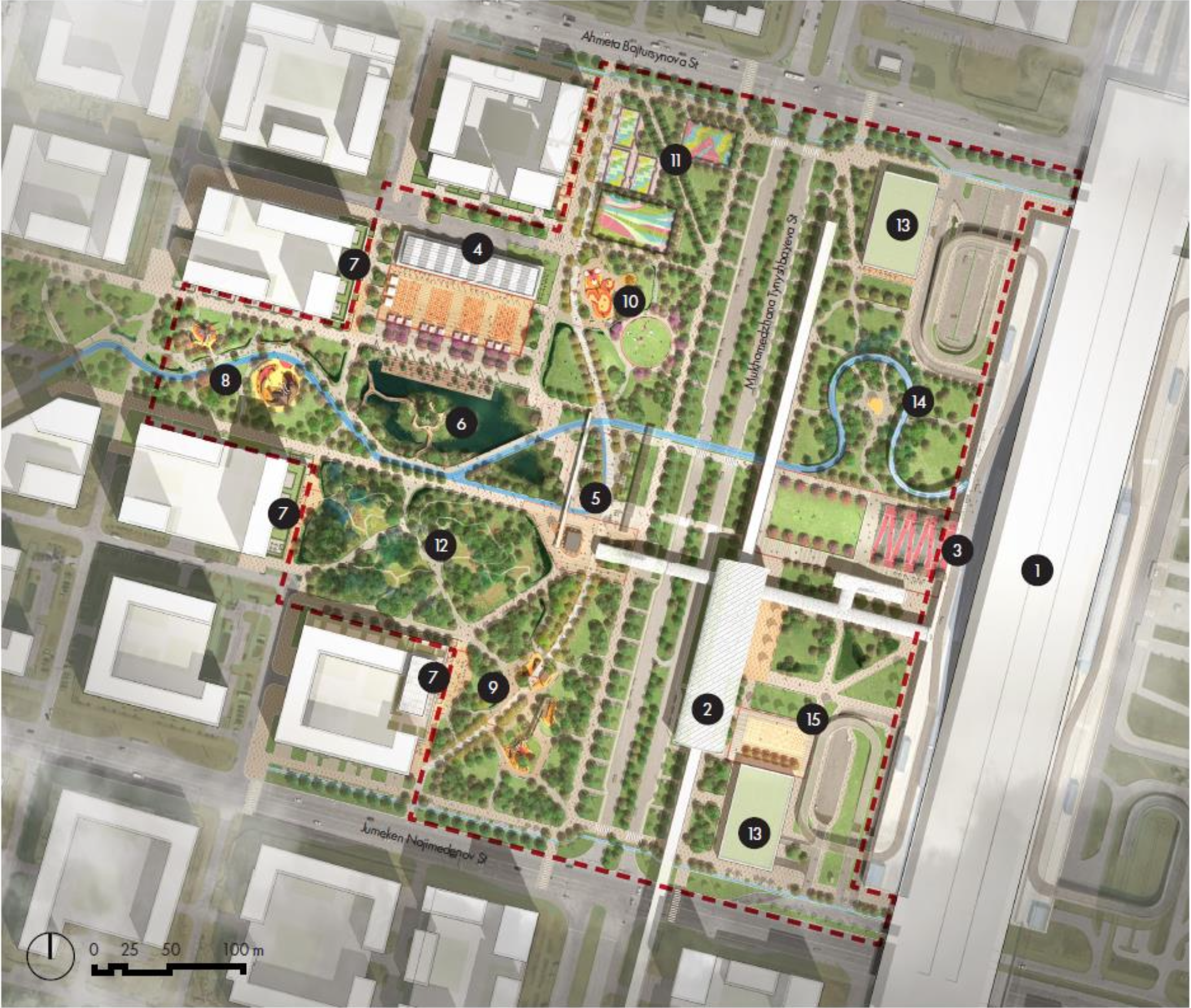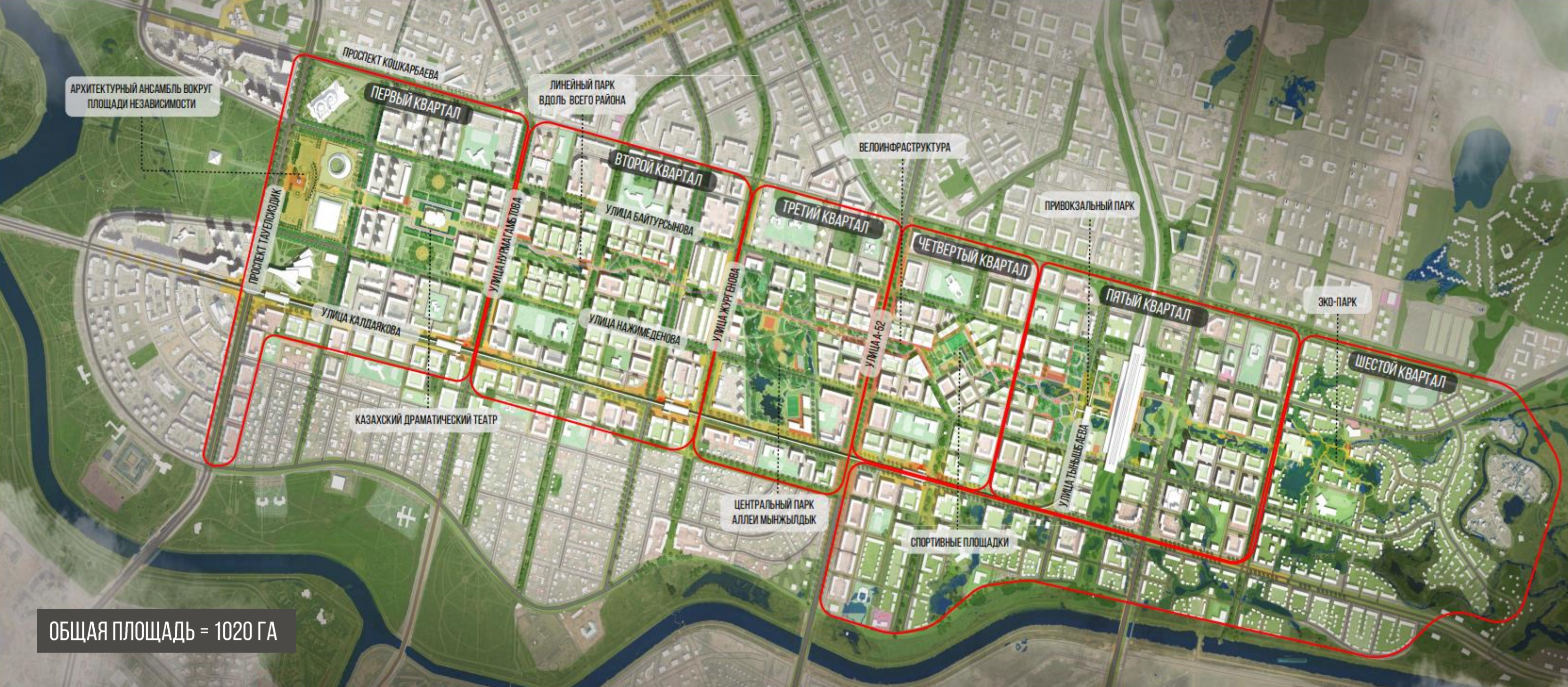 Основным элементом проекта является линейный парк протяженностью 4 км и шириной 80 метров, который соединит площадь «Қазақ елі» и вокзал «Нұрлы жол».