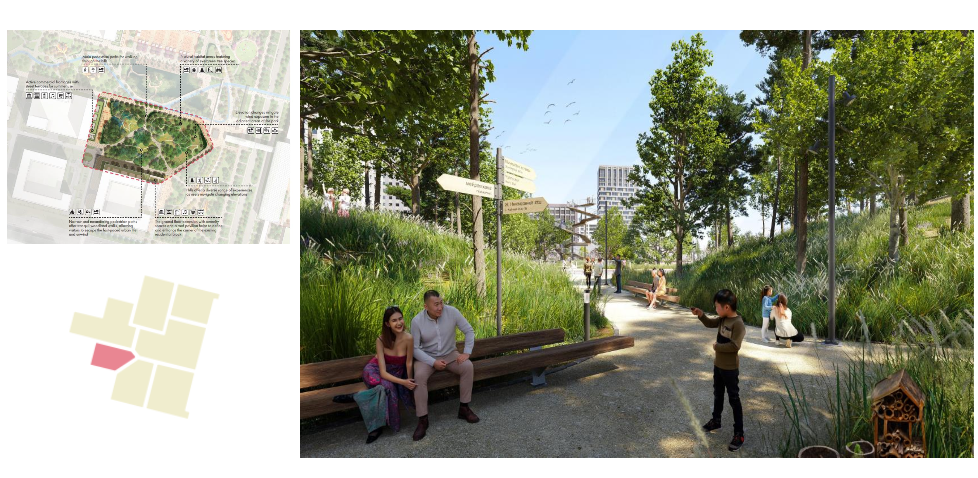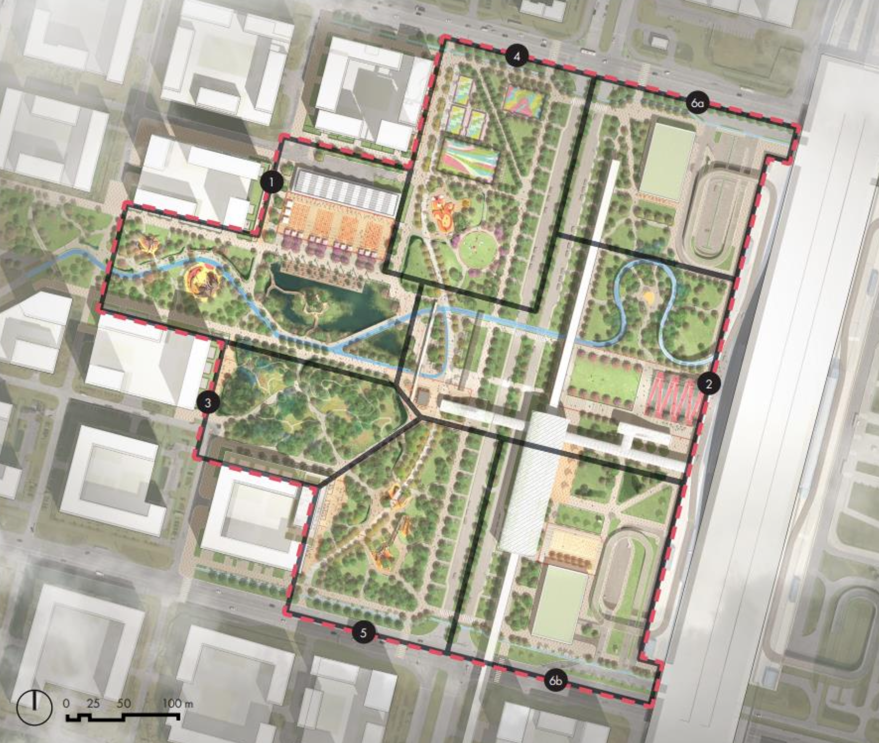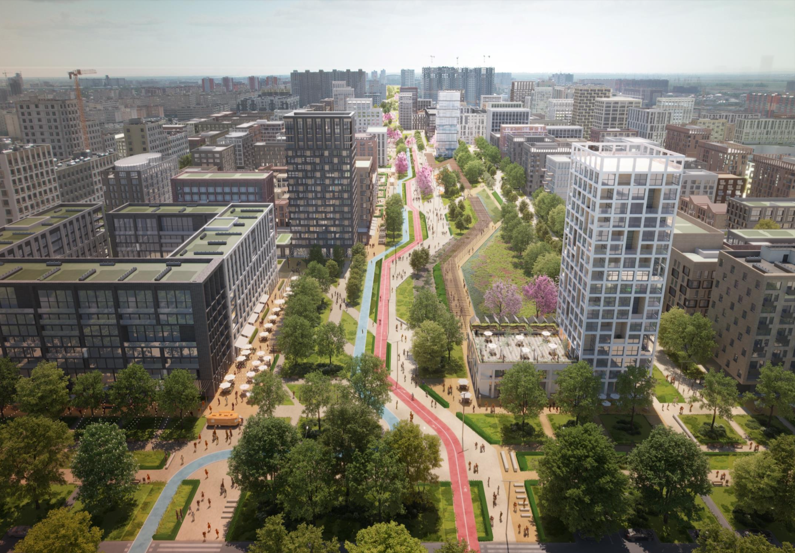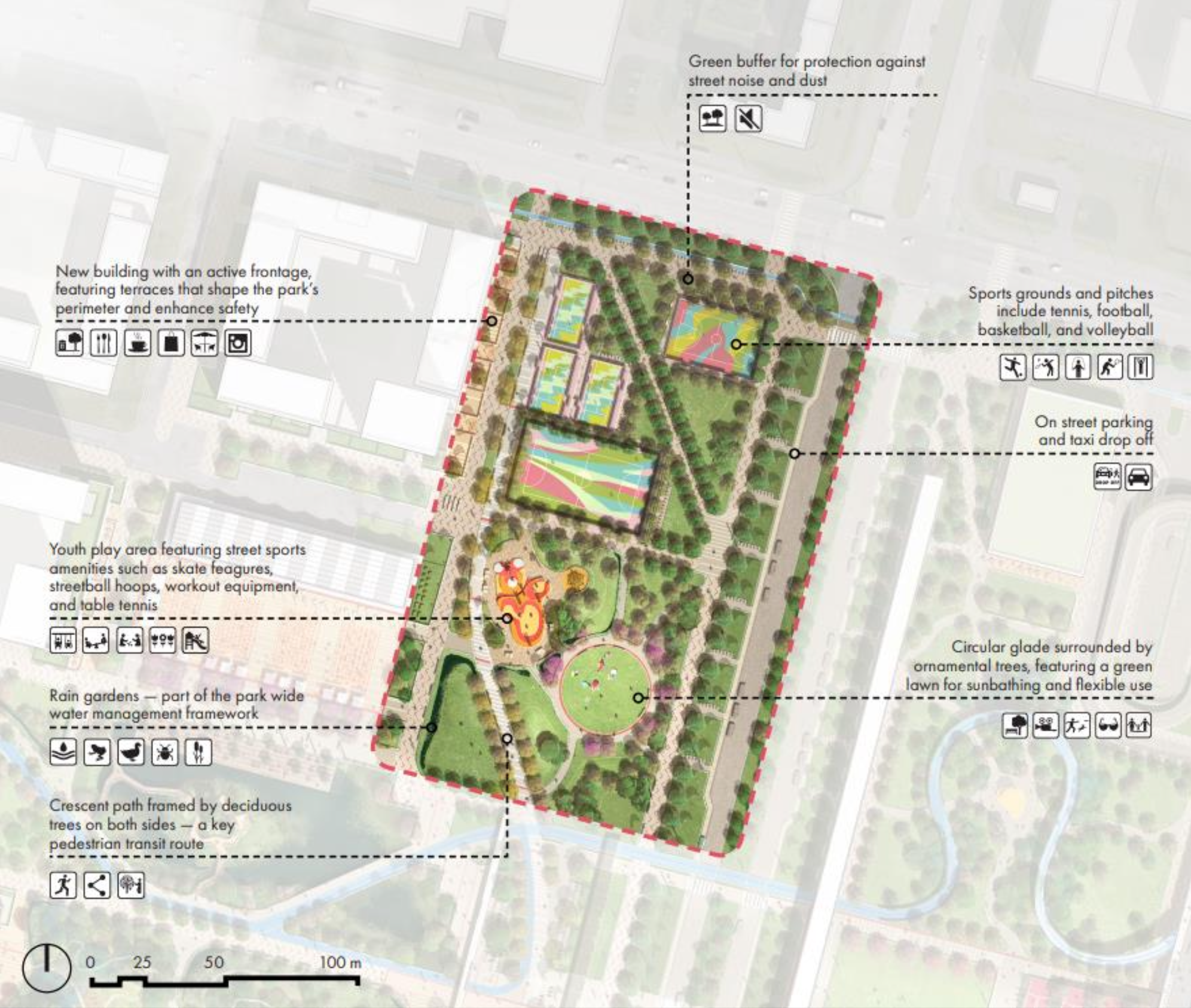 Парк будет полностью соответствовать концепции «город для людей», где предусмотрены удобные пешеходные зоны, вело-инфраструктура и комплексное озеленение.