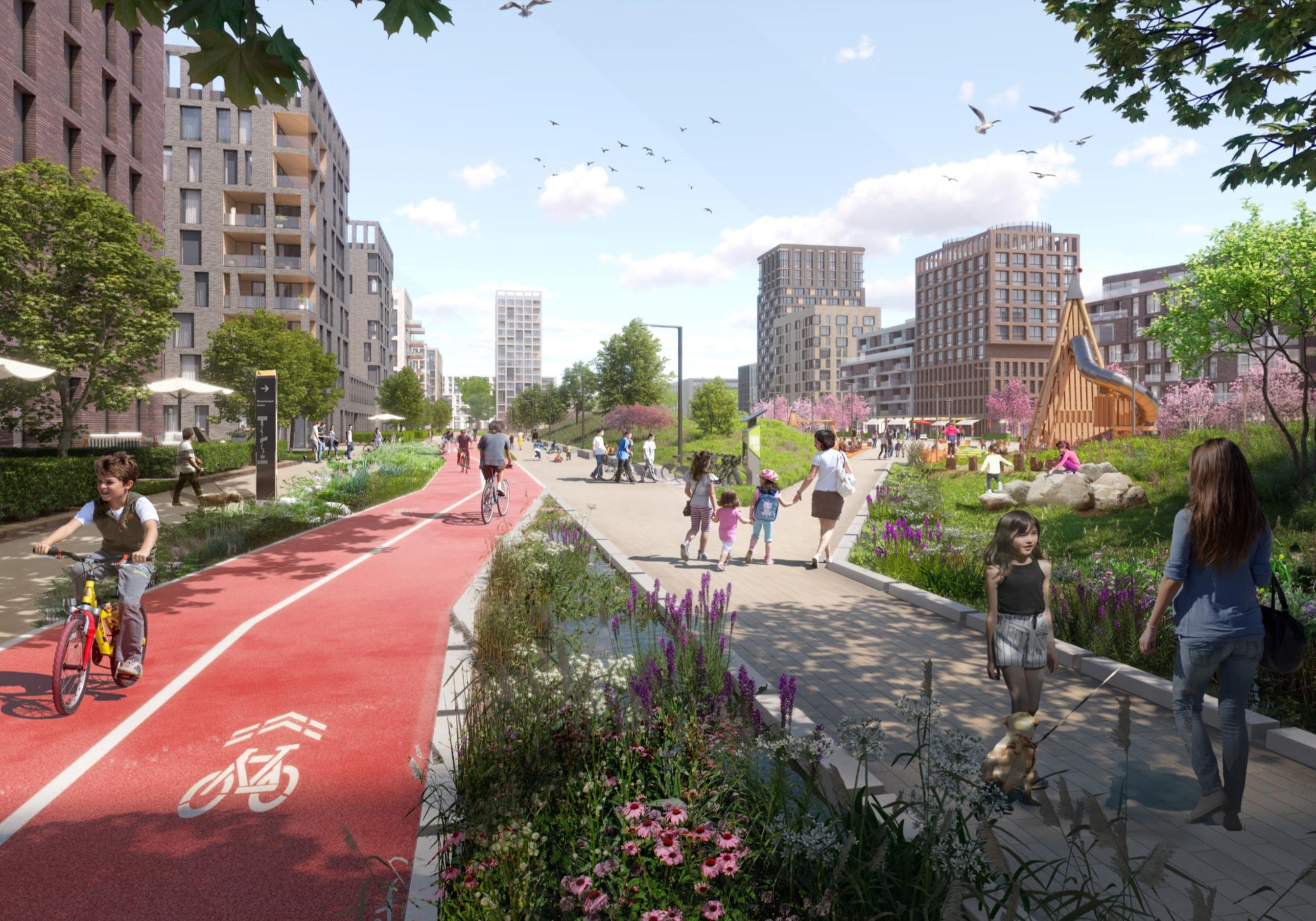 Вдоль парка предусмотрены велодорожки и общественные пространства, обеспечивающие удобный доступ как для пешеходов, так и для велосипедистов.
