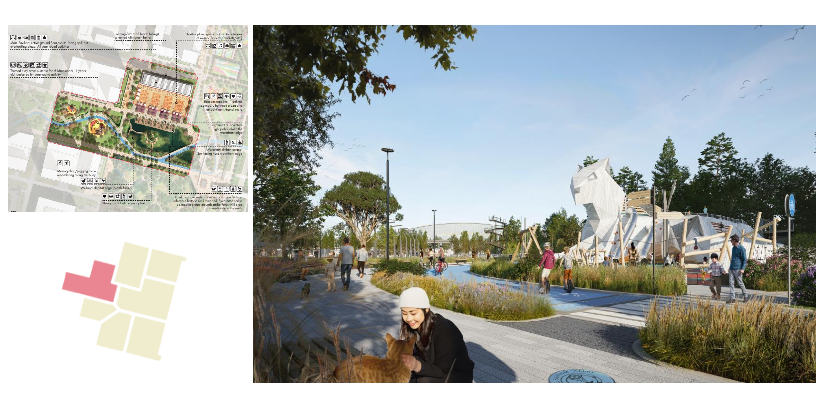Парк был разделен на 6 основных характерных зон, причем 6-я разделена на север и юг, решая схожие проблемы вдоль границы станции. Разделение этих зон позволило вывести различные приоритеты в каждой зоне, это также вписывается в стратегию поэтапного распределения, позволяющую участкам земли выходить вперед независимо. Цель каждой зоны — предоставить что-то, чего в настоящее время не существует в этой местности.