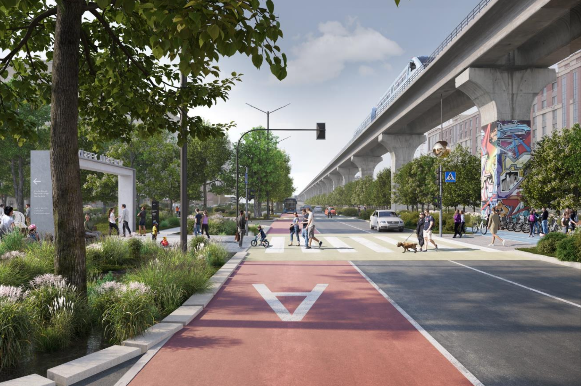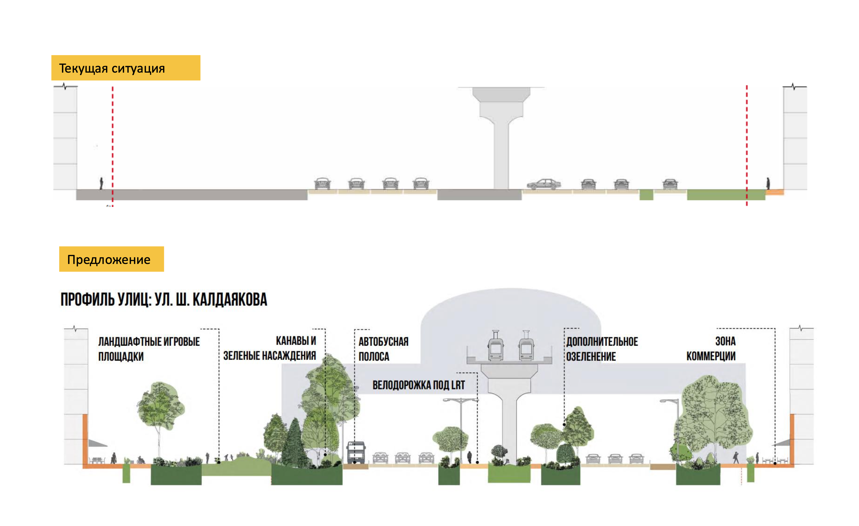 Вдоль линии ЛРТ тоже будут созданы условия для комфортного проживания. Будут пересмотрены профиля улиц в пользу озеленения и пешеходной доступности. Для снижения нагрузки на ливневую канализацию предлагается использовать систему устойчивого дренажа.