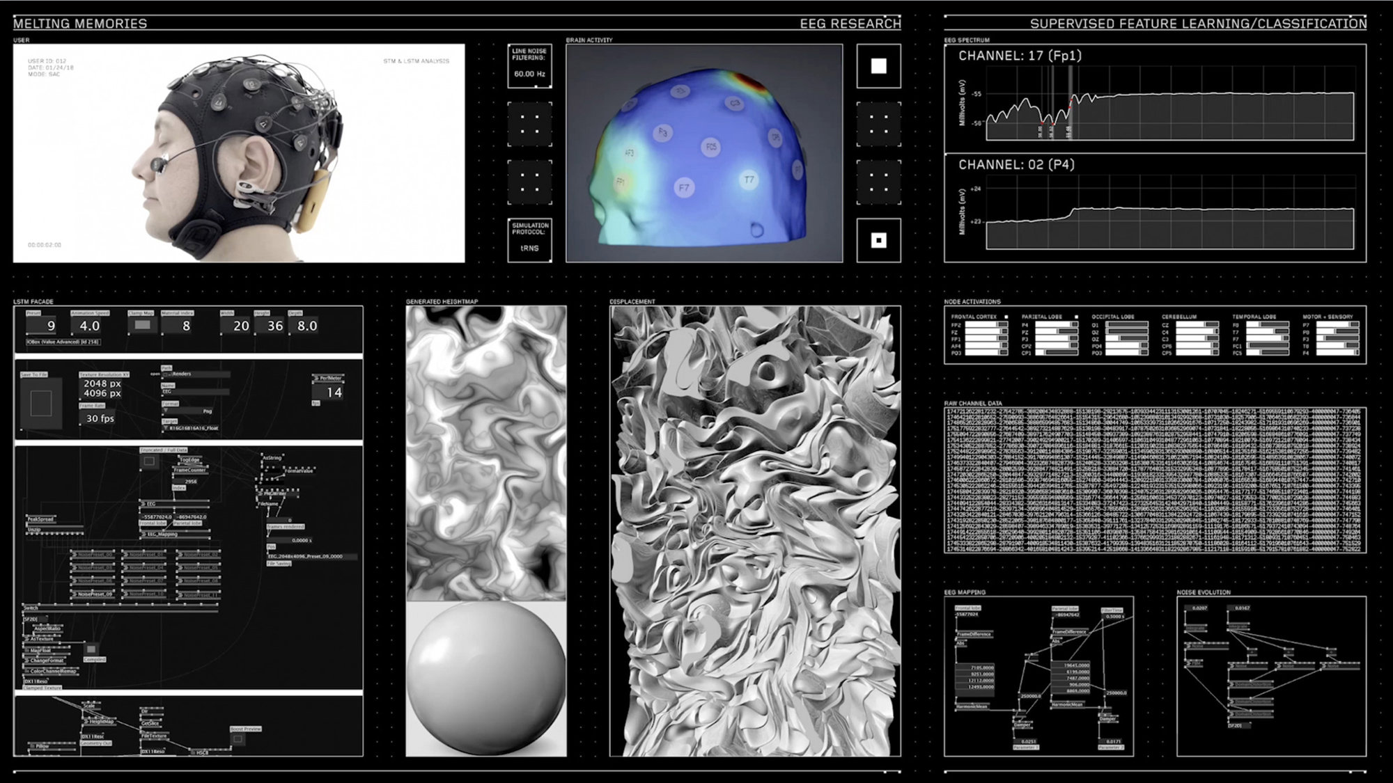 В «Плавящихся воспоминаниях» участникам было предложено сосредоточиться на конкретных долговременных воспоминаниях во время записи ЭЭГ. Эти данные составляют «строительные блоки для уникальных алгоритмов, которые необходимы художнику для создания многомерных визуальных структур».