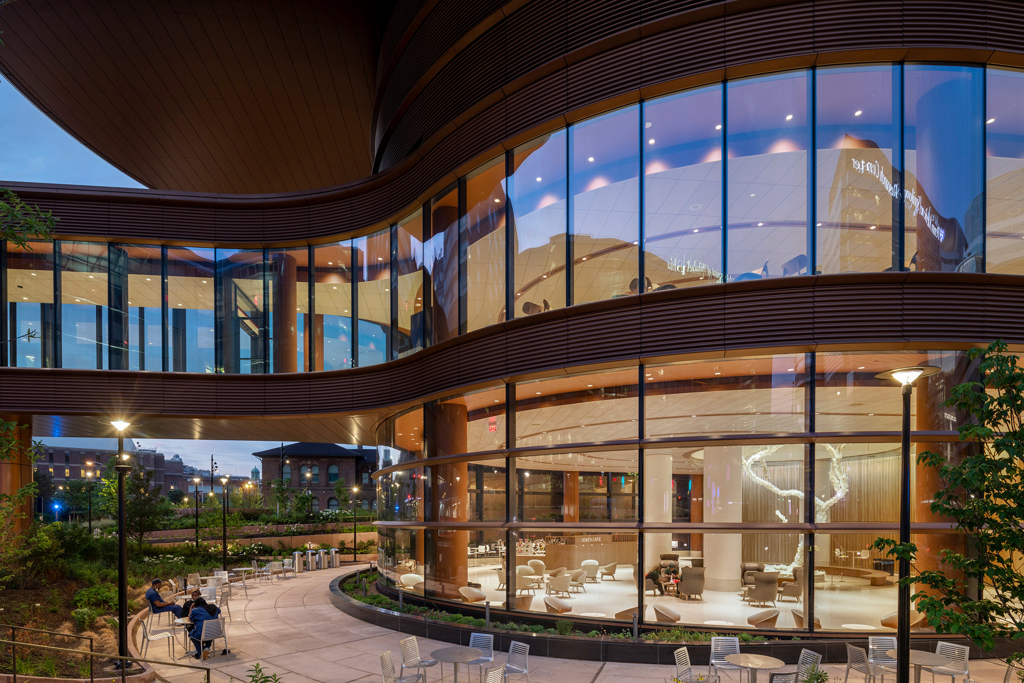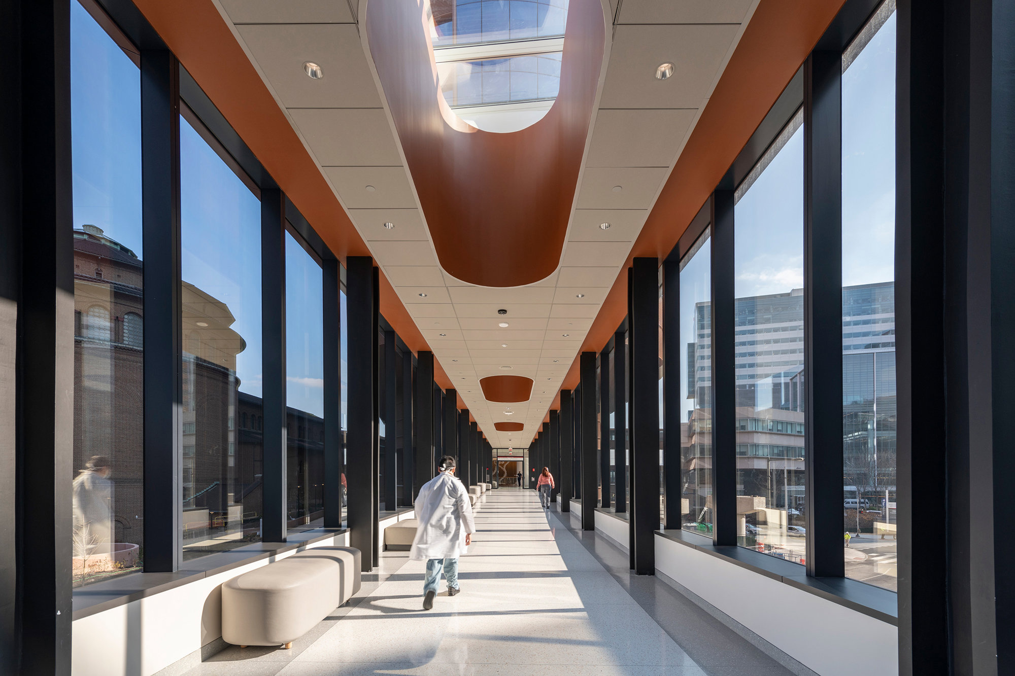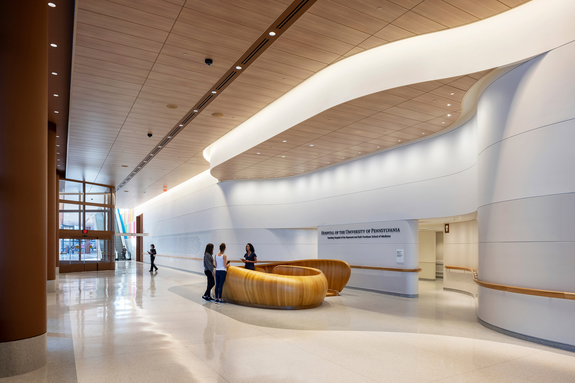 В павильоне Пенсильванского университета расположен впечатляющий, ультрасовременный спектр исследовательских и лечебных учреждений. В этом комплексе, состоящем из 500 отдельных палат для пациентов с регулируемым уровнем освещенности, от отделений интенсивной терапии до основных стационарных удобств, достаточно места для ночлега семей пациентов. Дизайн павильона также объединяет внешнее и внутреннее пространство, уделяя особое внимание естественному освещению и перспективам для пациентов, посетителей и персонала. Это способствует созданию успокаивающей атмосферы, поскольку постоянное искусственное освещение может нарушить циркадные ритмы, усиливая стресс и замешательство.