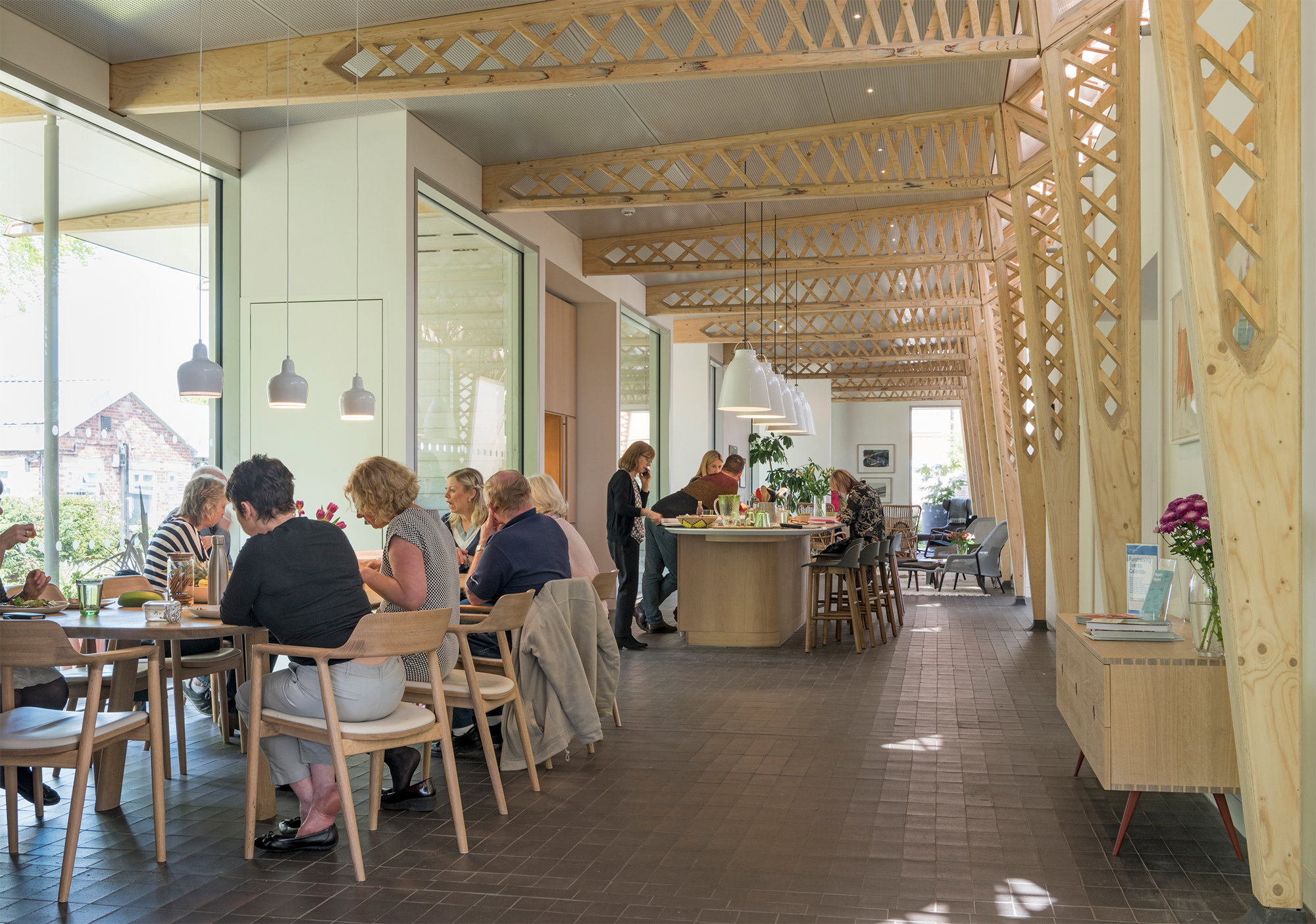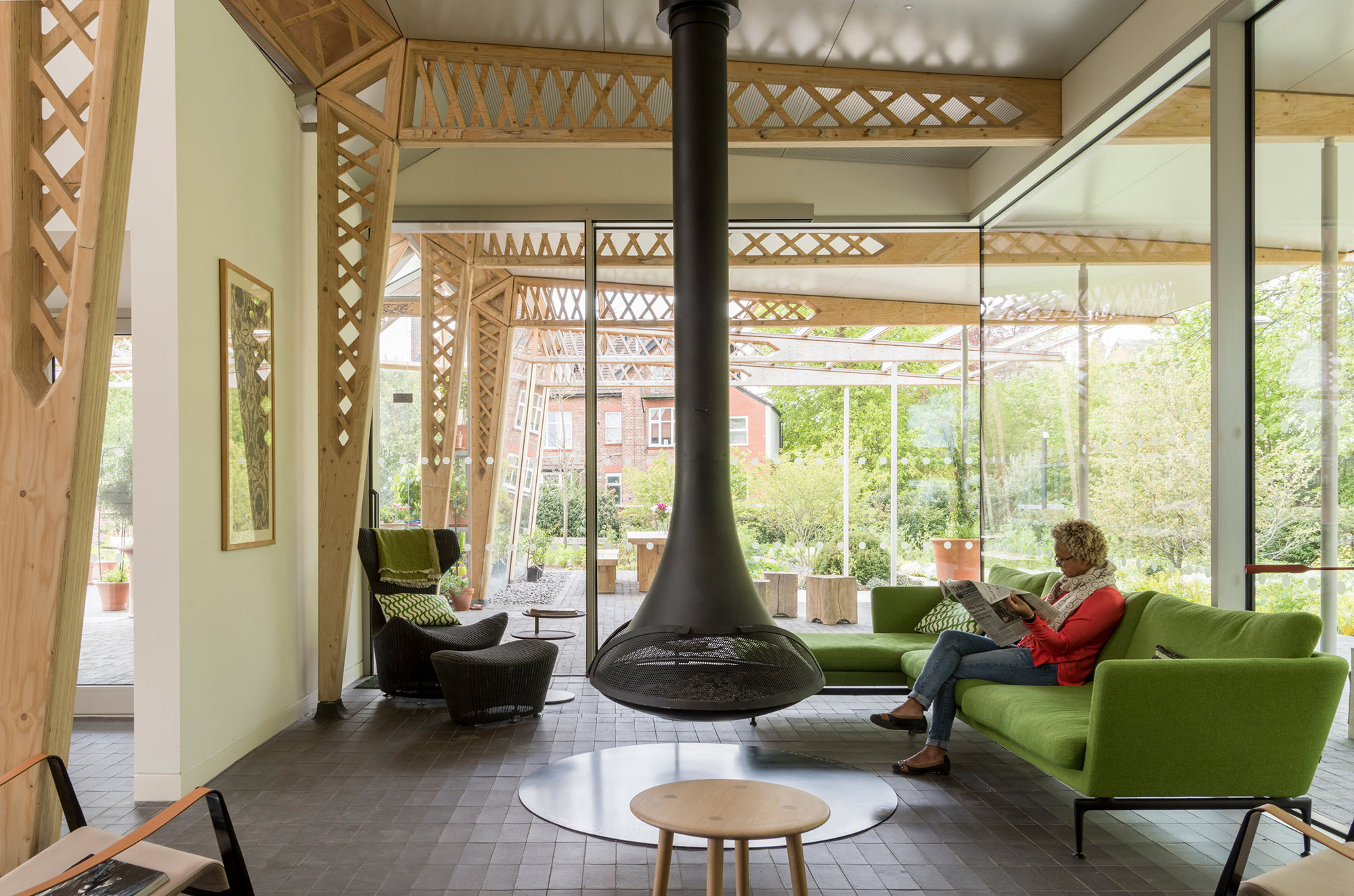 Четкая и адаптируемая система планирования здания делит его на отдельные «кварталы», создавая более интимную и персонализированную атмосферу, которая противостоит стереотипной безликости больничной среды. На каждом этаже также есть «гостиная», предназначенная для посетителей, сопровождающих пациентов, чтобы привнести элемент домашней и социальной безопасности в незнакомую, потенциально стрессовую обстановку. Аналогичные стратегии были приняты в «Maggie’s Manchester» (2018), где люди, страдающие раком, могут найти эмоциональную и практическую поддержку.