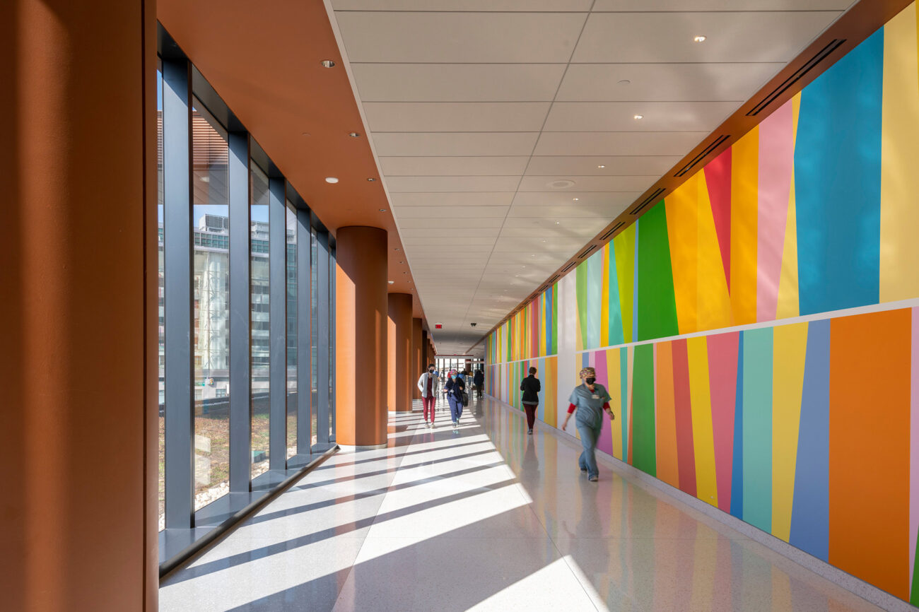 Красочная калейдоскопическая фреска нигерийско-американского художника-абстракциониста Одила Дональда Одиты «Поле и небо» сопровождает пациентов и персонал, когда они проходят по павильону. По словам Одиты, фреска создала «внешнее пространство в интерьере – чтобы создать ощущение, что мы находимся в портале наружу». Обе работы играют с нашим ощущением взаимосвязи тела с внешней средой и просят нас по-новому настроиться на эту взаимосвязь.
