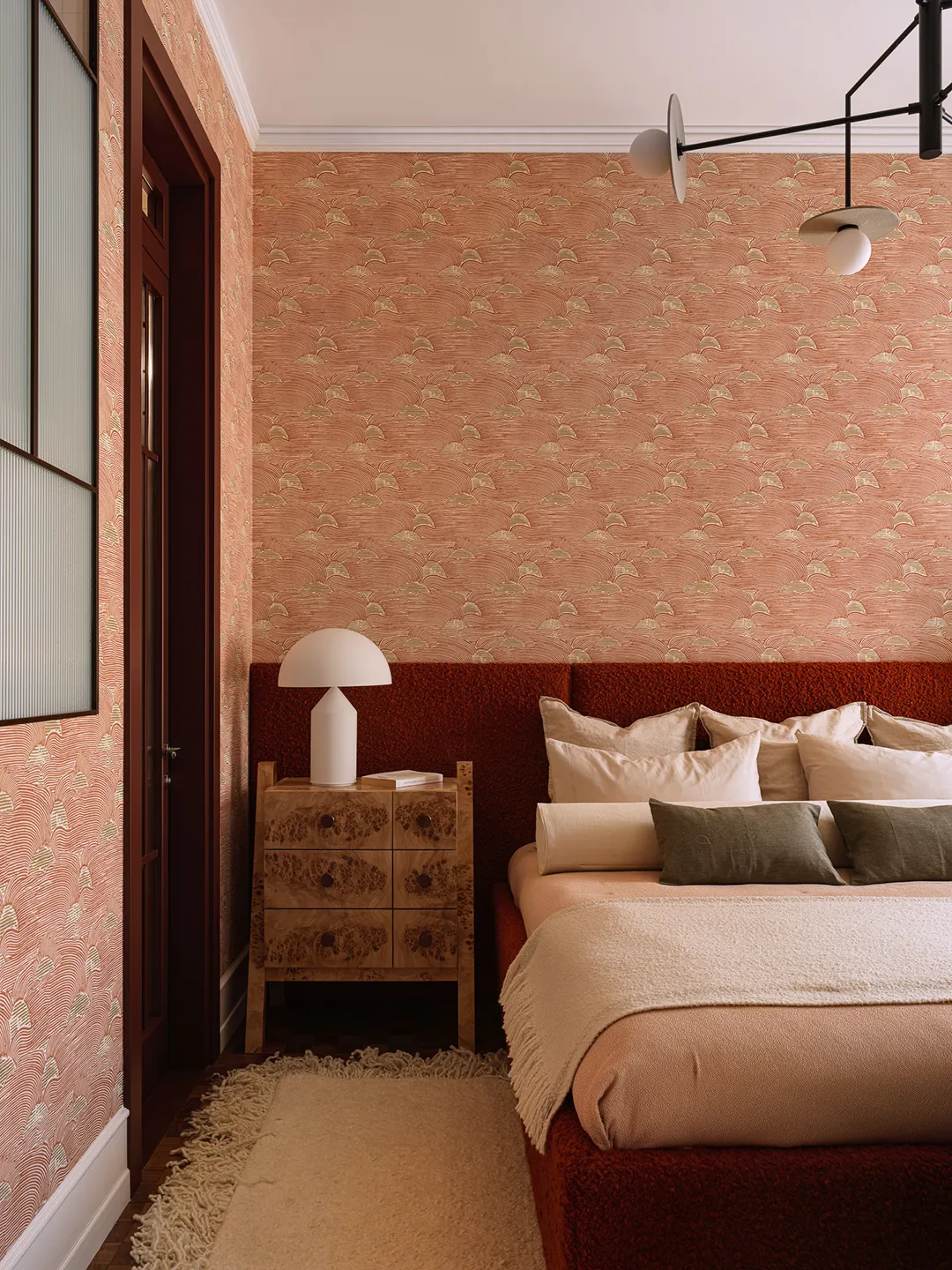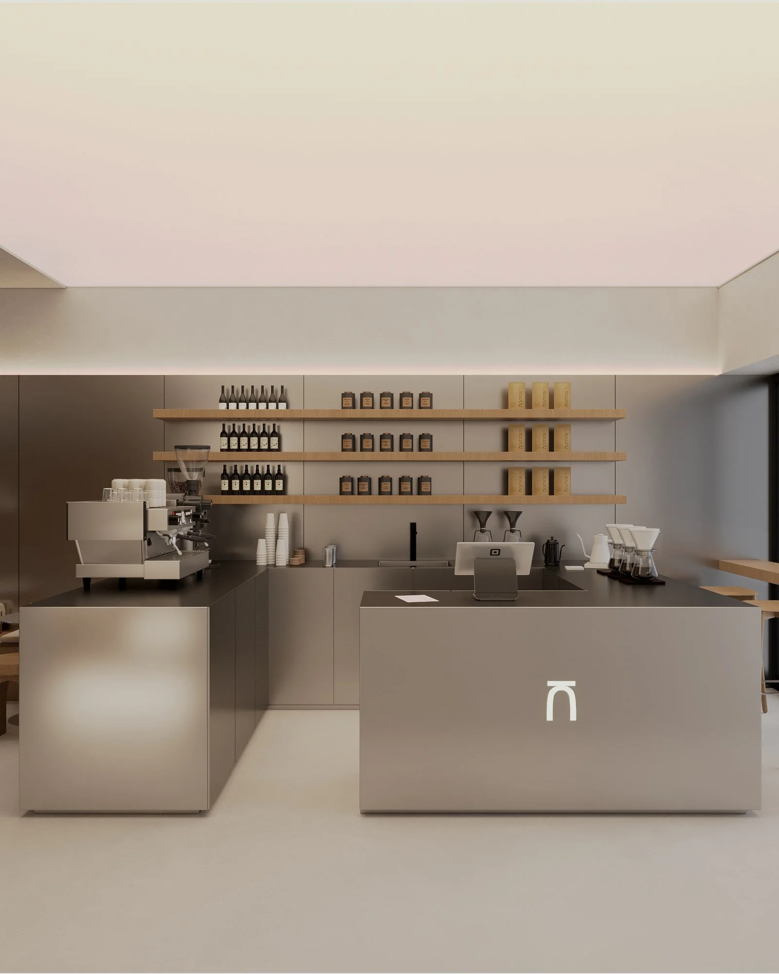 Дизайнеры смело переосмыслили пространство, вдохновляясь классической архитектурой, но переворачивая ее каноны. Перевернутые дорические колонны на потолке заставляют посетителей по-новому взглянуть на привычное. Необычное освещение, созданное нестандартными стальными светильниками, рассеивает свет причудливыми узорами, добавляя глубины и загадочности. Тактильные материалы, такие как известняк и фактурный бетон, создают приземленный контраст с воздушными элементами, а большие шторы позволяют гостям погрузиться в неспешную и уникальную атмосферу N·Tender Bar.