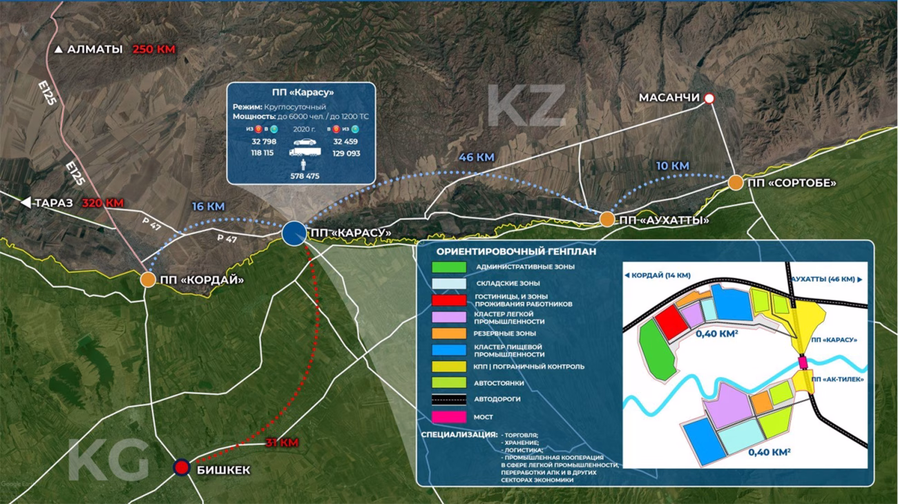 - Функциональное зонирование (Казахстанская часть, Zone A): 100 га под индустриальную зону (производство кабеля, фармацевтики, бетона, солнечных панелей, переработка PET, масложировой комплекс, детское питание).