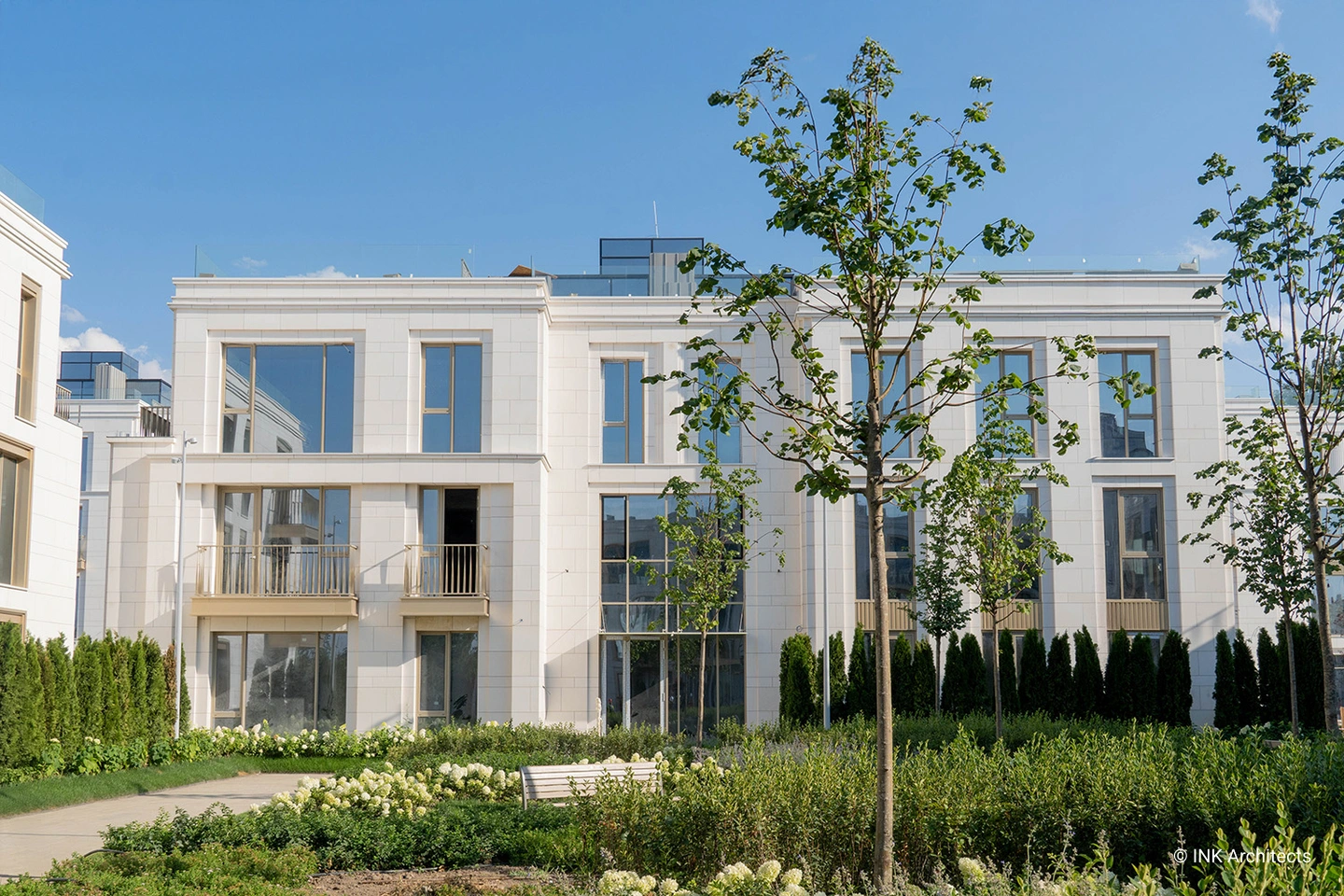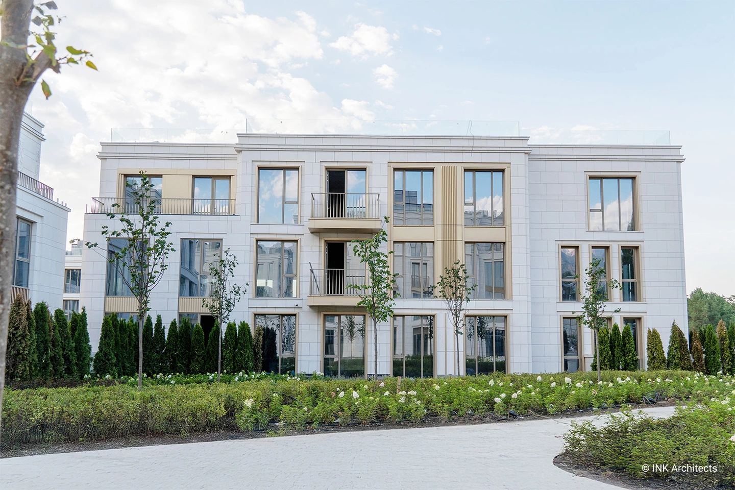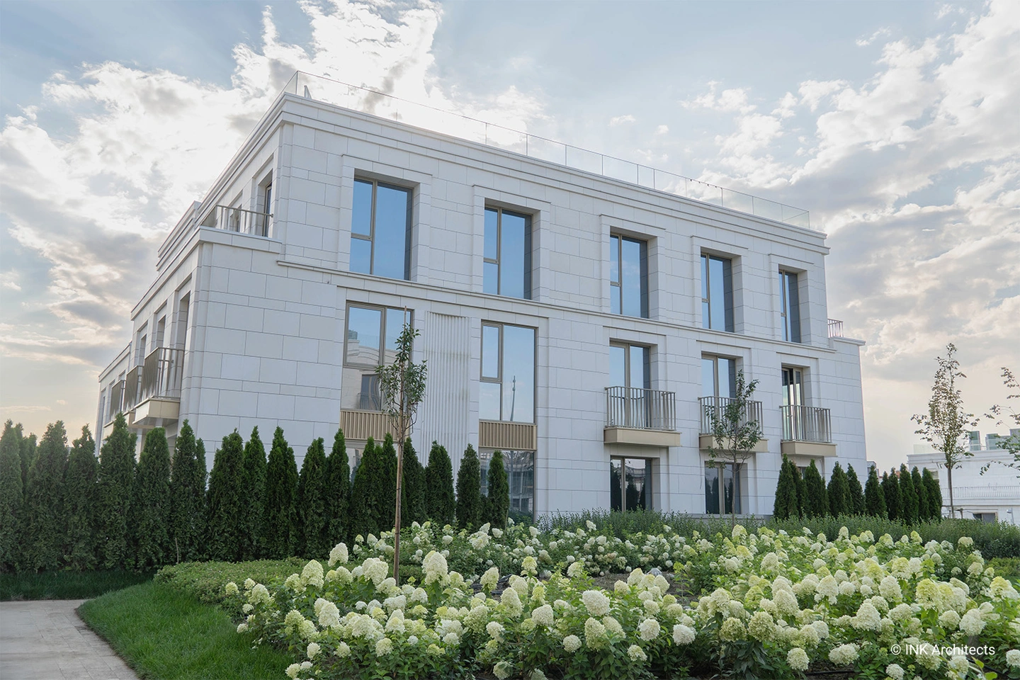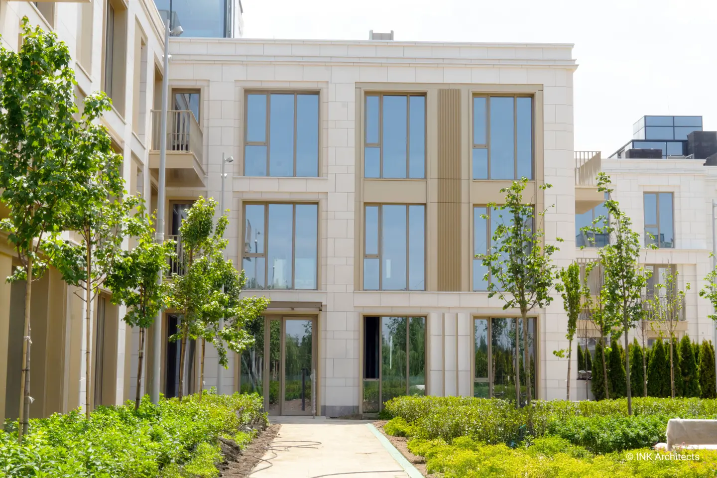 ЖК "Достык 300" (INK Architects) – это 24 трехэтажных блока в Алматы. Проект интегрирован в живописное окружение рек, создавая сильное чувство сообщества через развитую пешеходную инфраструктуру и разнообразные зоны для отдыха.