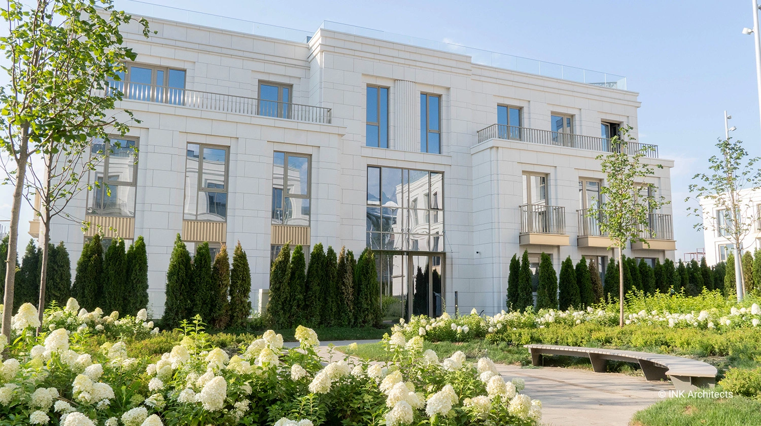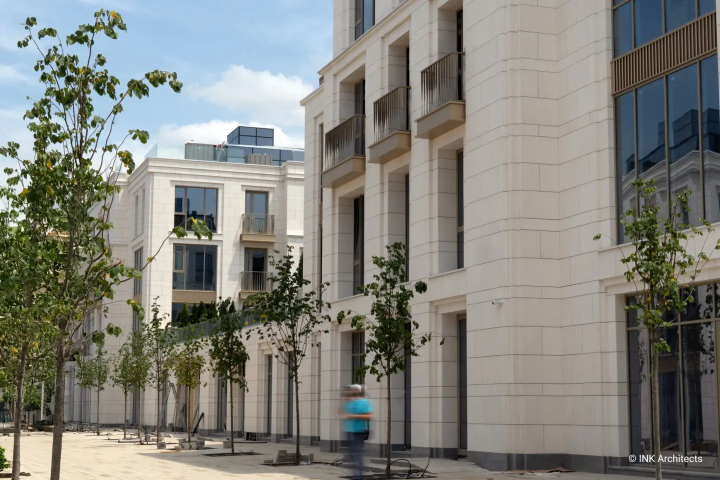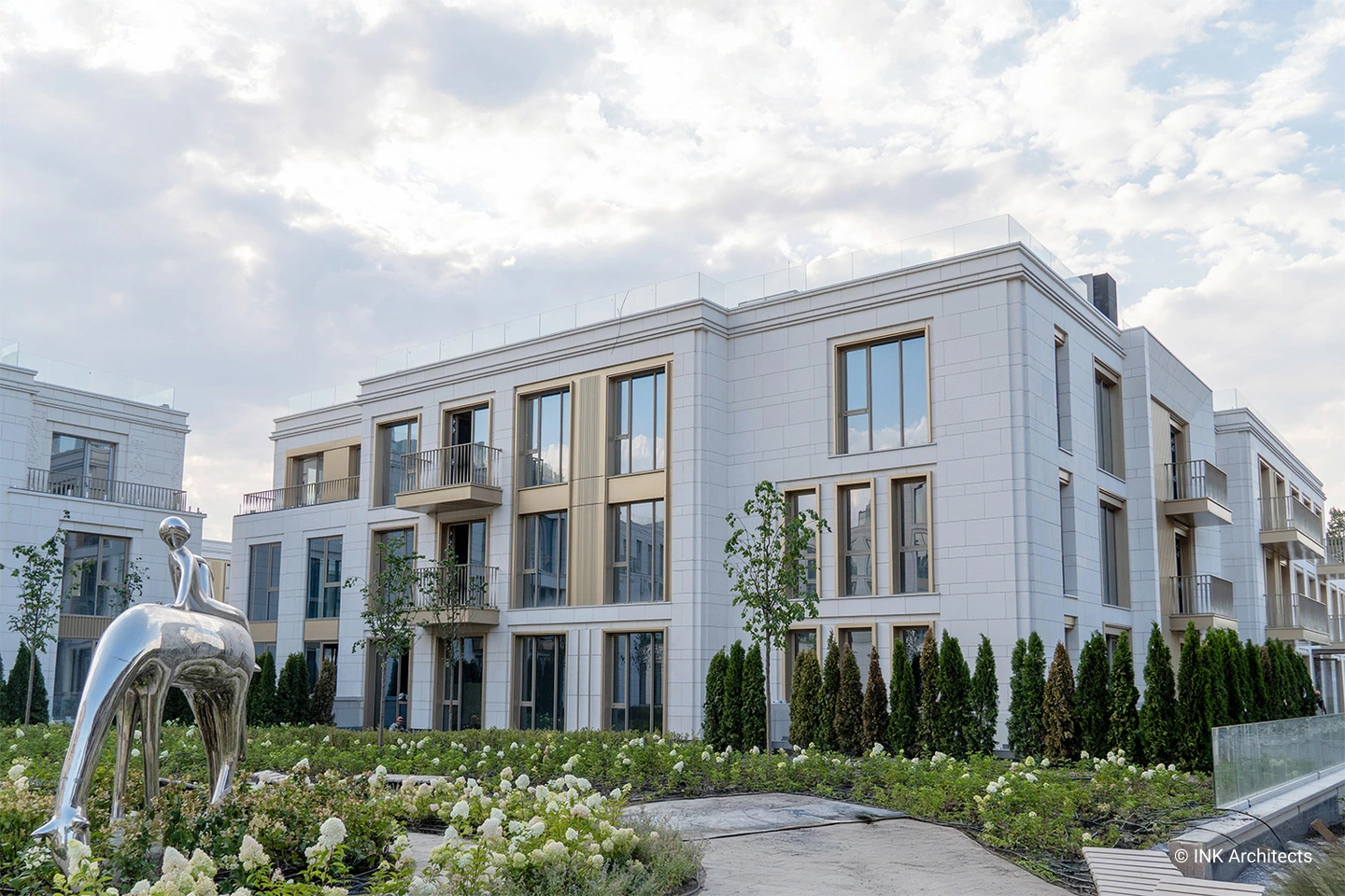 ЖК "Достык 300" (INK Architects) – это 24 трехэтажных блока в Алматы. Проект интегрирован в живописное окружение рек, создавая сильное чувство сообщества через развитую пешеходную инфраструктуру и разнообразные зоны для отдыха.