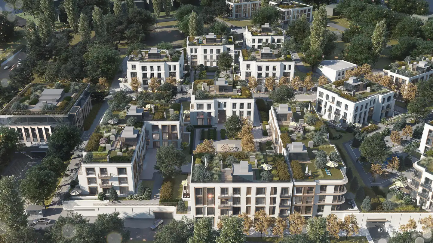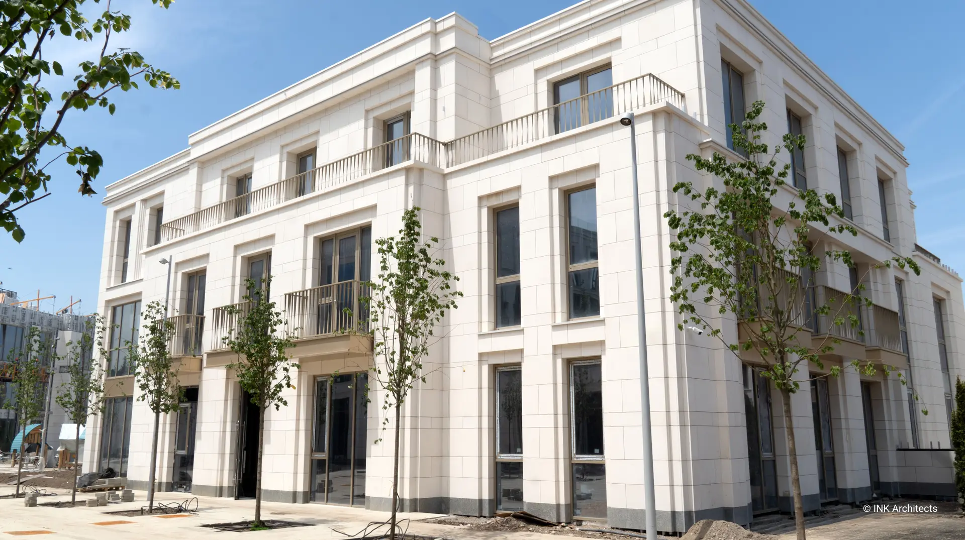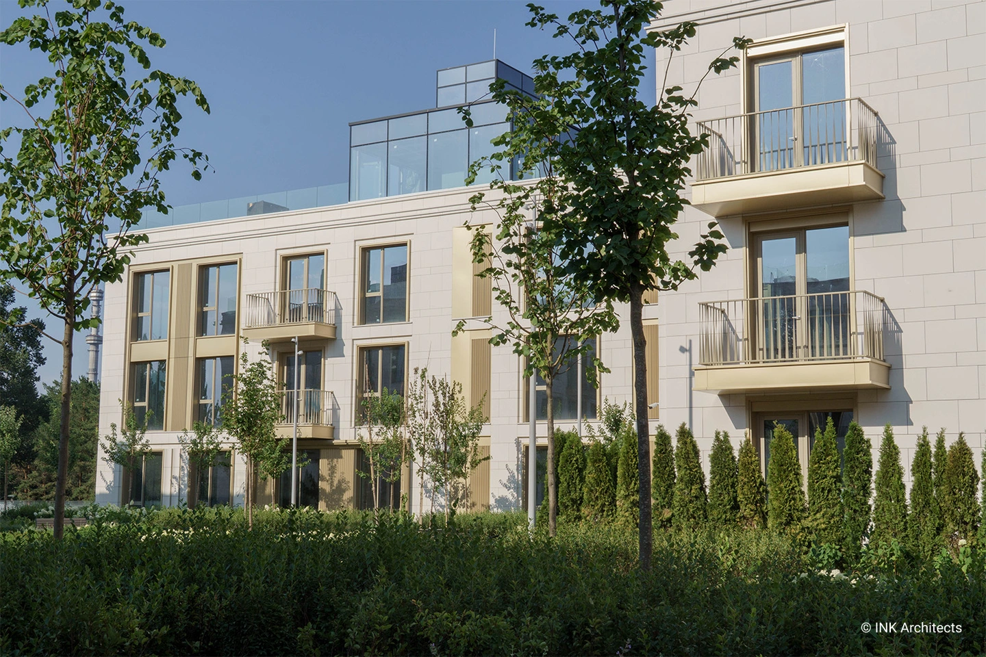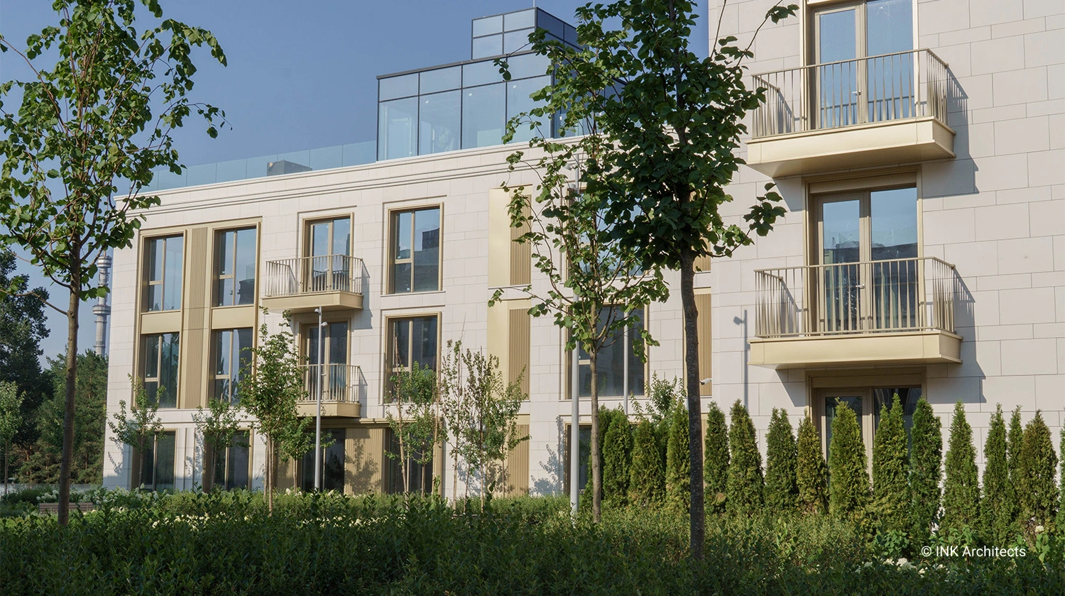 ЖК "Достык 300" (INK Architects) – это 24 трехэтажных блока в Алматы. Проект интегрирован в живописное окружение рек, создавая сильное чувство сообщества через развитую пешеходную инфраструктуру и разнообразные зоны для отдыха.