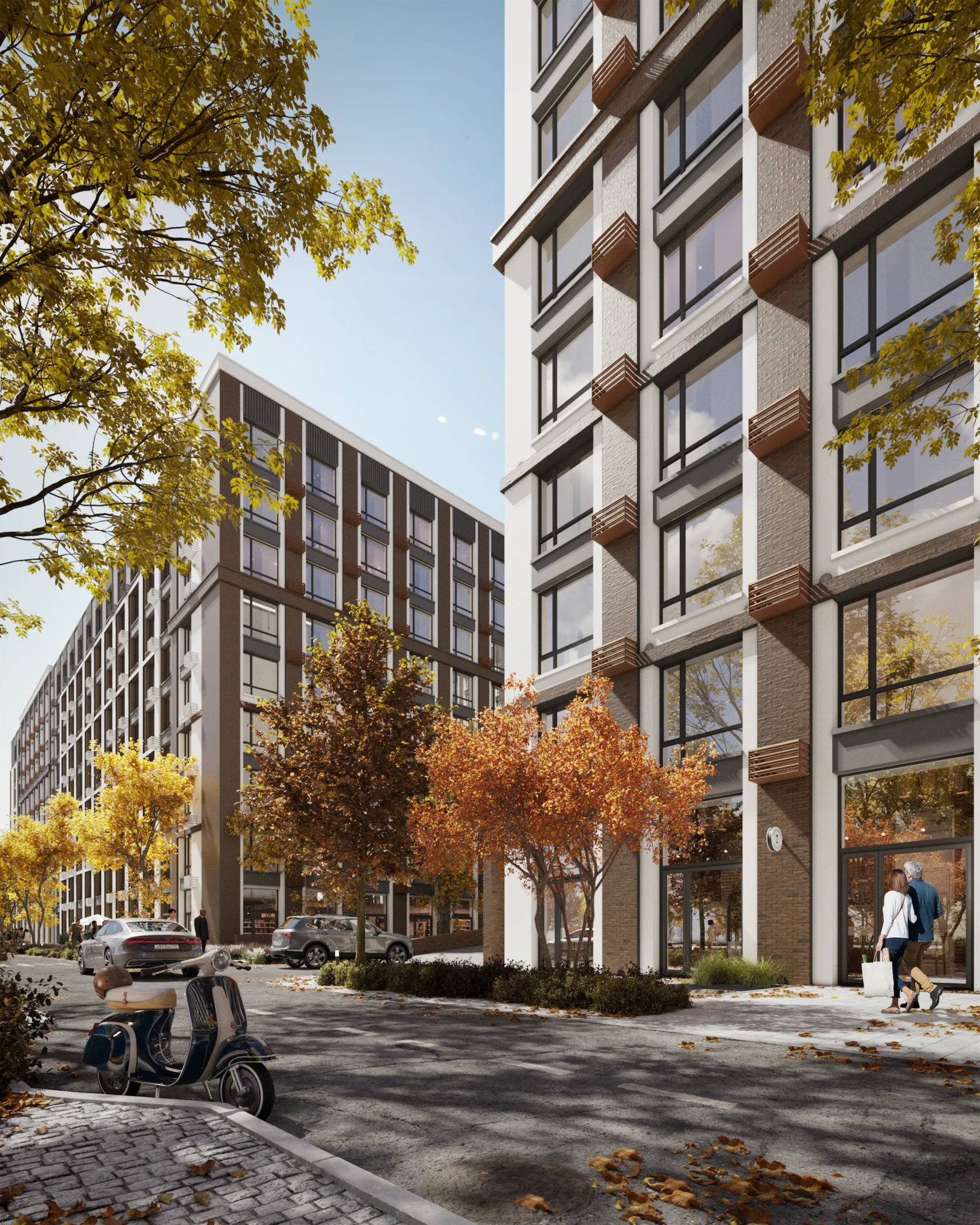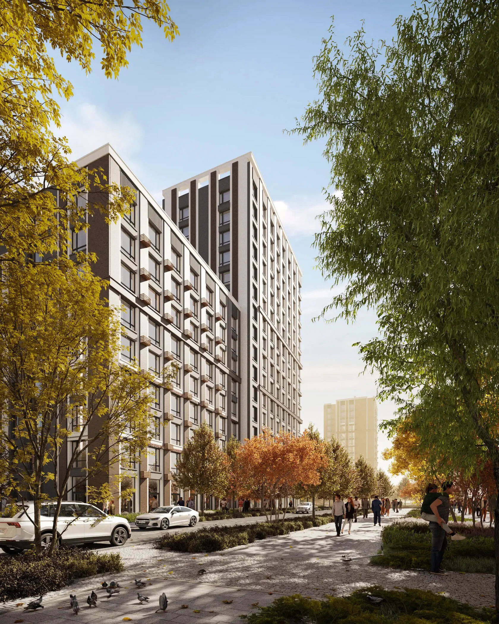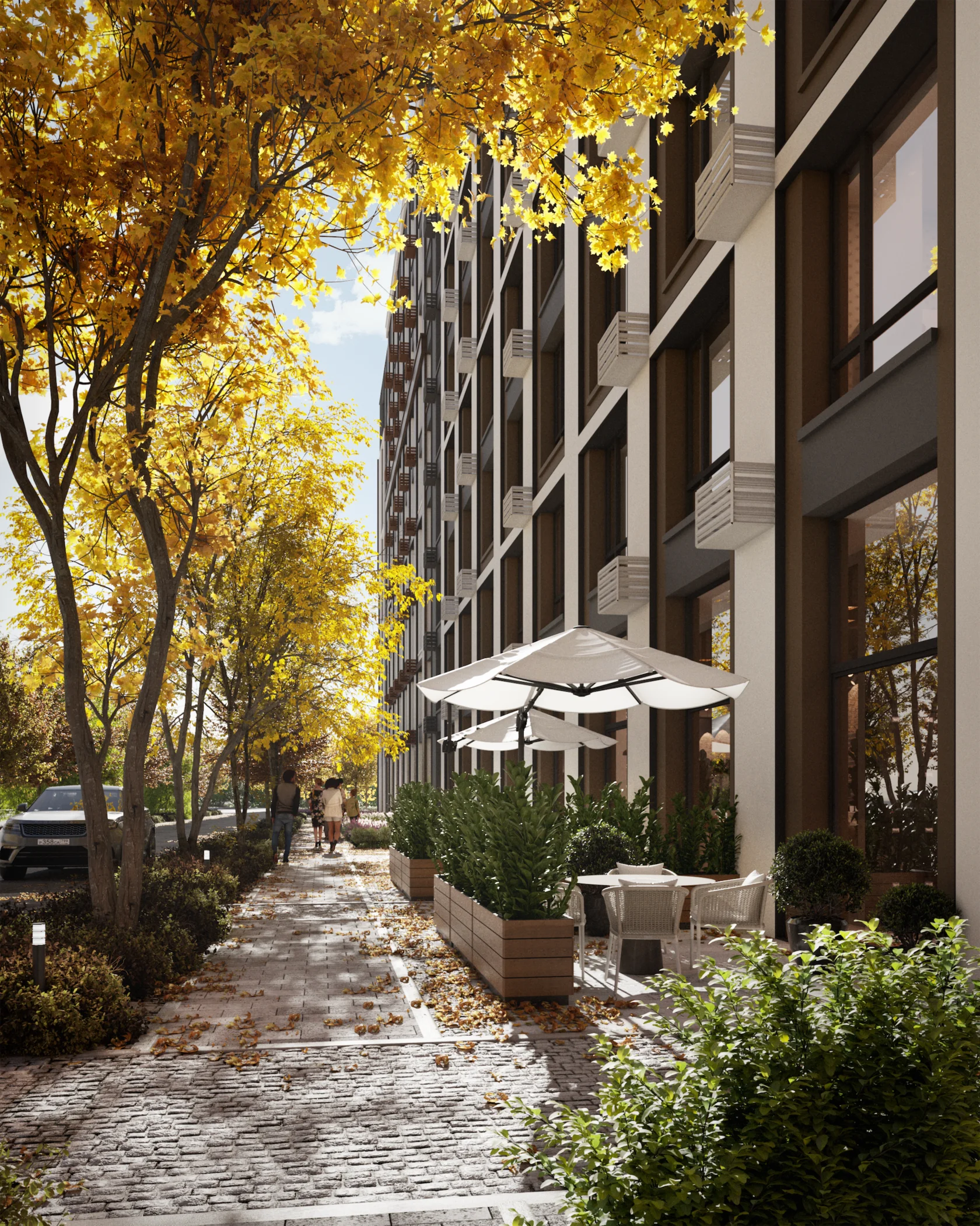Визуализация проекта «Ozen» от Диёры Файзуллаевой (Whila) для BI Group. Фасады отражают ритм жизни, а кафе под балконами собирают разговоры. Улица становится притягательной сценой повседневности, где хочется быть каждый день.