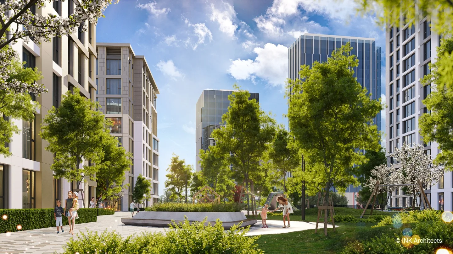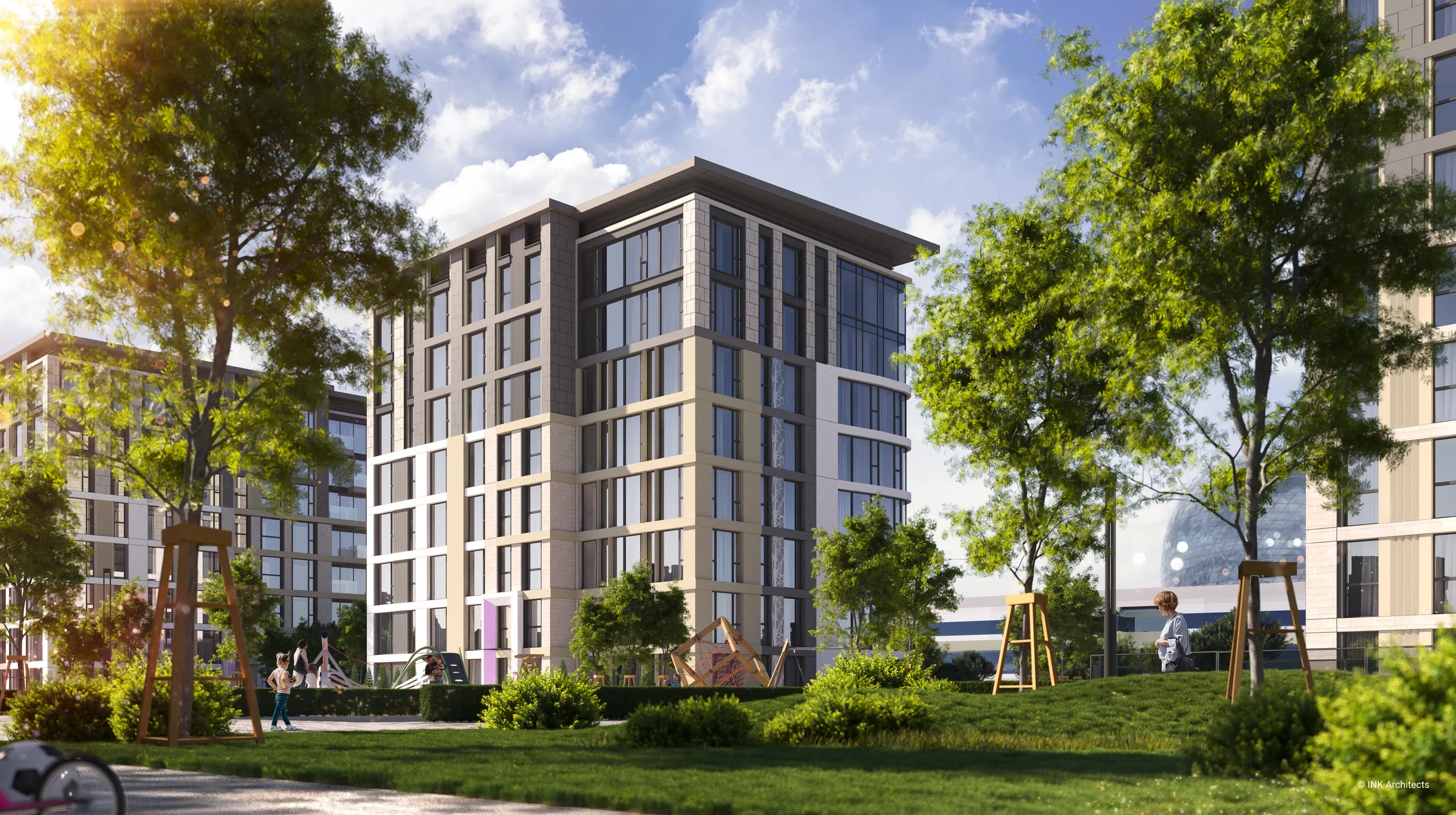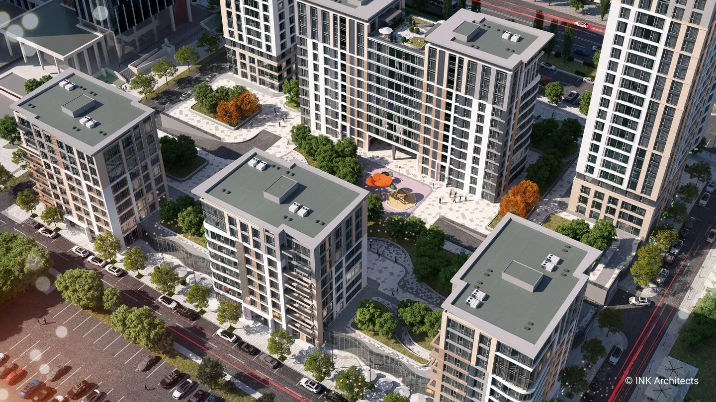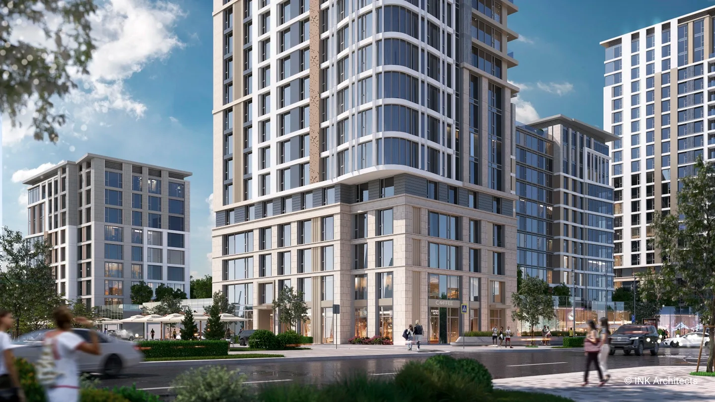 Проект представляет собой современный многоквартирный жилой комплекс, расположенный в живописном и престижном районе столицы — районе Есиль на проспекте Мангилик Ел, в непосредственной близости от места проведения ЭКСПО-2017. Архитектурный ансамбль состоит из семи жилых корпусов переменной этажности — 9, 13 и 22 этажа, — которые создают динамичный и выразительный силуэт. Здания построены по монолитному железобетонному каркасу с современными вентилируемыми фасадами и витражными системами. Особое внимание уделено комфорту жильцов: высокие потолки — 3 метра на стандартных жилых этажах и 3,3 метра на верхних. Комплекс спроектирован с ориентацией на семейное проживание, что отражено в структуре квартир: почти 92% квартир — это просторные 3- и 4-комнатные квартиры. Для удобства автовладельцев предусмотрен вместительный паркинг на 461 место, что значительно превышает требуемые 318 мест. Внутренняя территория комплекса продуманно спроектирована для отдыха и досуга. Более половины участка отведено под озеленение, общая площадь озеленения составляет 10 996,1 м². Проект предусматривает обширную инфраструктуру, включая детские игровые площадки, спортивные площадки и зоны отдыха для жителей.