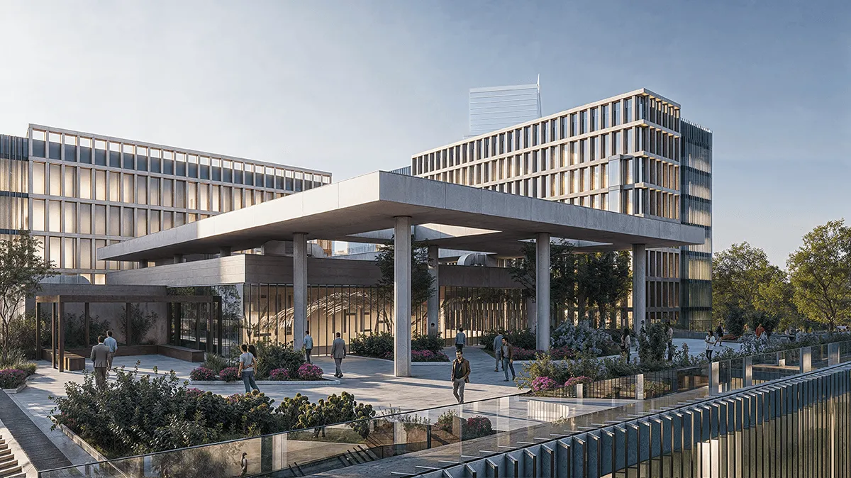 <div class="description">В сердце Алматы, на фоне заснеженных вершин Заилийского Алатау, раскинулся кампус КазНУ — построенное воплощение знаний и мудрости, где современные формы сливаются с местным контекстом и историческим наследием. Главное здание кампуса представляет собой строгую и ритмичную вертикальную композицию, с фасадами, которые играют со светом и тенью благодаря использованию тонких металлических жалюзи. Соседние здания продолжают этот архитектурный язык: горизонтально вытянутые объемы с дисциплинированными, ритмичными фасадами и выбором материалов, которые передают легкость и прозрачность идей, текущих внутри. Вместе кампус образует целостную систему общественных пространств, где традиционные лекционные аудитории и исследовательские лаборатории переплетаются с открытыми террасами, библиотеками и коворкингами. Кампус КазНУ — это пространство смысла — каждое здание говорит на языке науки, культуры и времени. Здесь архитектура становится проводником идей, связывая прошлое, настоящее и будущее. Его формы резонируют с духом исследования, всегда стремясь к горизонту новых открытий.</div>