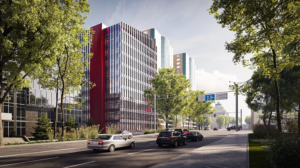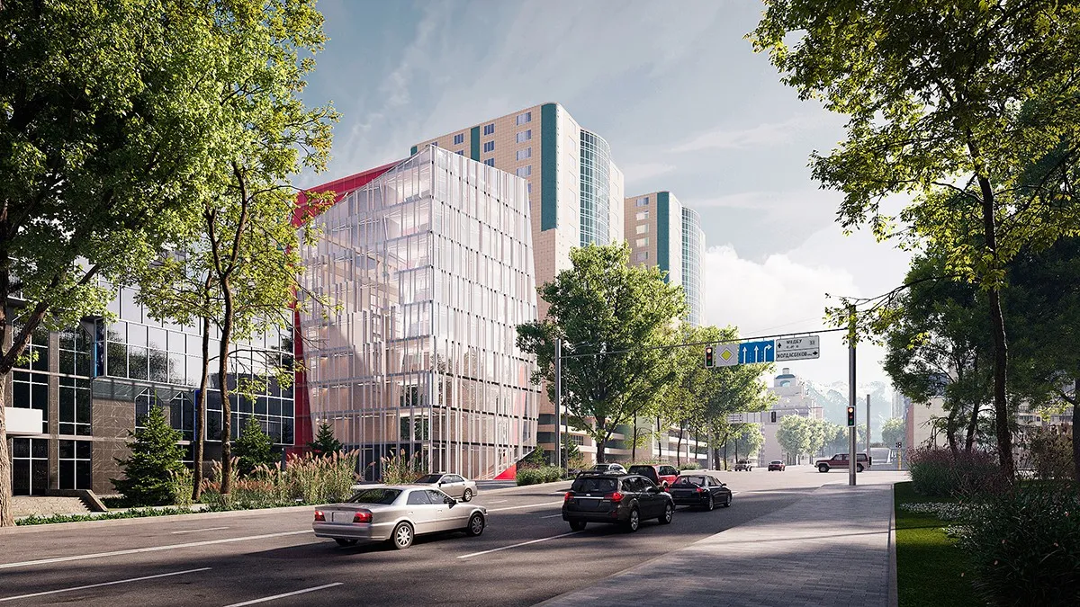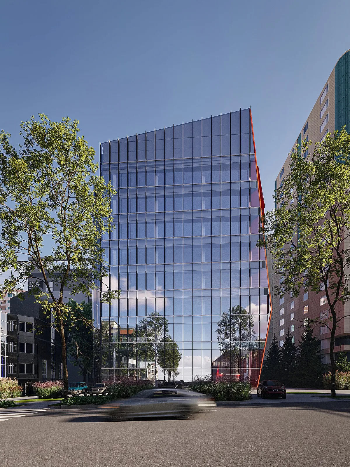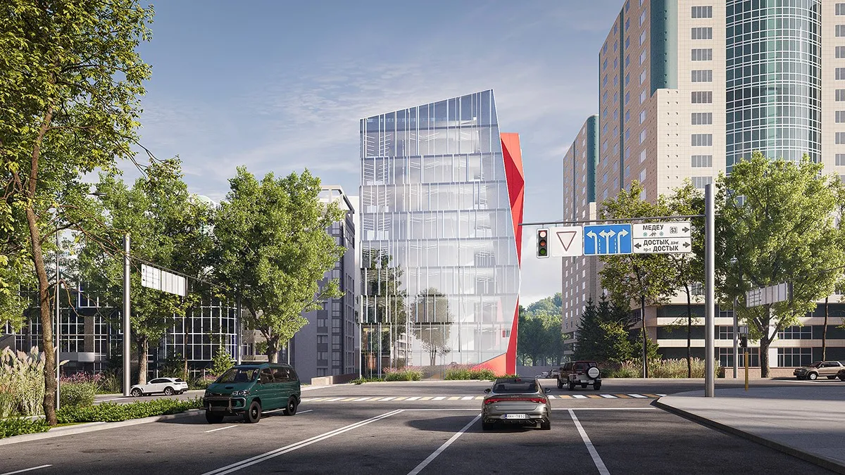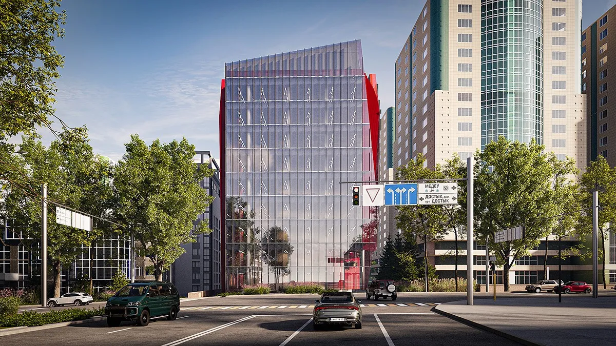 <div class="description">Форма здания напоминает натянутую струну — напряженную, динамичную, готовую резонировать. Нежный наклон фасада создает иллюзию движения, как будто структура готова шагнуть вперед. Визуально живая, она меняется в течение дня, трансформируясь с изменением света и перспективы. Главный фасад — это прозрачный экран, за которым разворачивается спектакль света и тени. Днем он отражает город, растворяя границу между интерьером и экстерьером; ночью он становится светящимся кристаллом, раскрывающим внутреннюю структуру здания. Лестницы и линейные светильники внутри создают ритм — замороженная энергия в вечном движении. Но истинная страсть Hayat заключается в его боковых фасадах. Яркие красные металлические плоскости резко контрастируют со стеклянным фасадом, как смелый акцент в тщательно подобранной композиции. Они, кажется, разрезают гладкую поверхность здания, обнажая его скрытую силу. Этот цвет не просто декоративен — он является символом внутренней интенсивности, динамичности и бескомпромиссной природы архитектуры. Внутри Hayat создан для работы, но не отказывает в вдохновении. Лобби — с его глянцевыми поверхностями, художественными деталями и хореографическим освещением — больше похоже на художественную галерею, чем на обычный офис. Здесь каждый элемент — от выбора материалов до освещения — говорит о страсти к качеству и эстетике.</div>