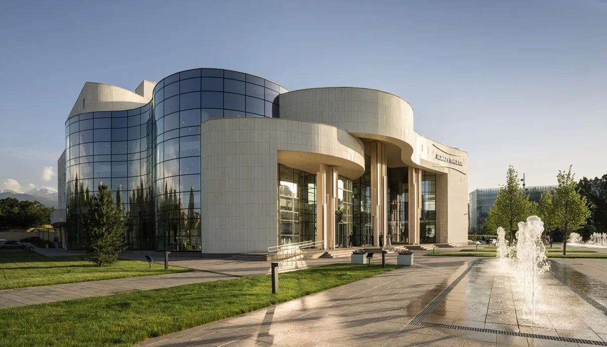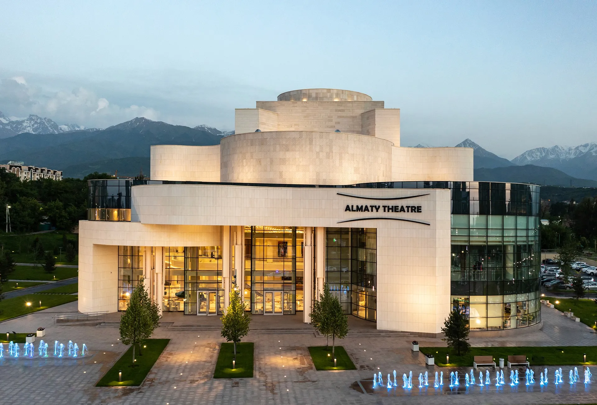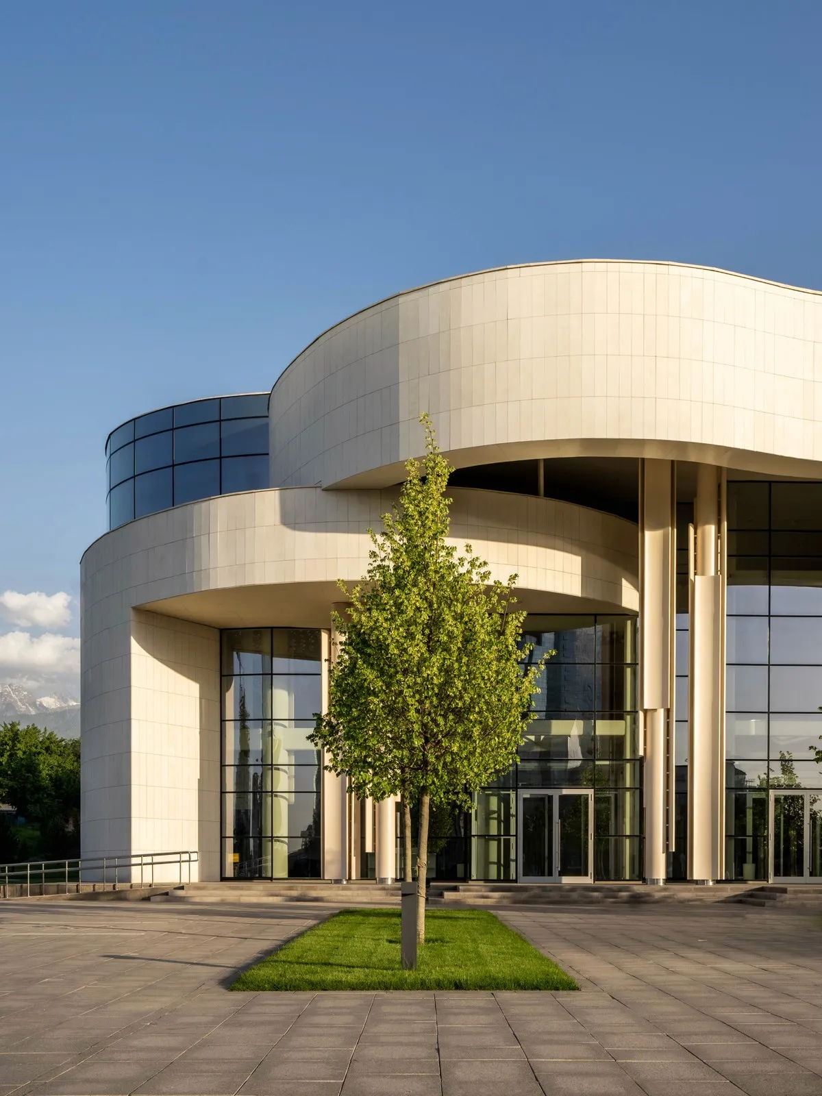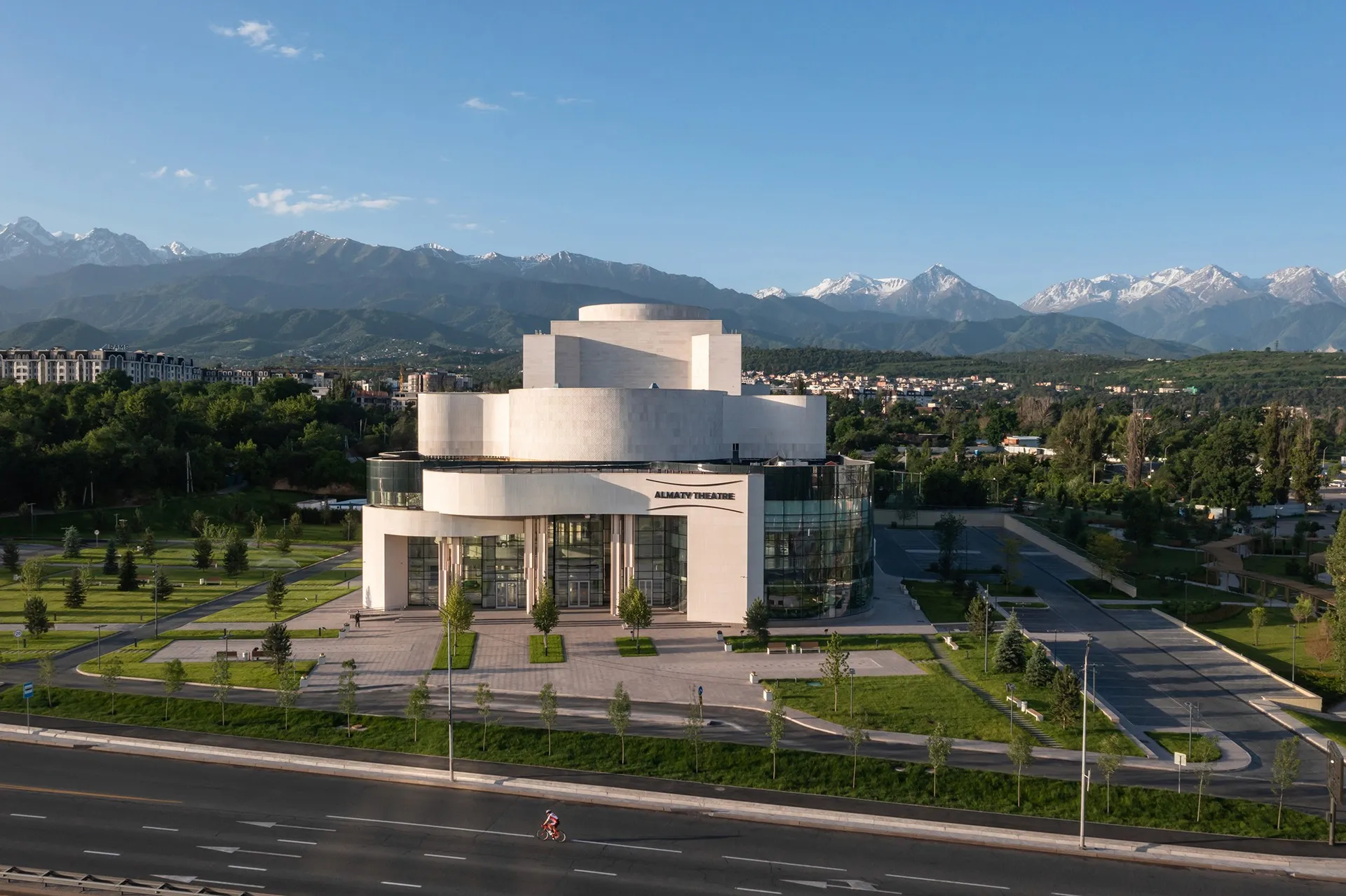 <div class="description">Здание театра представляет собой композицию текучих, многослойных объемов, грациозно интегрированных в природный предгорный ландшафт Заилийского Алатау. Его архитектурный язык сочетает монументальность с прозрачностью. Белые каменные фасады придают структуре скульптурное присутствие, в то время как обширные стеклянные поверхности создают диалог между интерьером и окружением, растворяя границу между архитектурой и ландшафтом. Форма здания отражает динамику балета: волнообразные линии, напоминающие развевающиеся сценические костюмы, вызывают ощущение непрерывного движения. Входная зона — с элегантными колоннами и выступающим навесом — приглашает посетителей в мир искусства, в то время как изогнутые стеклянные фасады размывают границу между внутренним и внешним пространством.</div>