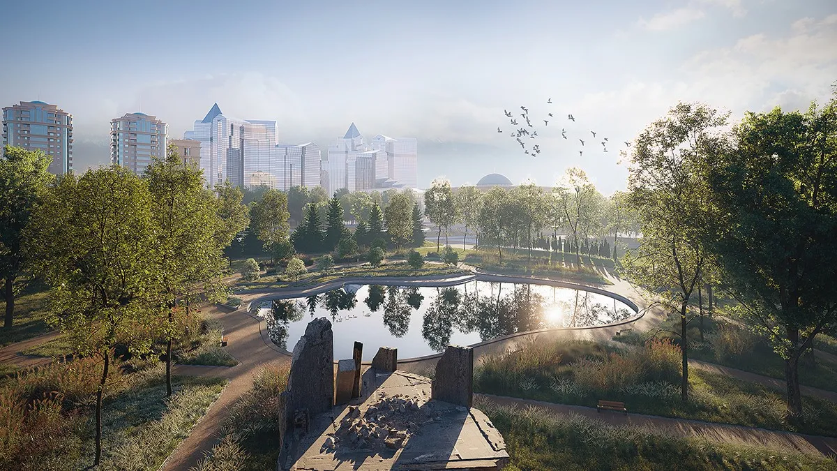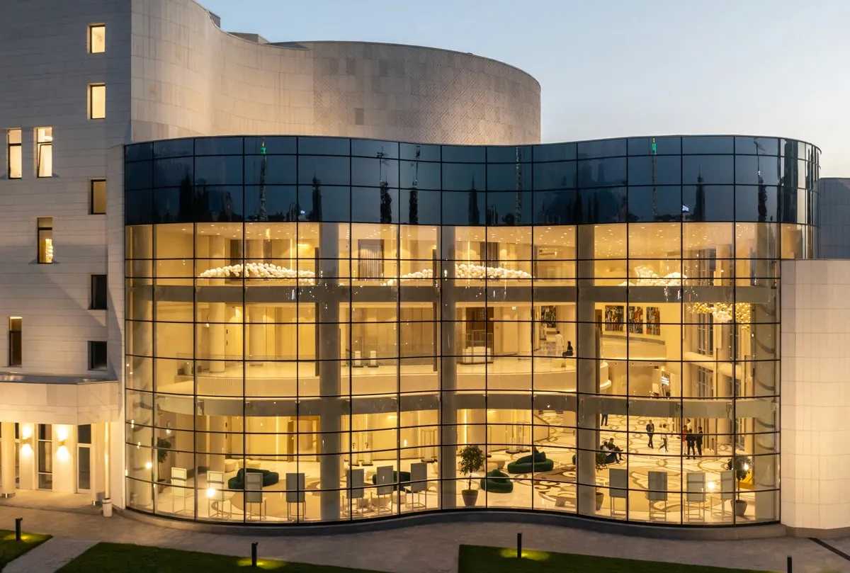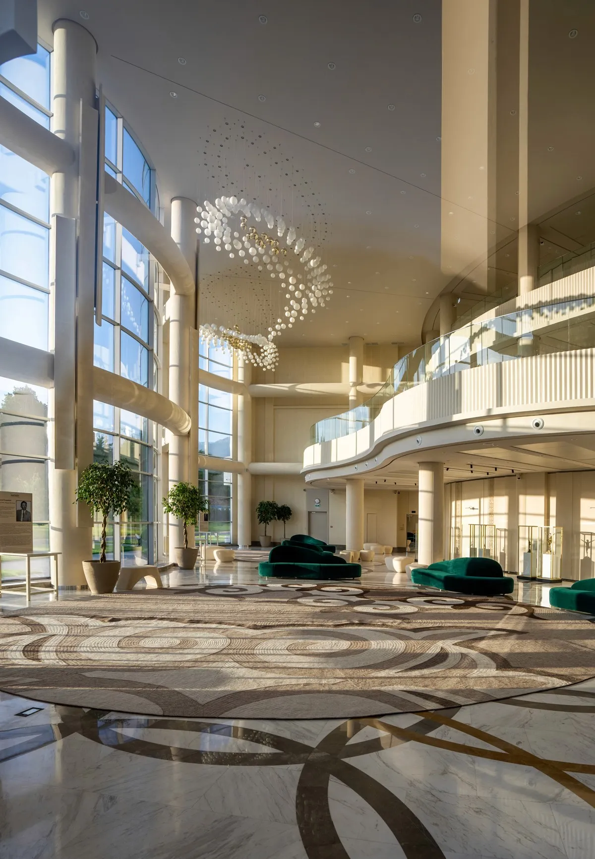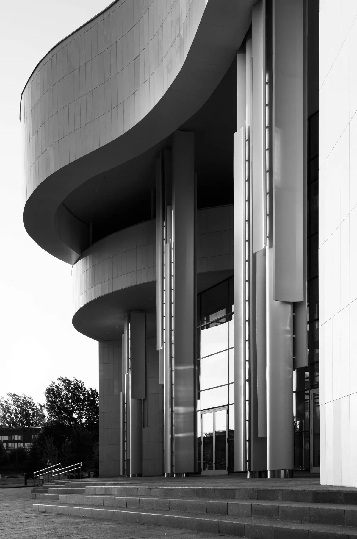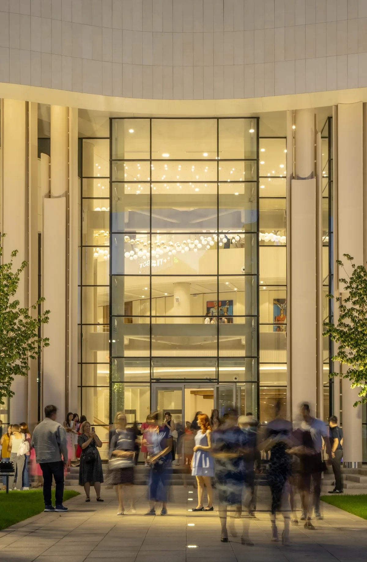 <div class="description">Здание театра представляет собой композицию текучих, многослойных объемов, грациозно интегрированных в природный предгорный ландшафт Заилийского Алатау. Его архитектурный язык сочетает монументальность с прозрачностью. Белые каменные фасады придают структуре скульптурное присутствие, в то время как обширные стеклянные поверхности создают диалог между интерьером и окружением, растворяя границу между архитектурой и ландшафтом. Форма здания отражает динамику балета: волнообразные линии, напоминающие развевающиеся сценические костюмы, вызывают ощущение непрерывного движения. Входная зона — с элегантными колоннами и выступающим навесом — приглашает посетителей в мир искусства, в то время как изогнутые стеклянные фасады размывают границу между внутренним и внешним пространством.</div>