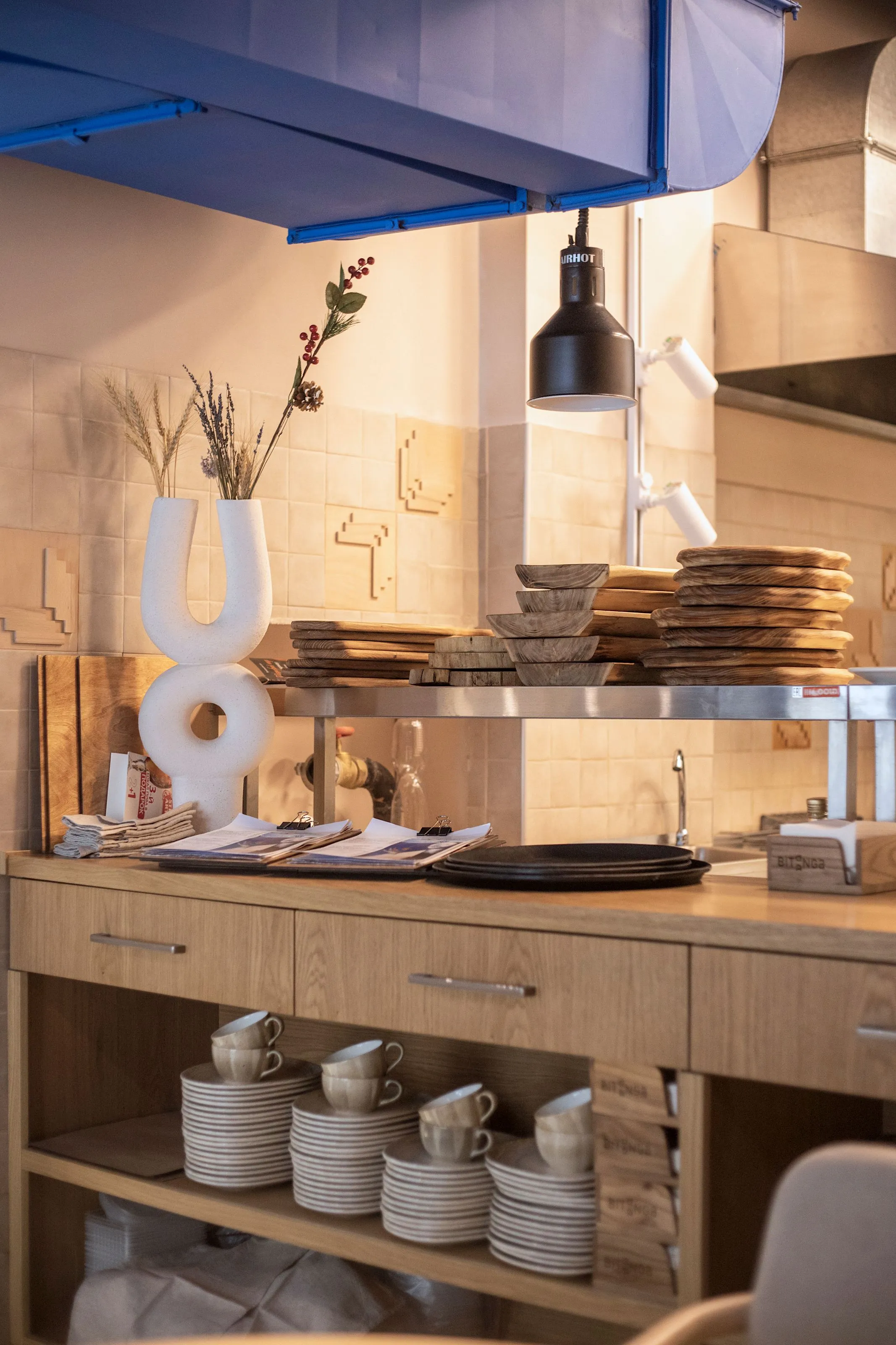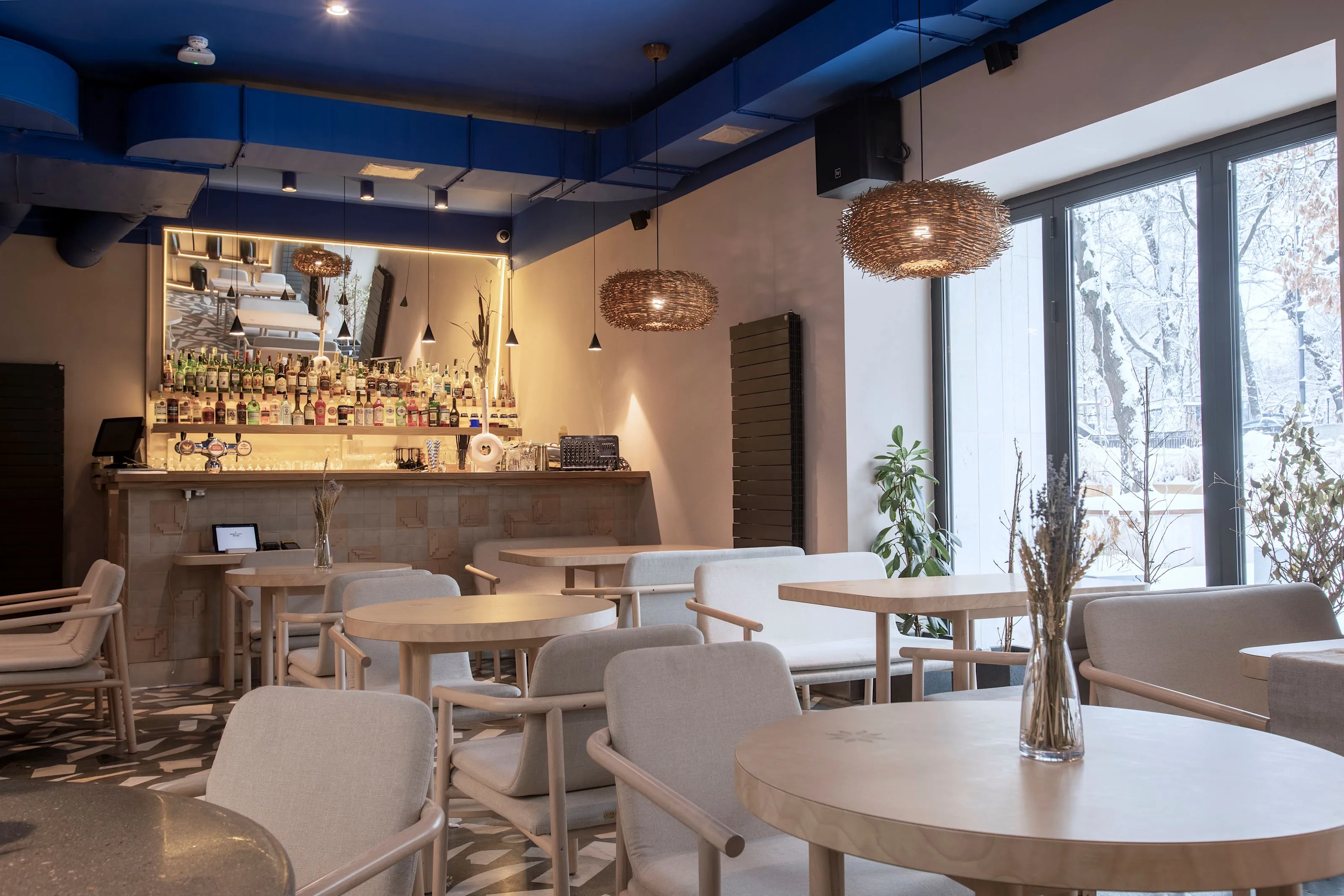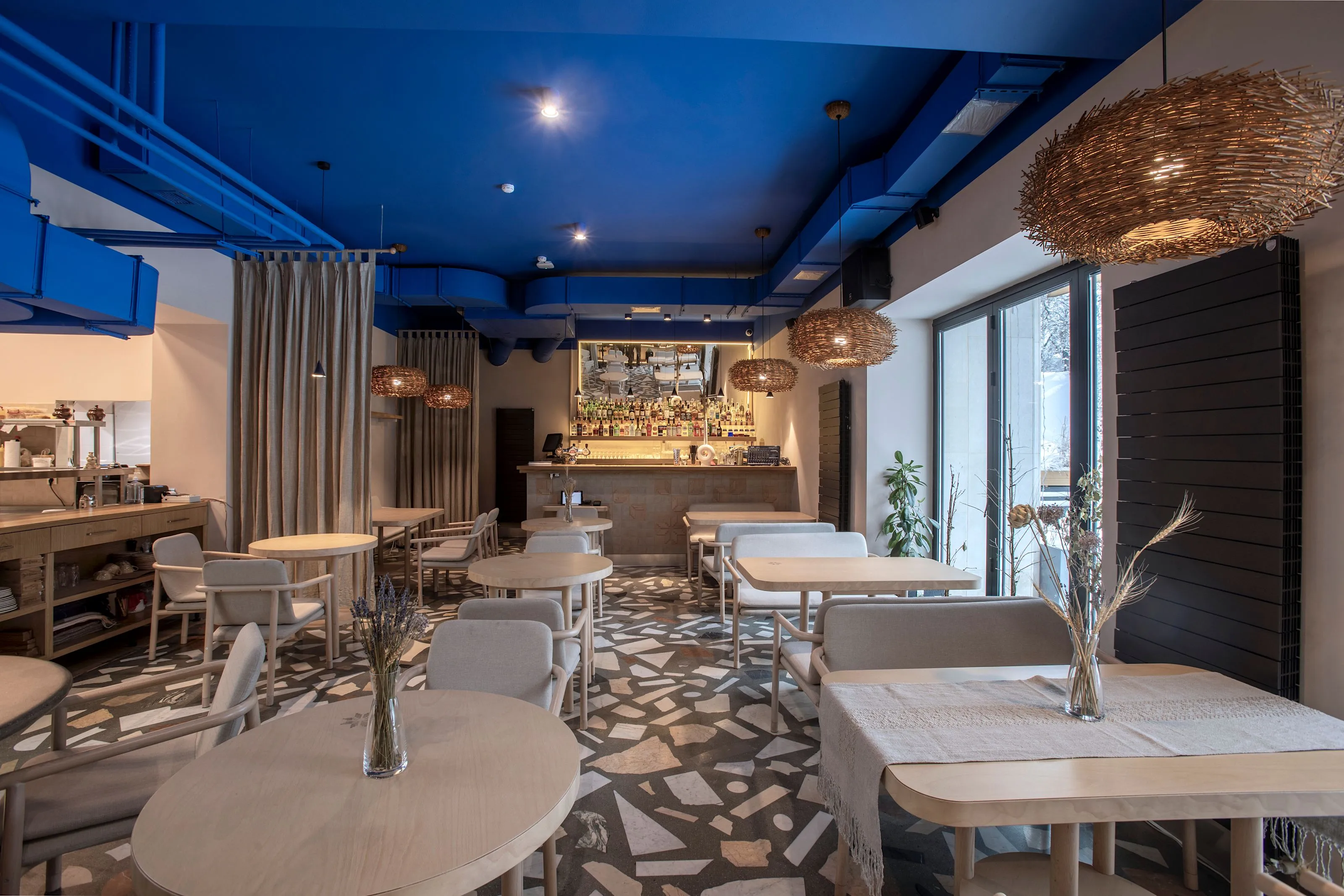 <div class="description">Концептуально главная идея заключалась в том, чтобы использовать неожиданный подход к интерпретации национальной культуры в интерьере. Мы изначально решили не использовать прямые этнические цитаты, не использовать много орнаментации, не использовать откровенно традиционные формы, не делать это 'в лоб'. Вместо этого мы хотели передать атмосферу через материалы, цвета и естественность. Голубой потолок явно символизирует небо, но также является цветом символов Украины. Основные цвета и материалы на уровне глаз естественные, степные, каменистые. Мы все же использовали некоторые символы: люстры ассоциируются с гнездами аистов, которые являются любимыми птицами в Украине. А минималистичный орнамент на настенных плитках и столах — это лист каштана, символ Киева. Что касается опыта посетителей, то это спокойные монохромные цвета: стол, скатерть, посуда, стены, текстиль и декор позволяют не отвлекаться от главной цели места — еды, напитков и общения.</div>