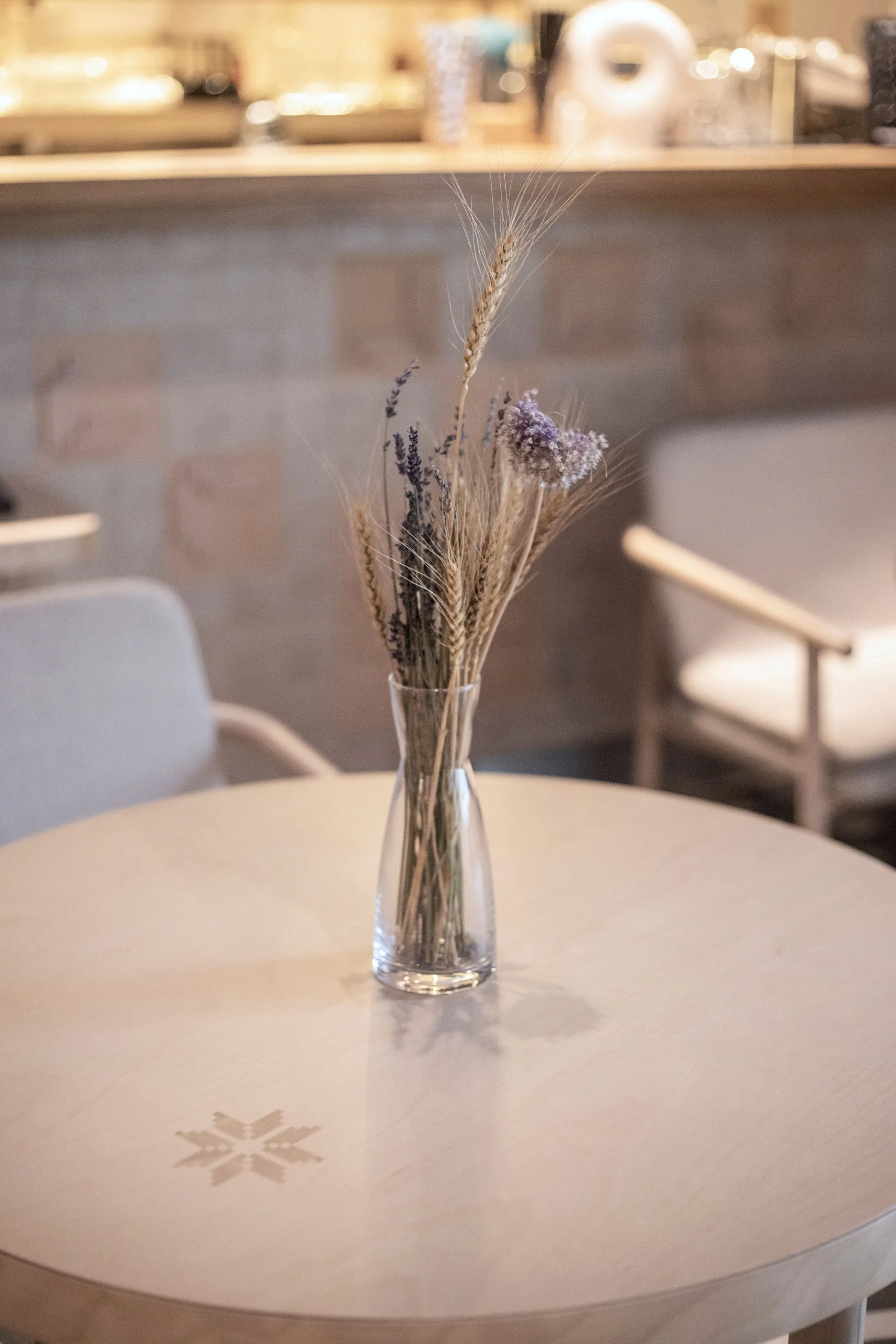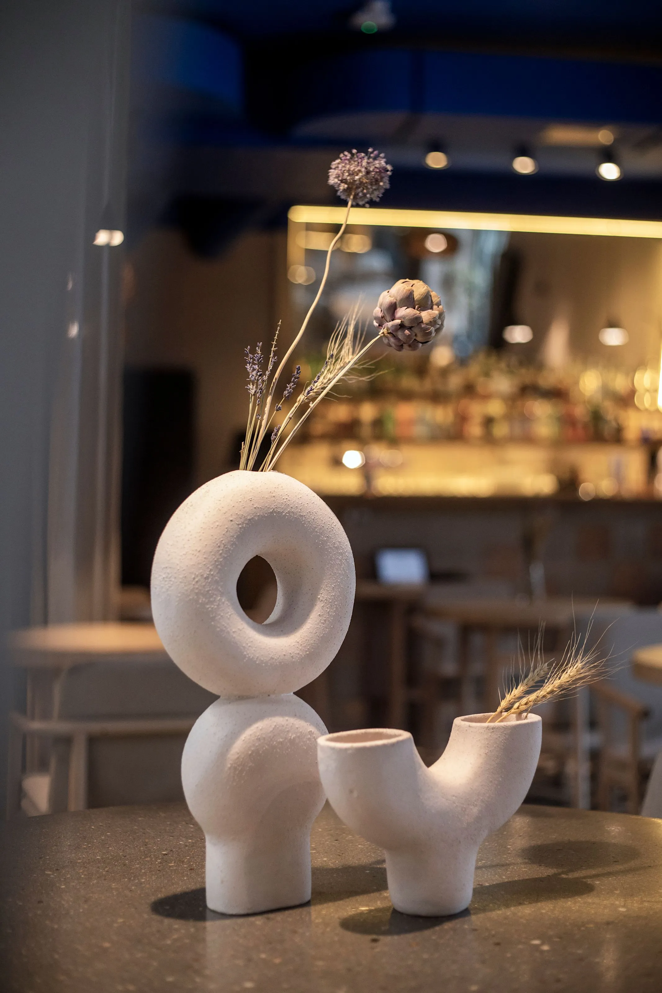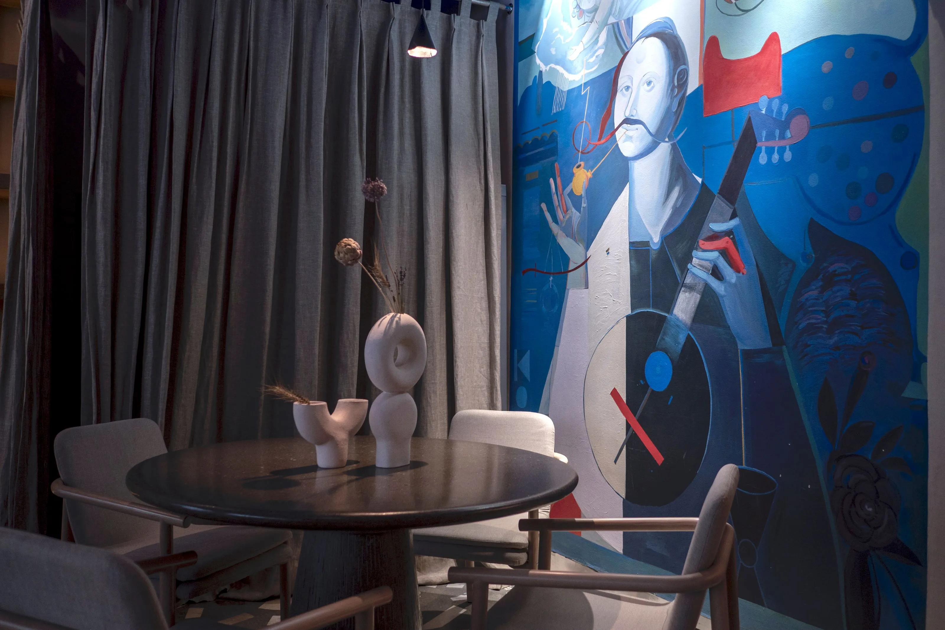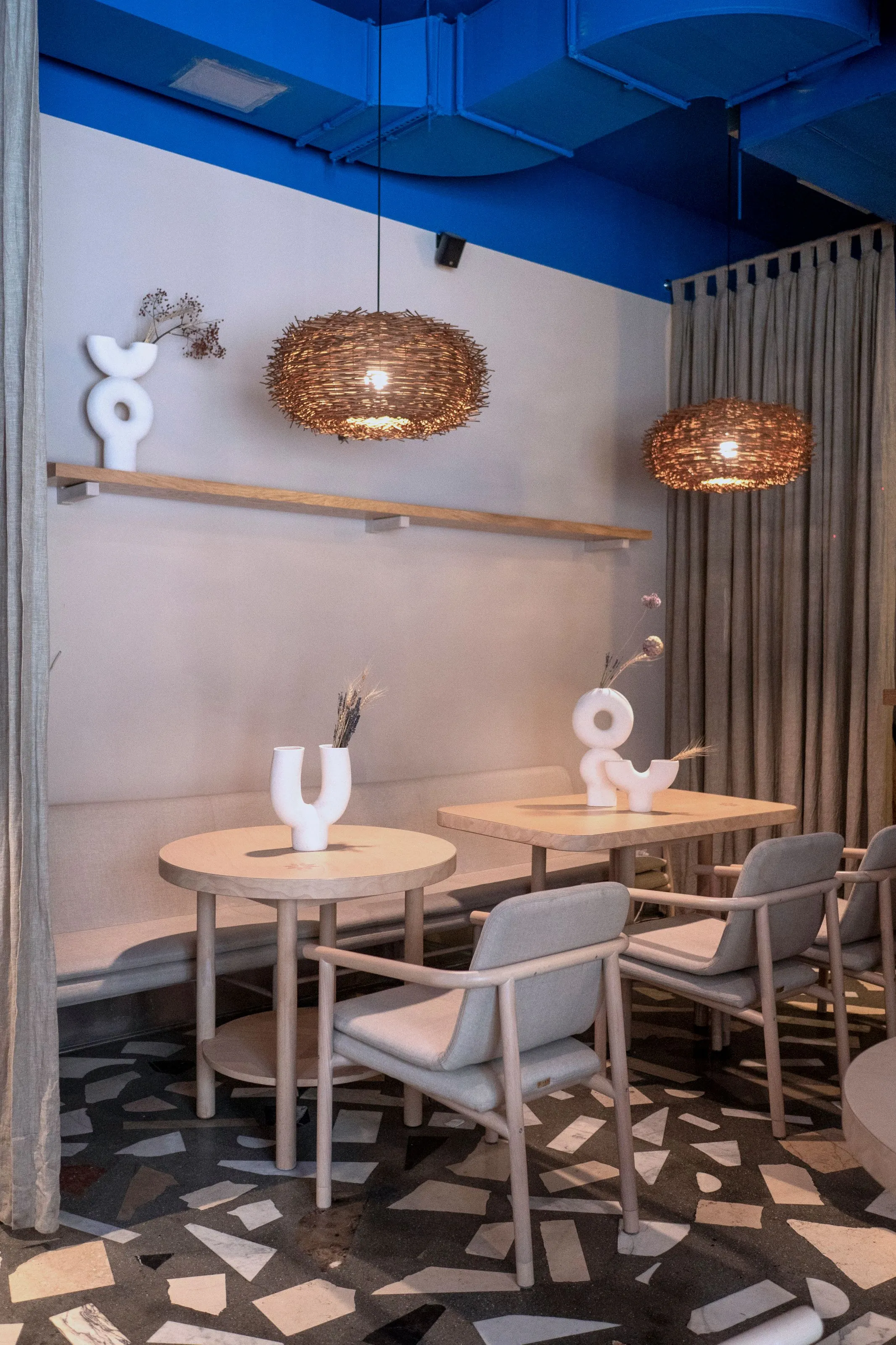<div class="description">Концептуально главная идея заключалась в том, чтобы использовать неожиданный подход к интерпретации национальной культуры в интерьере. Мы изначально решили не использовать прямые этнические цитаты, не использовать много орнаментации, не использовать откровенно традиционные формы, не делать это 'в лоб'. Вместо этого мы хотели передать атмосферу через материалы, цвета и естественность. Голубой потолок явно символизирует небо, но также является цветом символов Украины. Основные цвета и материалы на уровне глаз естественные, степные, каменистые. Мы все же использовали некоторые символы: люстры ассоциируются с гнездами аистов, которые являются любимыми птицами в Украине. А минималистичный орнамент на настенных плитках и столах — это лист каштана, символ Киева. Что касается опыта посетителей, то это спокойные монохромные цвета: стол, скатерть, посуда, стены, текстиль и декор позволяют не отвлекаться от главной цели места — еды, напитков и общения.</div>