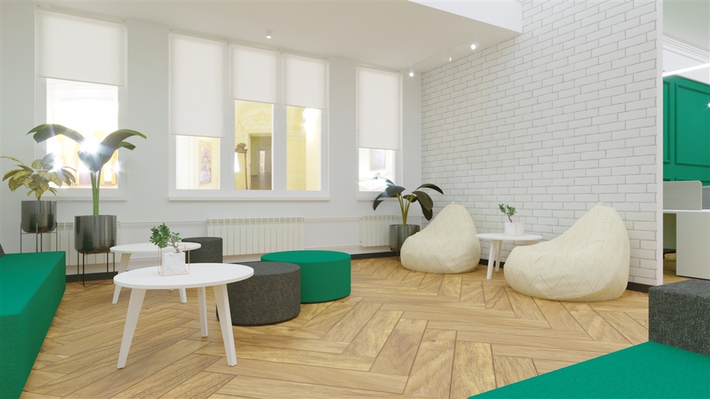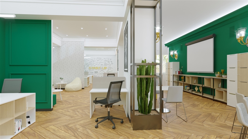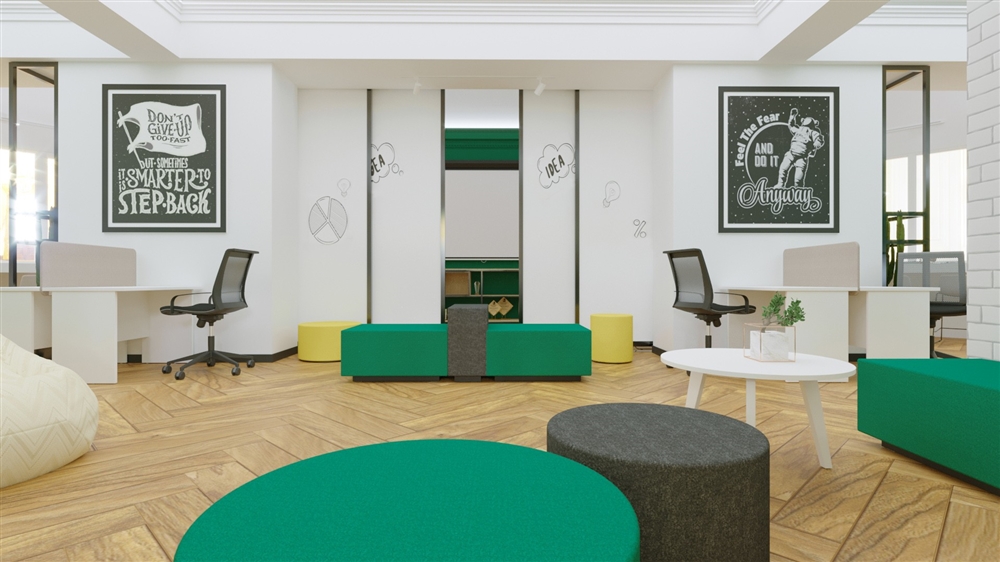 Одним из дизайн-проектов 2021 года является зона коворкинга в здании КБТУ, Алматы.