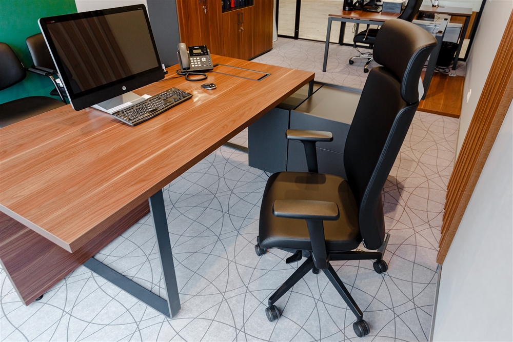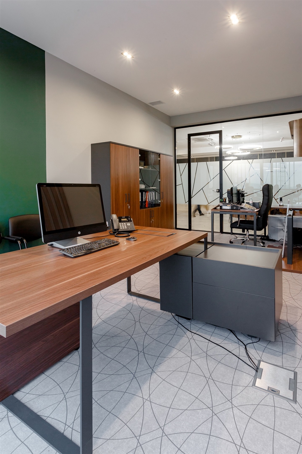 Была проведена большая работа по выбору мебели и напольного покрытия, которая в конечном результате превзошла все ожидания. Ключевым и завершающим штрихом в дизайне офиса стало использование уникального флокированного напольного покрытие Flotex от компании Forbo. Напольное покрытие – это незаменимый атрибут для офисных пространств, так как оно является износостойким и гипоаллергенным, но обладающим всеми свойствами текстильных покрытий. В коллекции Flotex есть широкий ассортимент цветовых и дизайнерских решений, которые отлично могут имитировать такие текстуры как мрамор, дерево или даже траву.
