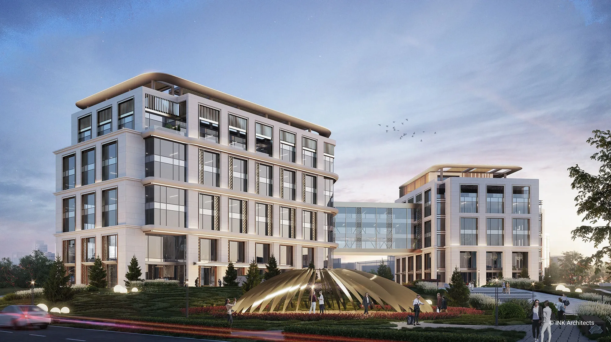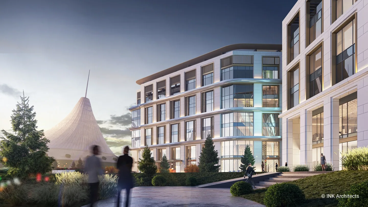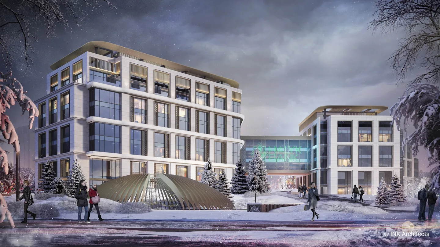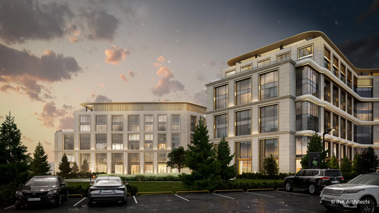 Штаб-квартира Halyk банка в Астане Проект штаб-квартиры банка на просп��кте Туран, созданный INK Architects в 2022 году, формирует современный административный комплекс в одном из самых престижных районов столицы, рядом с ТРЦ «Хан Шатыр» и театром «Астана Опера». Архитектура здания отражает образ надёжности, технологичности и актуальной городской эстетики. Комплекс состоит из двух объемов на 6 и 7 этажей, объединённых подвесной конструкцией pedway, в которой размещён выставочный павильон. Такая планировочная схема учитывает участок сложной формы и создаёт выразительную пространственную композицию. Внутренние зоны организованы так, чтобы обеспечить свободное движение сотрудников и посетителей и комфортную работу всех подразделений. Фасады построены на сочетании вертикальных и горизонтальных линий, подчёркнутой геометрии и крупных плоскостей стекла. Ламели, резолиты и панельные системы усиливают глубину фасадной пластики, создавая современный и представительский образ. Интерьеры выполнены в эстетике хай-тека с деликатными национальными акцентами. В проект также включены ландшафтные решения, озеленённые скверы и два уровня парковки: надземная на 400 мест и подземная на 386 мест, что делает комплекс полноценным и удобным административным центром.