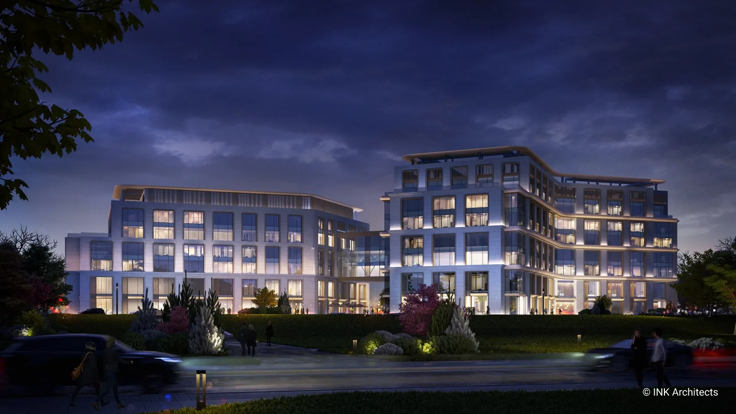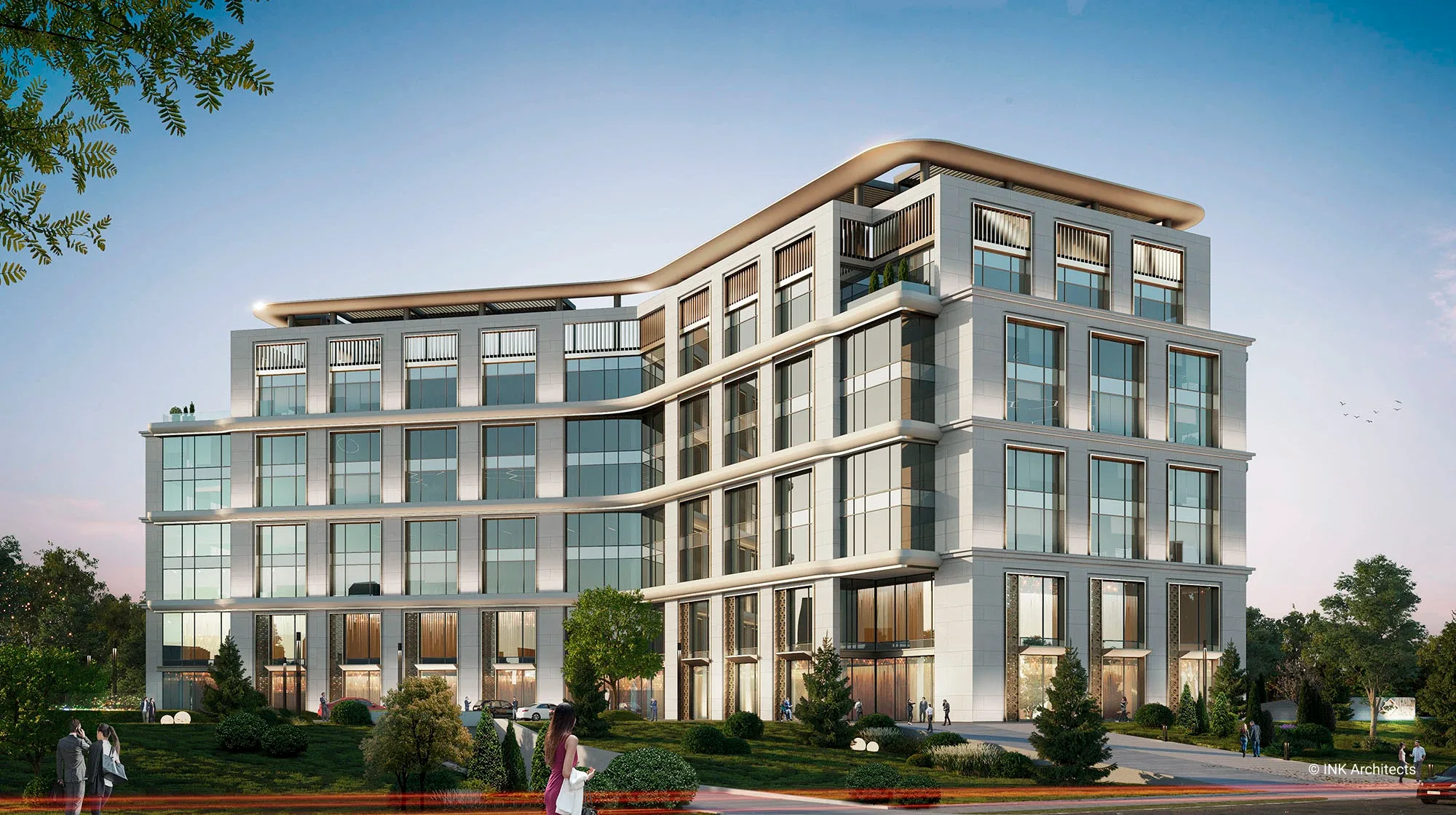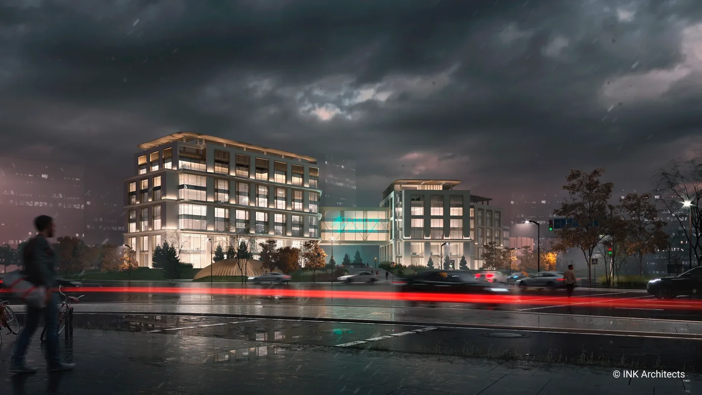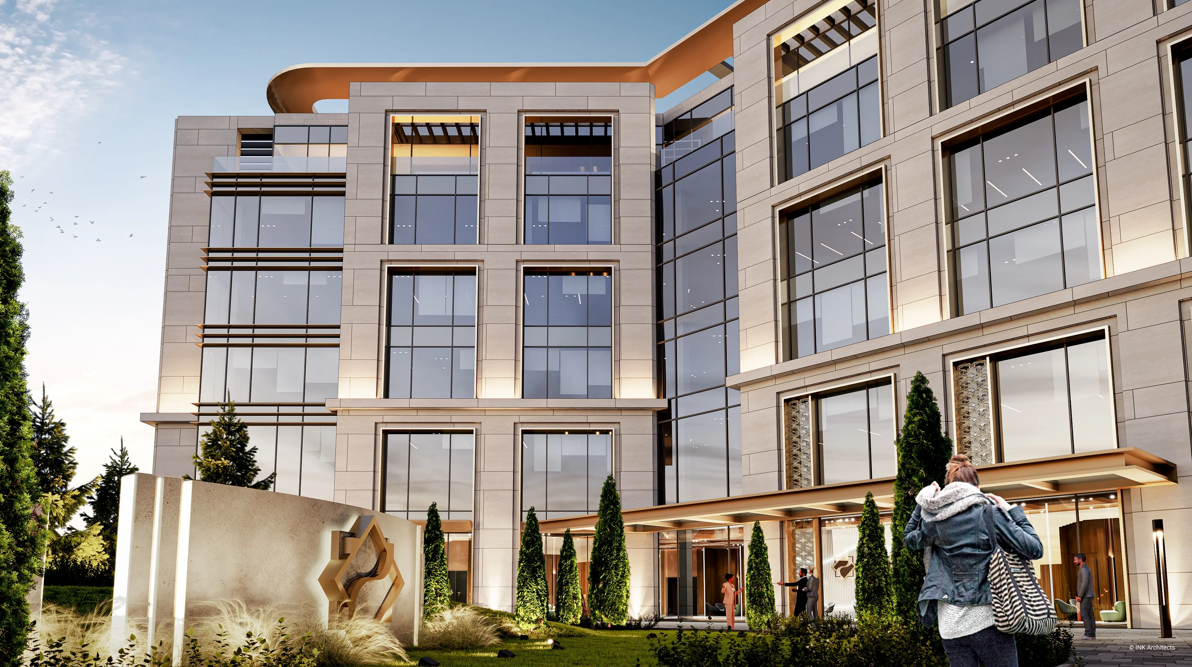 Штаб-квартира Halyk банка в Астане Проект штаб-квартиры банка на просп��кте Туран, созданный INK Architects в 2022 году, формирует современный административный комплекс в одном из самых престижных районов столицы, рядом с ТРЦ «Хан Шатыр» и театром «Астана Опера». Архитектура здания отражает образ надёжности, технологичности и актуальной городской эстетики. Комплекс состоит из двух объемов на 6 и 7 этажей, объединённых подвесной конструкцией pedway, в которой размещён выставочный павильон. Такая планировочная схема учитывает участок сложной формы и создаёт выразительную пространственную композицию. Внутренние зоны организованы так, чтобы обеспечить свободное движение сотрудников и посетителей и комфортную работу всех подразделений. Фасады построены на сочетании вертикальных и горизонтальных линий, подчёркнутой геометрии и крупных плоскостей стекла. Ламели, резолиты и панельные системы усиливают глубину фасадной пластики, создавая современный и представительский образ. Интерьеры выполнены в эстетике хай-тека с деликатными национальными акцентами. В проект также включены ландшафтные решения, озеленённые скверы и два уровня парковки: надземная на 400 мест и подземная на 386 мест, что делает комплекс полноценным и удобным административным центром.