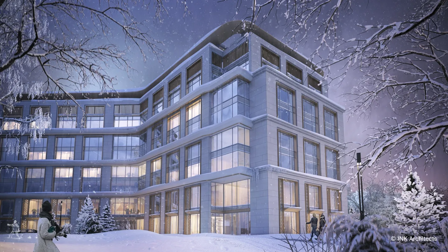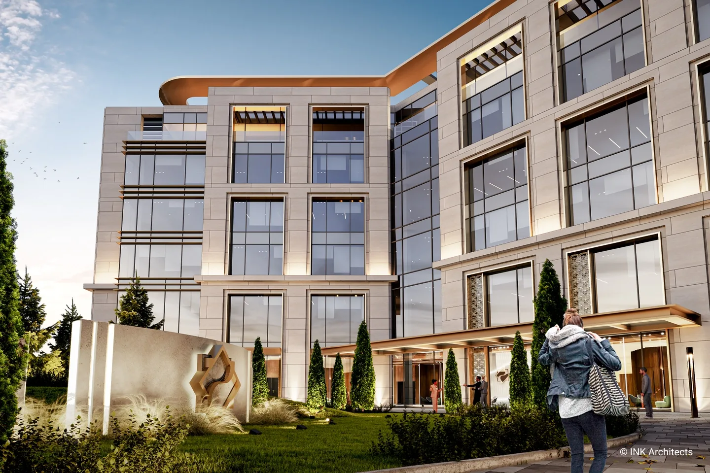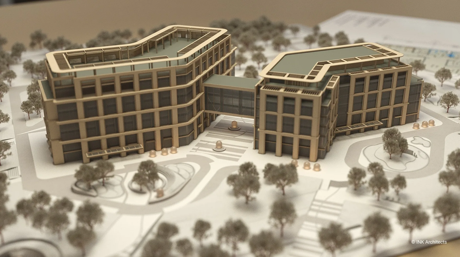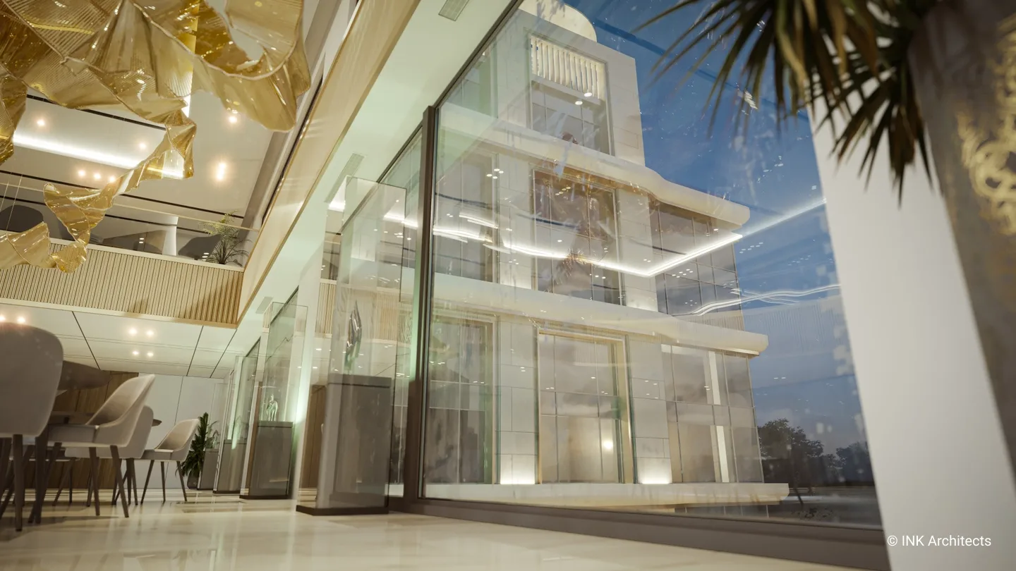 Штаб-квартира Halyk банка в Астане Проект штаб-квартиры банка на просп��кте Туран, созданный INK Architects в 2022 году, формирует современный административный комплекс в одном из самых престижных районов столицы, рядом с ТРЦ «Хан Шатыр» и театром «Астана Опера». Архитектура здания отражает образ надёжности, технологичности и актуальной городской эстетики. Комплекс состоит из двух объемов на 6 и 7 этажей, объединённых подвесной конструкцией pedway, в которой размещён выставочный павильон. Такая планировочная схема учитывает участок сложной формы и создаёт выразительную пространственную композицию. Внутренние зоны организованы так, чтобы обеспечить свободное движение сотрудников и посетителей и комфортную работу всех подразделений. Фасады построены на сочетании вертикальных и горизонтальных линий, подчёркнутой геометрии и крупных плоскостей стекла. Ламели, резолиты и панельные системы усиливают глубину фасадной пластики, создавая современный и представительский образ. Интерьеры выполнены в эстетике хай-тека с деликатными национальными акцентами. В проект также включены ландшафтные решения, озеленённые скверы и два уровня парковки: надземная на 400 мест и подземная на 386 мест, что делает комплекс полноценным и удобным административным центром.