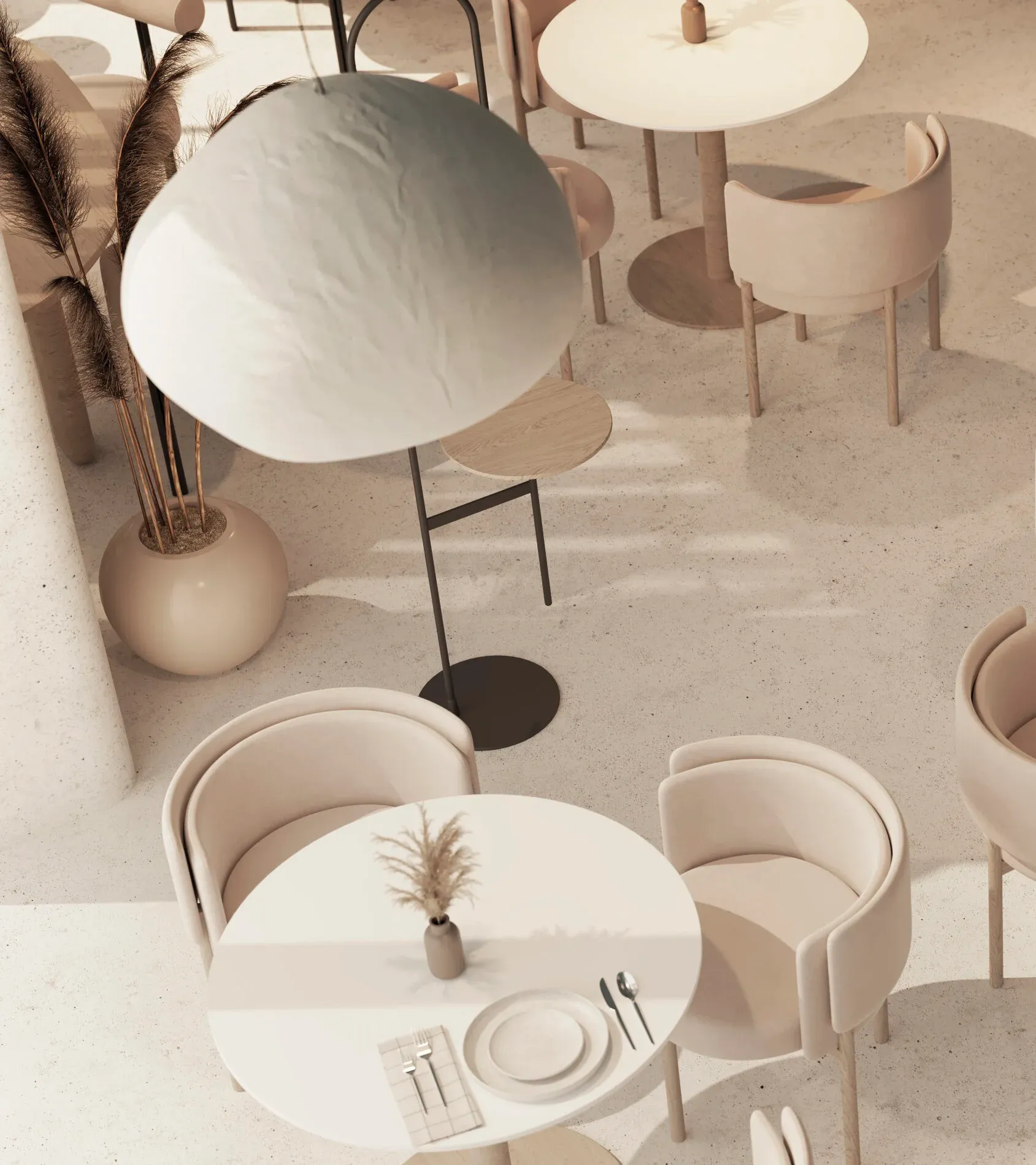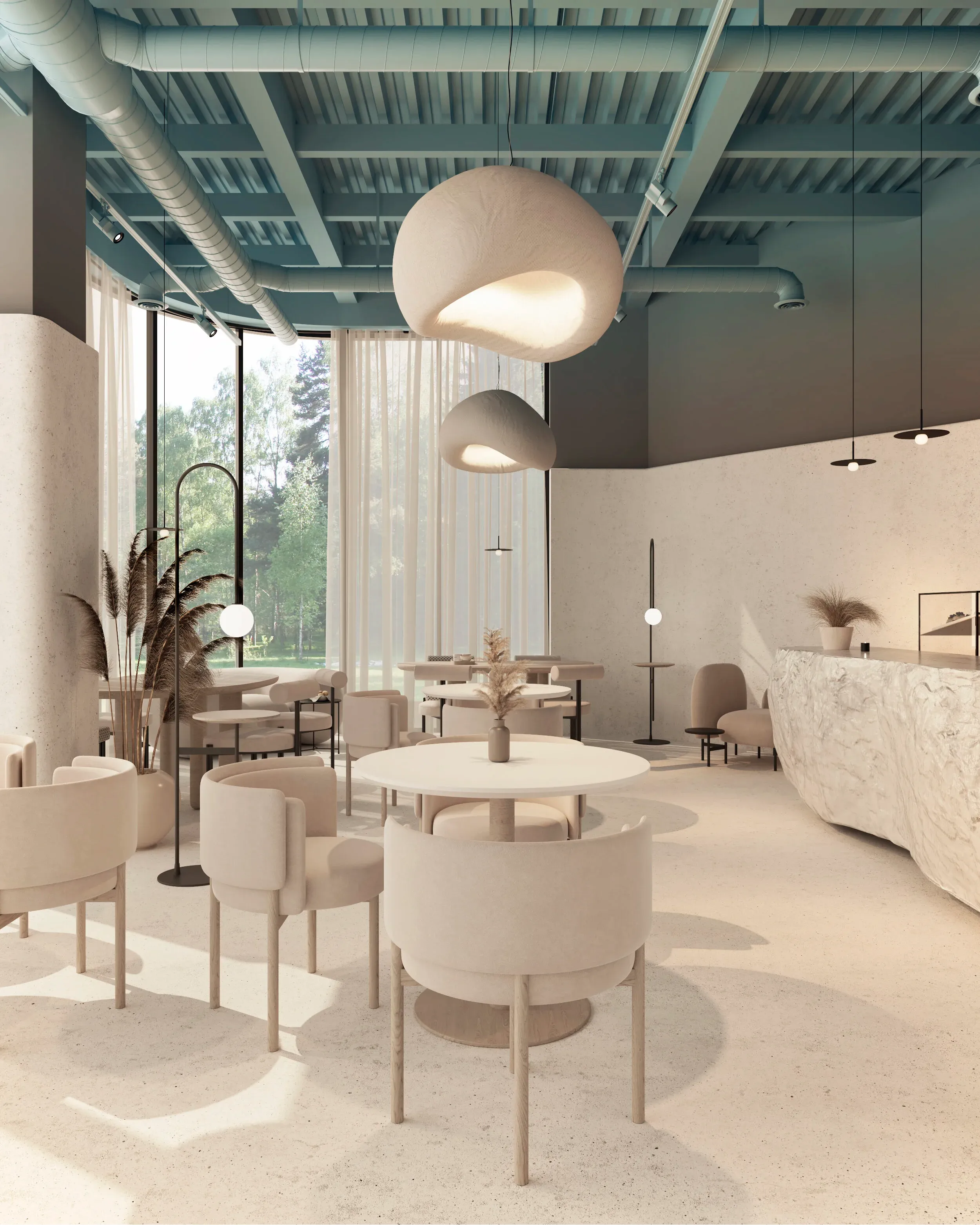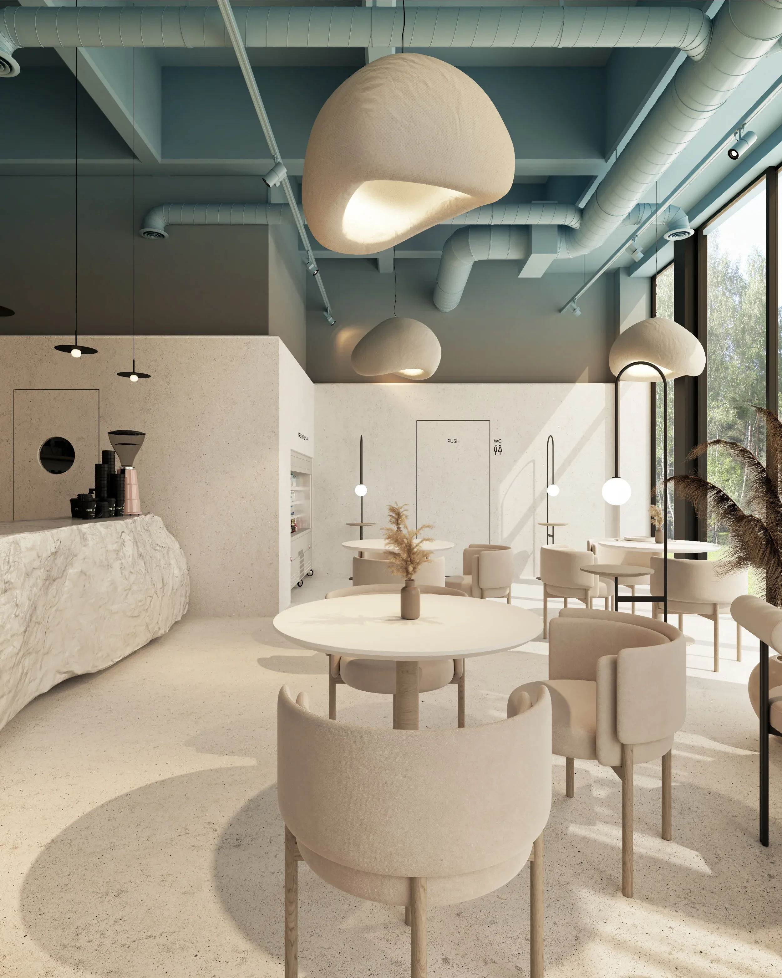 <div class="description">Тип: Кафе Местоположение: г. Алматы, Казахстан Площадь: 100 м2 Сектор: HoReCa Основная идея дизайна интерьера кафе - это гармоничное сочетание пространственного минимализма и концептуального лофта. Все элементы интерьера работают с друг другом - это создает единый организм, единый концептуальный город. Центральная барная стойка выполнена в стиле скалы, что символизирует горы, возвышающиеся над мегаполисом. Приятные пол и стены из микроцемента прерываются на основном цветовом пятне помещения, на голубом градиенте, символизирующий небо. Несмотря на теплый и комфортный интерьер, кафе ведет диалог с посетителем, напоминая ему о глобальной проблеме, проблеме экологии. Серый цвет, переходящий в голубой - ничто иное как смог, застывший над городом. Комфортная минималистичная мебель, светлое дерево, кремовые пол и стены, необычная барная стойка, открытые цветные коммуникации - все это воплощается в концептуальное кафе, символизирующее облик города, который стремится в будущее, изредка заглядывающий в прошлое.</div>