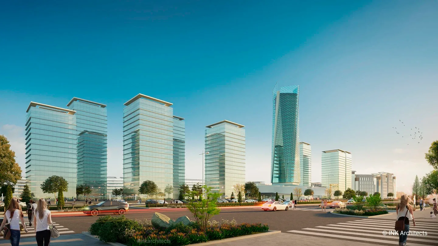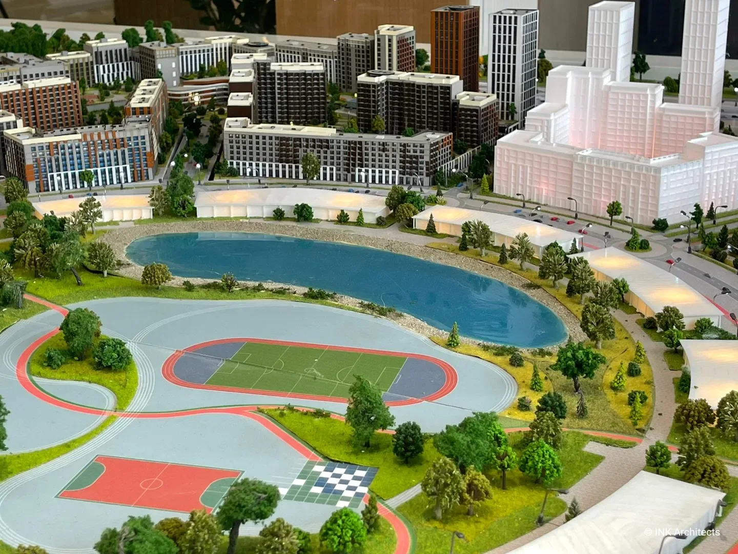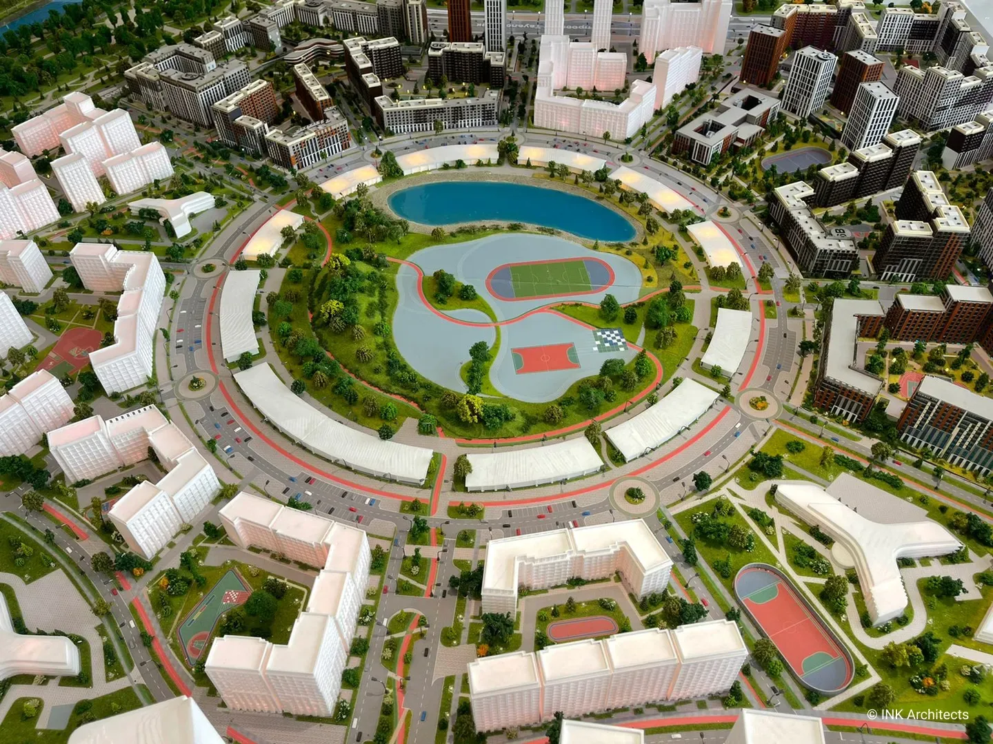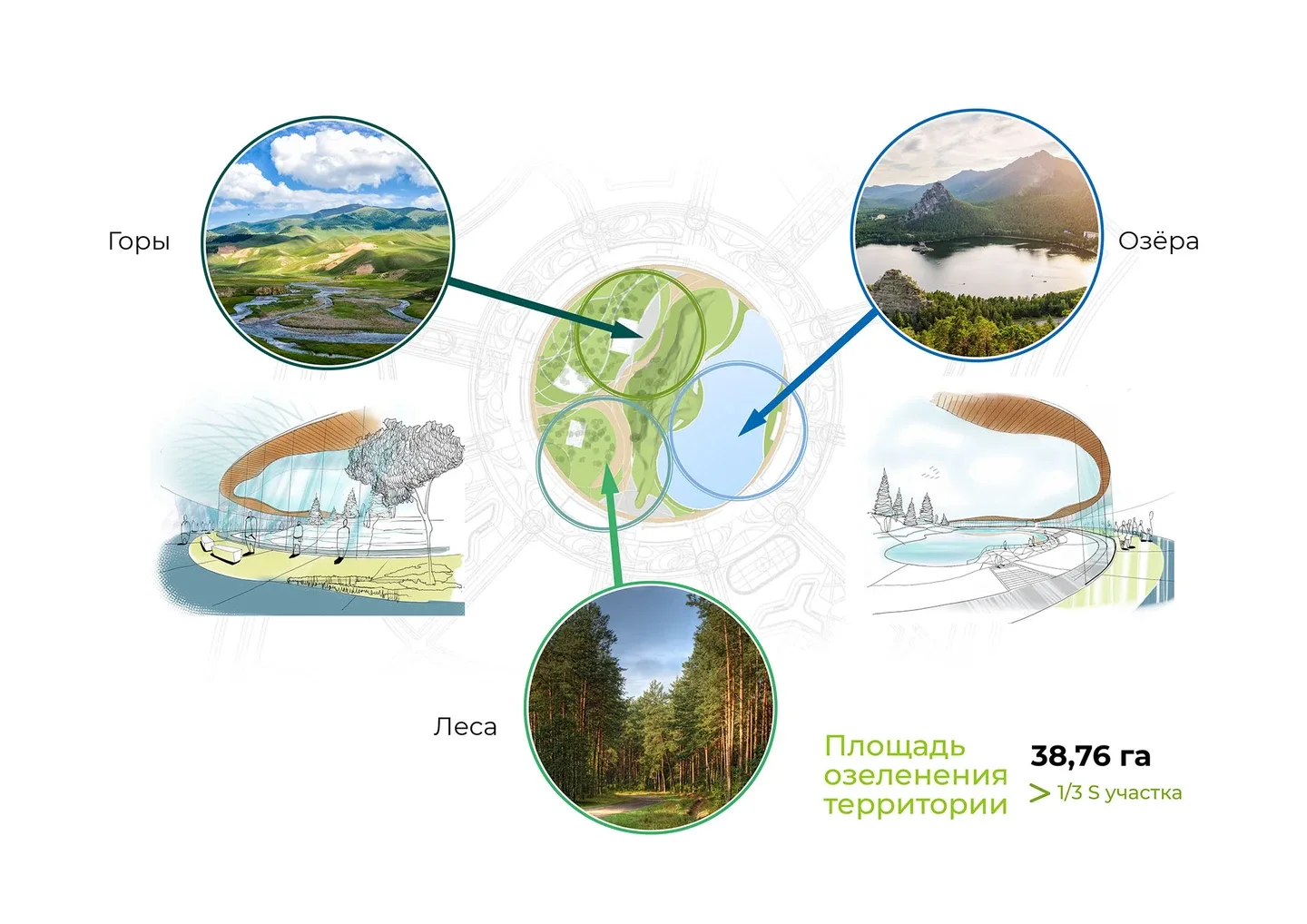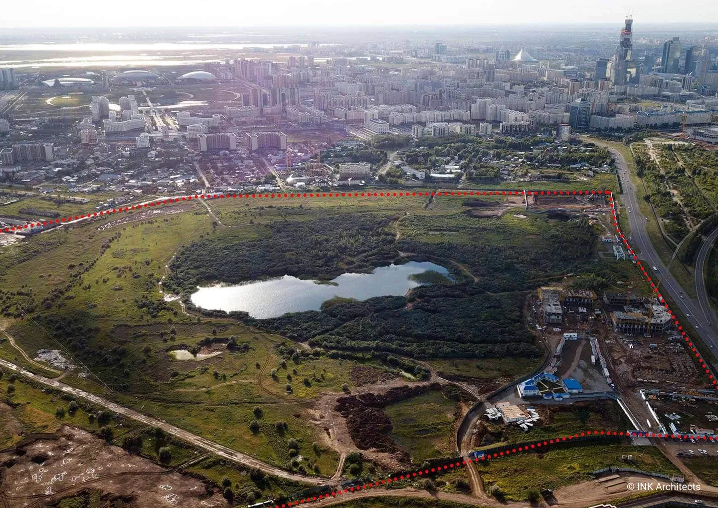 Уникальный в своём роде концепт города в городе — жилой район площадью 86,64 Га Capital Park расположился в самом сердце Астаны и включает в себя жилые комплексы для 23 тысяч жителей, 35 этажный бизнес-центр, коммерческие зоны площадью более, чем 100 тысяч квадратных метров, 4 школы, 10 детских садов, 13 тысяч парковочных мест, а также уникальную в своем роде парковую зону. Главной концепцией района стала разработка его центральной части — огромного живописного зеленого парка, вдохновением для которого послужили 3 основных природных богатства Казахстана. Горы, озера и леса заняли треть всего участка и воплотились в уникальной идее создания собственного комфортного микроклимата в Capital City Park, чему было уделено особое внимание архитекторов. Озеро является естественным источником влажного воздуха и легкого бриза, а холмы и леса создают благоприятное движение воздушных потоков и тенистые зоны для отдыха. И если проблема засушливого лета, была решена созданием комфортной парковой зоны, то такая проблема, как сильные ветра, особенно зимой, может быть решена только с помощью архитектурно-планировочных решений. Это являлось важнейшим из факторов при разработке структуры района. Учитывая инсоляцию и розу ветров, путем проектирования зданий разной этажности, высота которых уменьшается к центру, была создана уникальная урбанистическая территория, искусственно защищенная от агрессивной внешней среды. Центральная часть района, включая парк, коммерческие зоны и бульвары, является полностью пешеходной и не имеет доступа для проезда транспорта. Бульвар имеет уникальный дизайн покрытий и живописные сухие фонтаны. Закольцованная композиция коммерческих зданий и пешеходных, а также велосипедных дорожек позволило создать неповторимый ландшафтный дизайн для семейного отдыха и занятий спортом в искусственно созданной природной зоне в самом центре мегаполиса. Тему природы архитекторы продолжили в современной архитектуре с элементами бионики. Богатые сочетания цветово