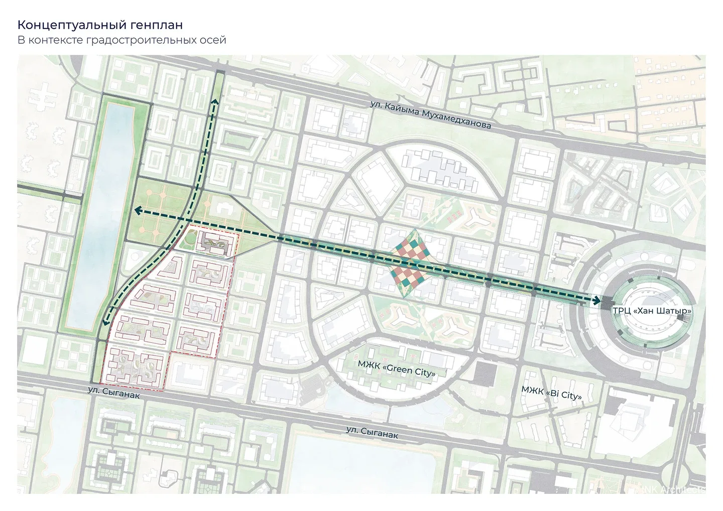 Комплекс возводится в динамично развивающемся Есильском районе Астаны, почти в шаговой доступности от ТРЦ Хан-Шатыр и создаваемого центра Природных парков в окружении озера Талдыколь. Район отличается хорошо развитой инфраструктурой с уже существующей сетью социальных объектов. Отсюда можно быстро добраться в любой район Астаны благодаря проходящей рядом автомагистрали и удобной транспортной развязке. Концепция проекта складывалась из требований современной жилой архитектуры, в связи с чем примат функционализма отразился на его стилевом и образном выражении. То есть использована классическая рациональная система зонирования пространства, заложенная в стиле архитектуры функционализма. Вторым фактором концептуального осмысления объекта явилось само окружение проектируемого квартала города: большой круг жилого сектора. ЖК Sat City – это одиннадцать домов, скомпонованные из отдельно стоящих и блокированных типов зданий, образующие восемь замкнутых дворов на площади в 17 га. Согласно проекту, они объединены стилобатом, имеют встроено-пристроенные помещения коммерческого назначения по всему периметру первых этажей. Одна из особенностей проекта – эксплуатируемая кровля стилобата, благоустроенная детскими и спортивными площадками, зонами отдыха для жителей, озеленением кровли паркинга. Проект монолитно-каркасной конструкций предлагает также трёхъярусную мультипарковочную систему, увеличивая количество машиномест комплекса. Параллельно с перечисленными достоинствами оснащения жилого комплекса различными видами услуг важное место авторами проекта отведено решению эстетических задач. Эстетика архитектуры функционализма в принципе скупа, в разработке объемов комплекса Sat City использованы возможности пластического моделирования форм с помощью конструктивных и декоративных систем. Так, пластика фасадов моделируется небольшими ризалитами, фактурой разнообразного типа облицовки из натурального камня (травертин, красный глянцевый гранит), клинкерного кирпича, ал