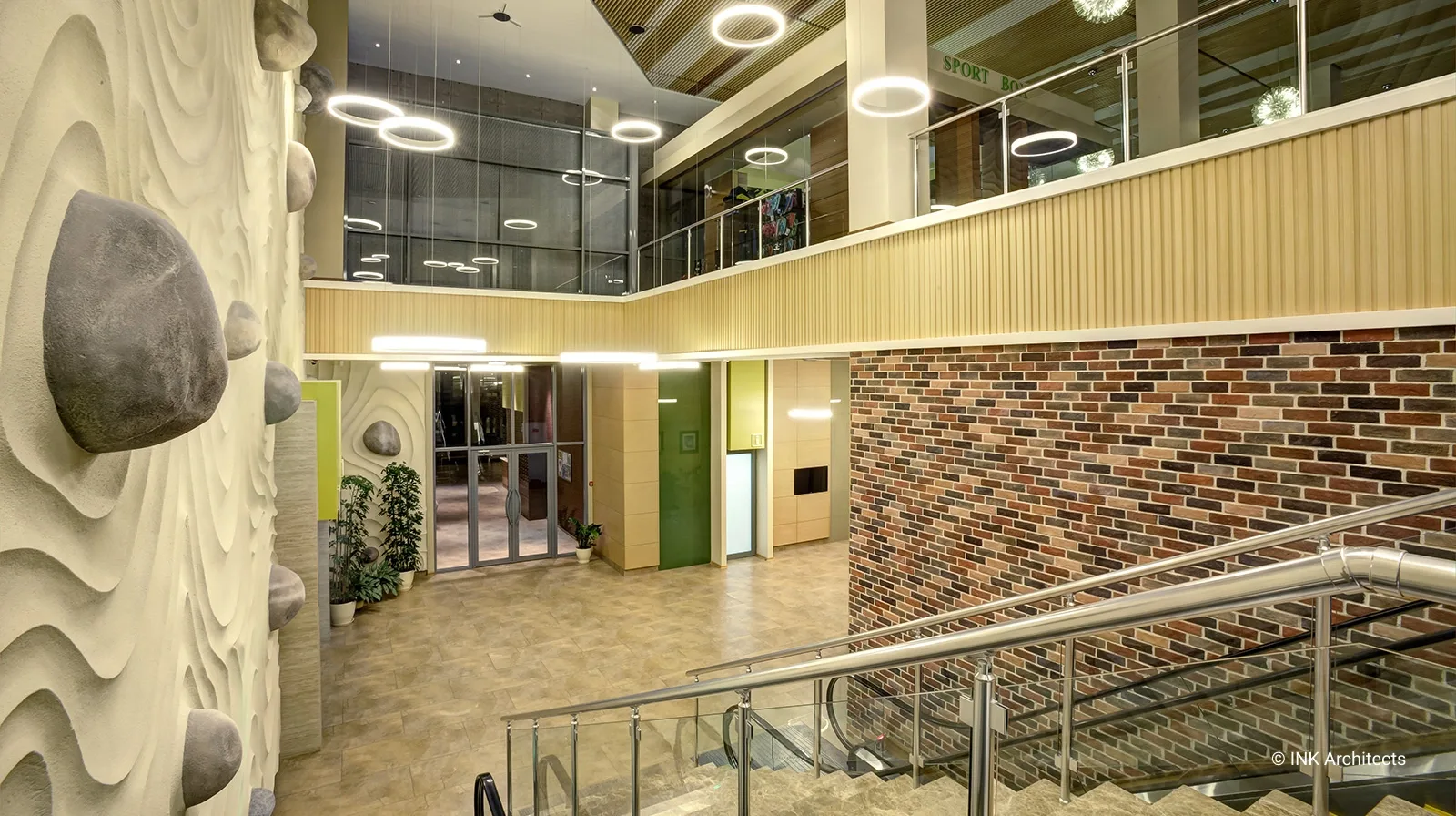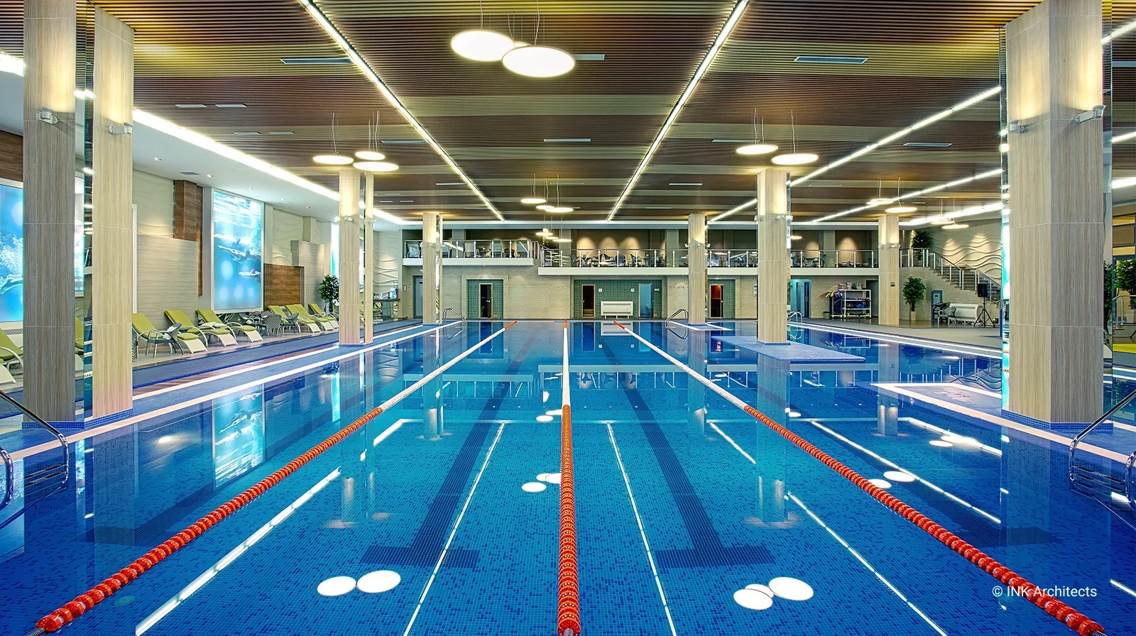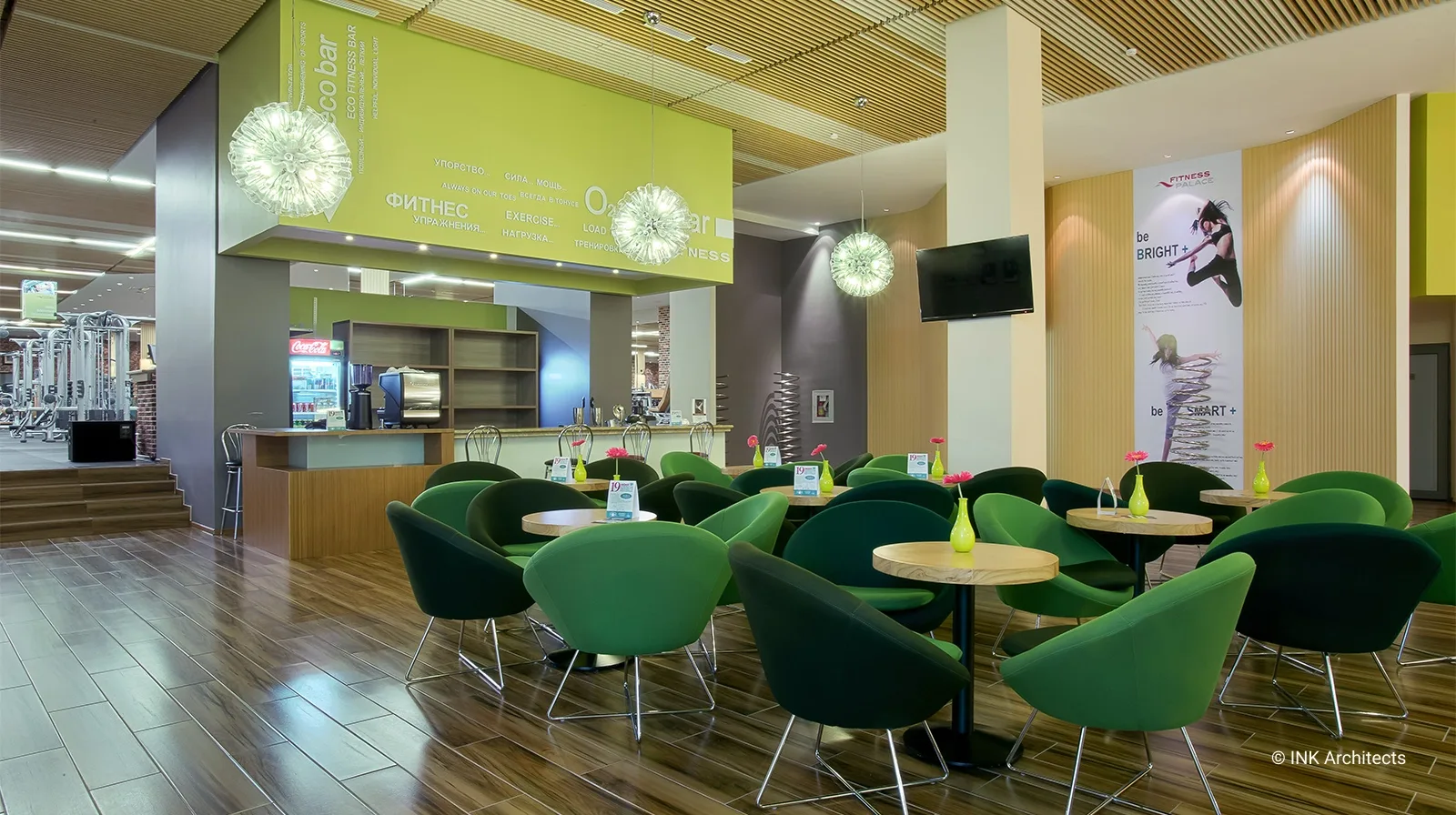 Объем Fitness Palace в Астане включает в себя три этажа и подвал. Ключевые для архитектуры и дизайна понятия «функция» и «форма», осмысленные с эстетических позиций в разработке сугубо специализированного заведения явились базовыми принципами проекта фитнес комплекса. В решении интерьера основной акцент сделан на декоративное освещение и эксклюзивную отделку стен, колористическую гамму, создавая неповторимую атмосферу в каждом помещении. Семиметровая стена гостевого холла декорирована по индивидуальному заказу. Спортивный дух поддерживают сюжеты принтов на стенах тренажерного и спортивных залов. В отделке преимущественно натуральные материалы. Интерьер соответствует потребностям современной развивающейся столицы, как в эстетическом, так и в технологическом смысле. Спортивно-оздоровительный комплекс включает: бассейн, спортивные и тренажерные залы, спа-салон с процедурными кабинетами и парикмахерской, рассчитанные на обычных и премиум класса посетителей.