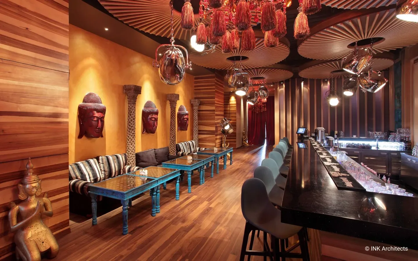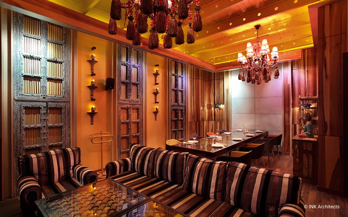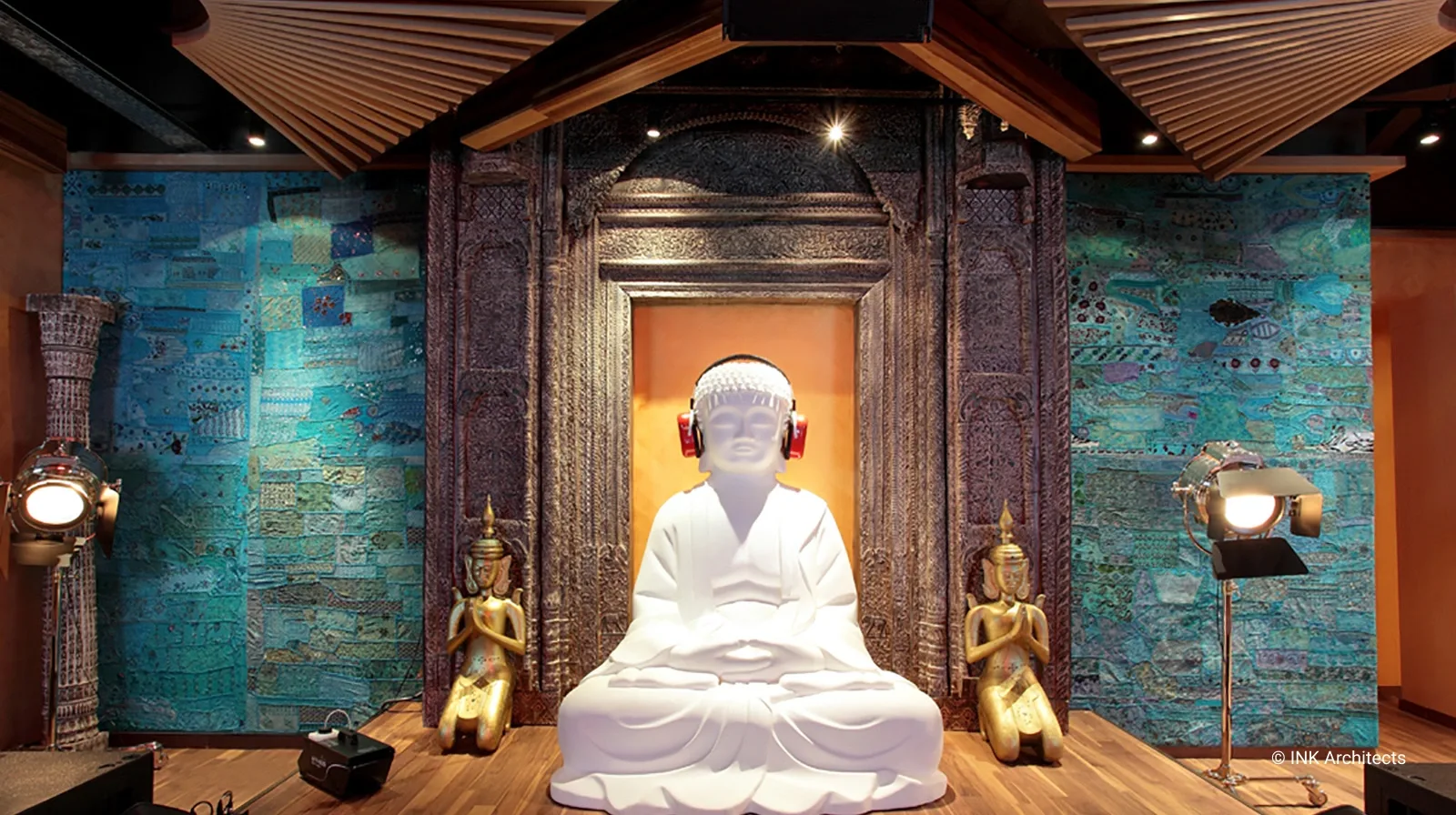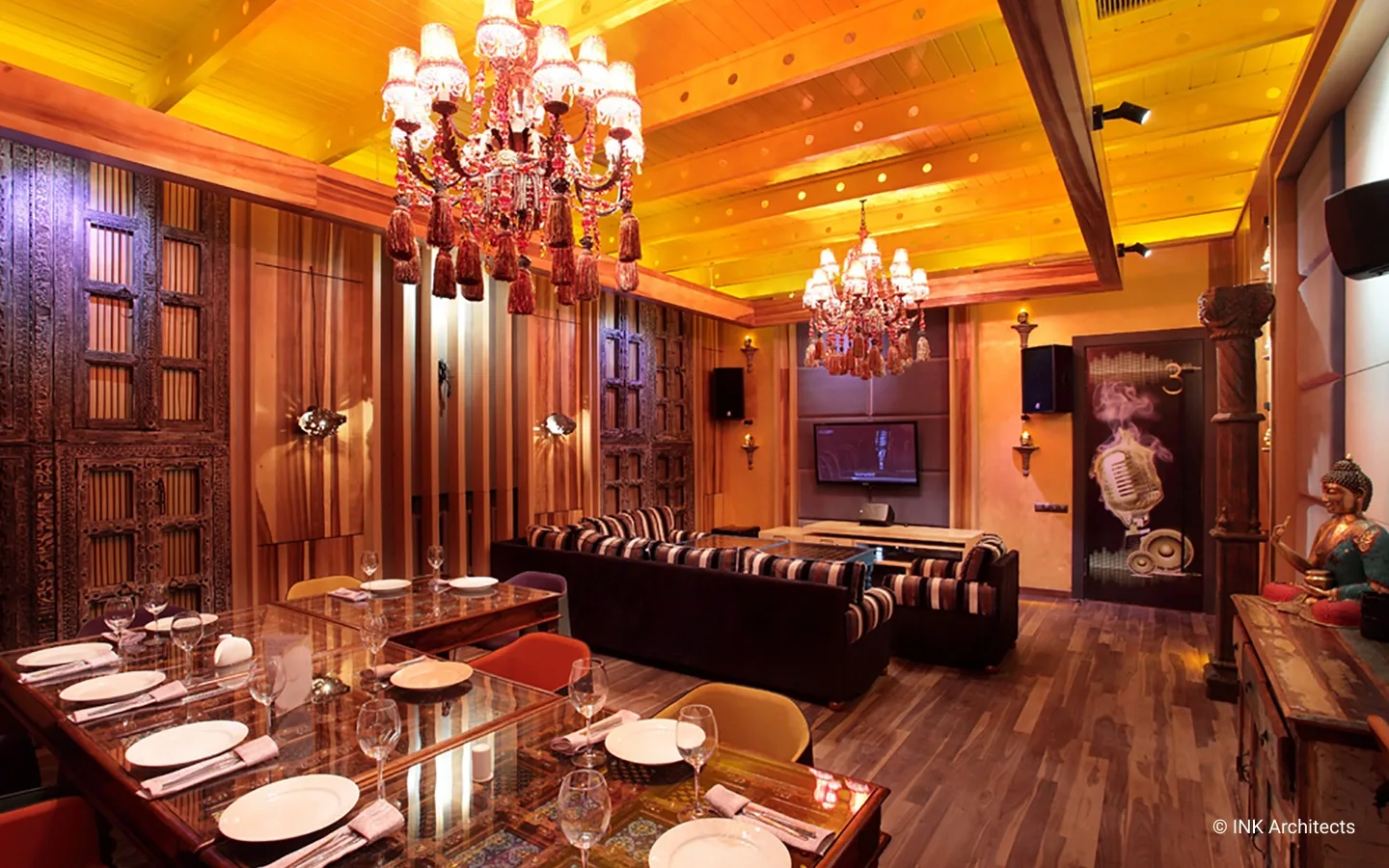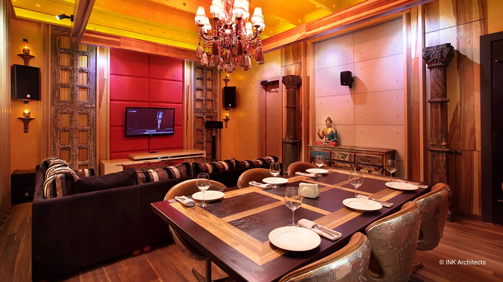 Jimmy расположен на уровне одного этажа в ресторанном комплексе Hungry Rabbit. Такой проект был возможен только с дозволения заказчика, с его неординарным подходом ко всему. Название навеяно фильмами с участием одного из популярных индийских актеров Митхуна Чакраборти. Философская концепция «сумасшедшего» от смешения реального и ирреального миров стала основой проектных разработок. В интерьере доминируют дикие, яркие, с преобладанием красного, оттенки цветов. Однако контраст присутствует больше в общей атмосфере, в переплетении древнейших традиций далекой страны и современных технологий. Повсюду настоящие старинные антикварные предметы из ремесленных регионов Индии (Джайпур, город Раджастан). Везде ручная резная работа, натуральные ткани в отделке, активно влияющие на звукоизоляцию. На фоне ярких контрастов в центре зала один из главных персонажей – белый Будда с наушниками, здесь он такой же любитель музыки, в свете цветосветовых эффектов, постоянно меняя оттенки цвета, погружен в иллюзорное пространство звуков.