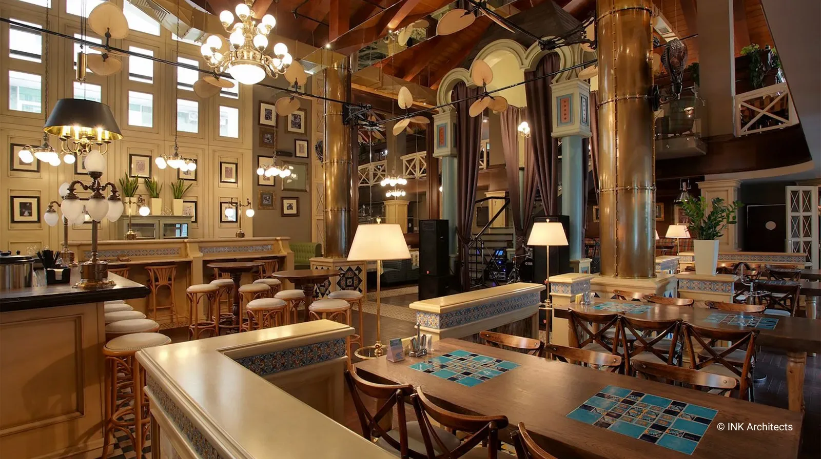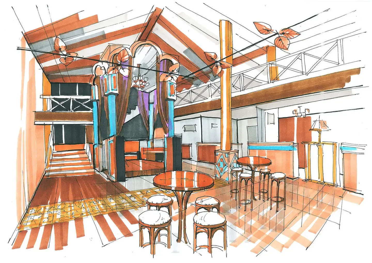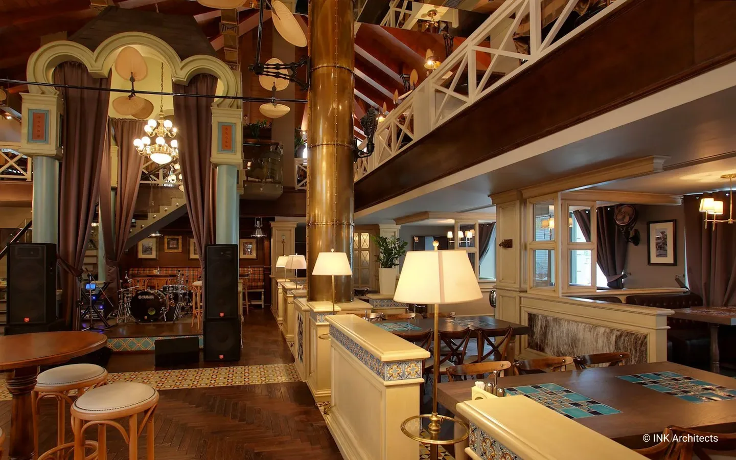 El Mirador трехуровневый ресторан в Алматы с оттенками стилистики пивного ресторана. Фантазии на темы европейской классики с включениями индустриальных технологий двух последних веков отразились в художественной концепции проекта. При этом классика проглядывается в общей композиции пространства, в конструкциях деревянных перегородок, индустриальные признаки присутствуют в используемых материалах. Центральной частью дизайна интерьера является сцена, обыгранная в виде шатра, с почти гротескной трактовкой трехлепестковыми полукружиями оснований и с опорой на колонны отделанных бронзовыми листами. В отделке много дерева, керамика из Мексики, совершенно несочетающиеся между собой вентиляторы, привезены из Америки. В верхнем ярусе доминирует приглушенный свет простейших ламп, насаженных в одну плоскость стеклянного прямоугольника в духе предметов начала ХХ века. В интерьере множество подобных мелочей.