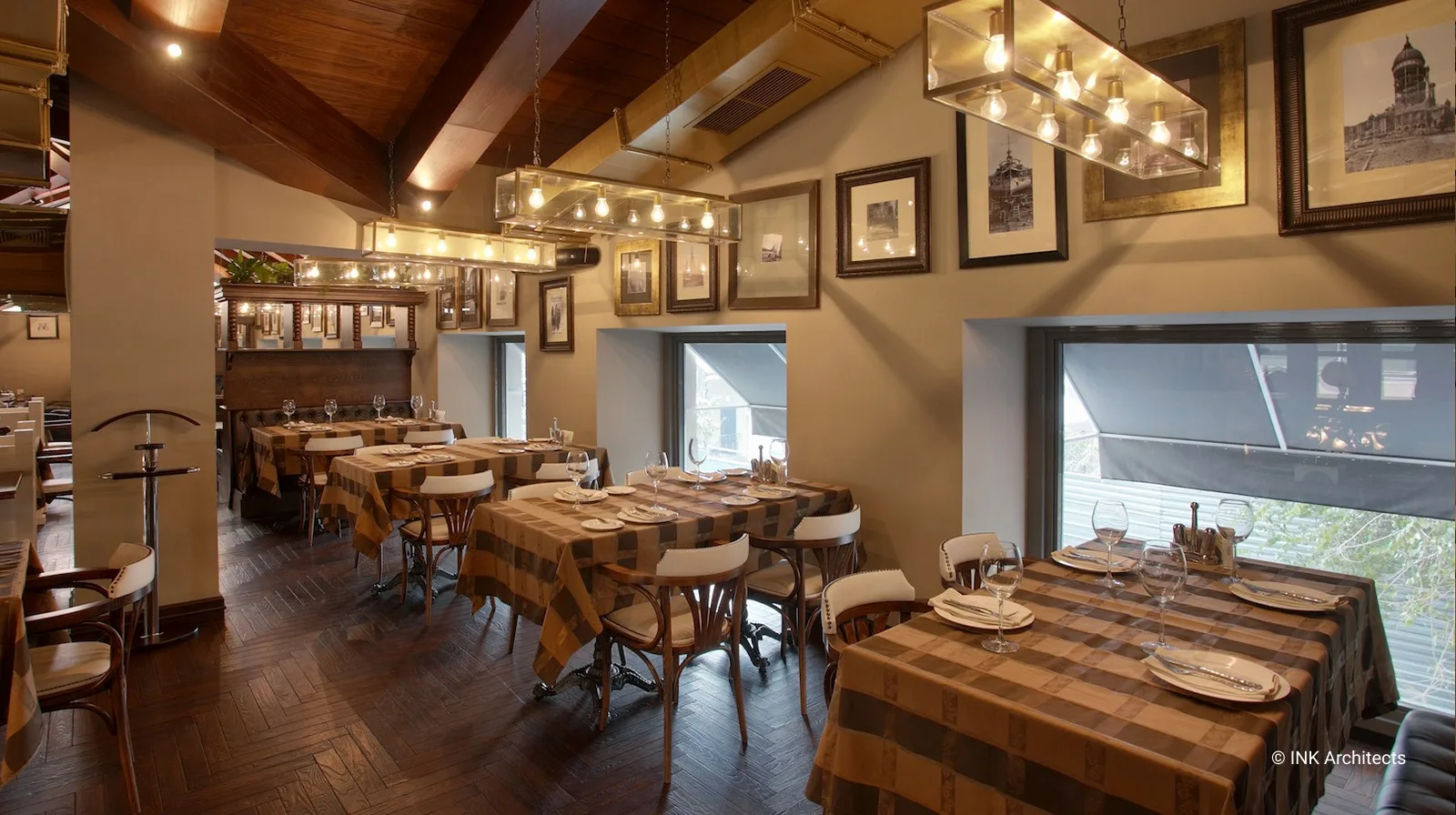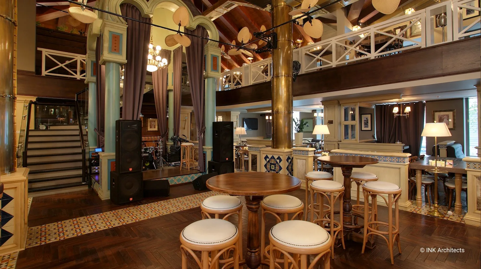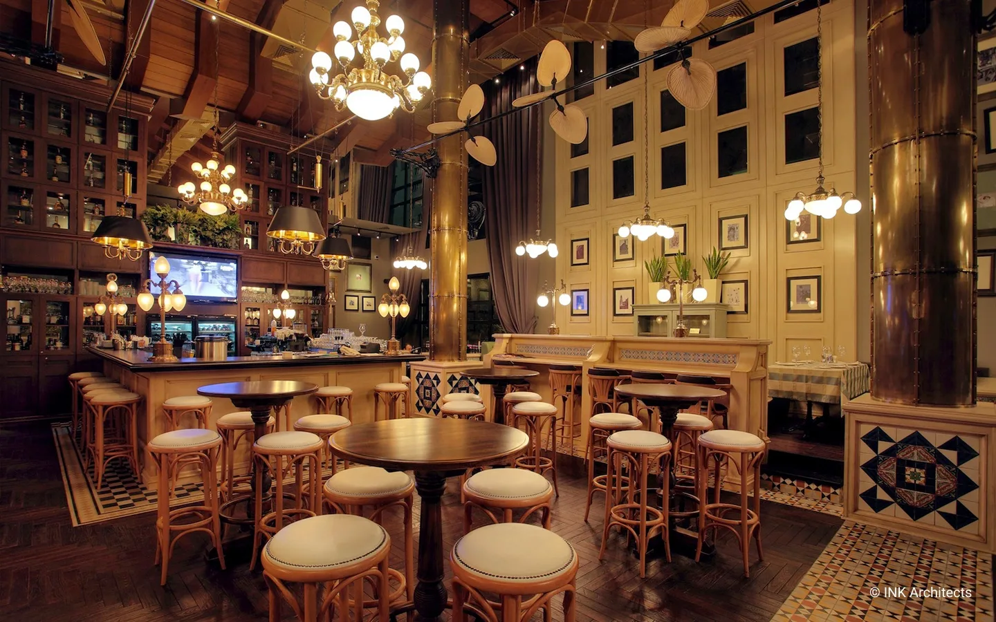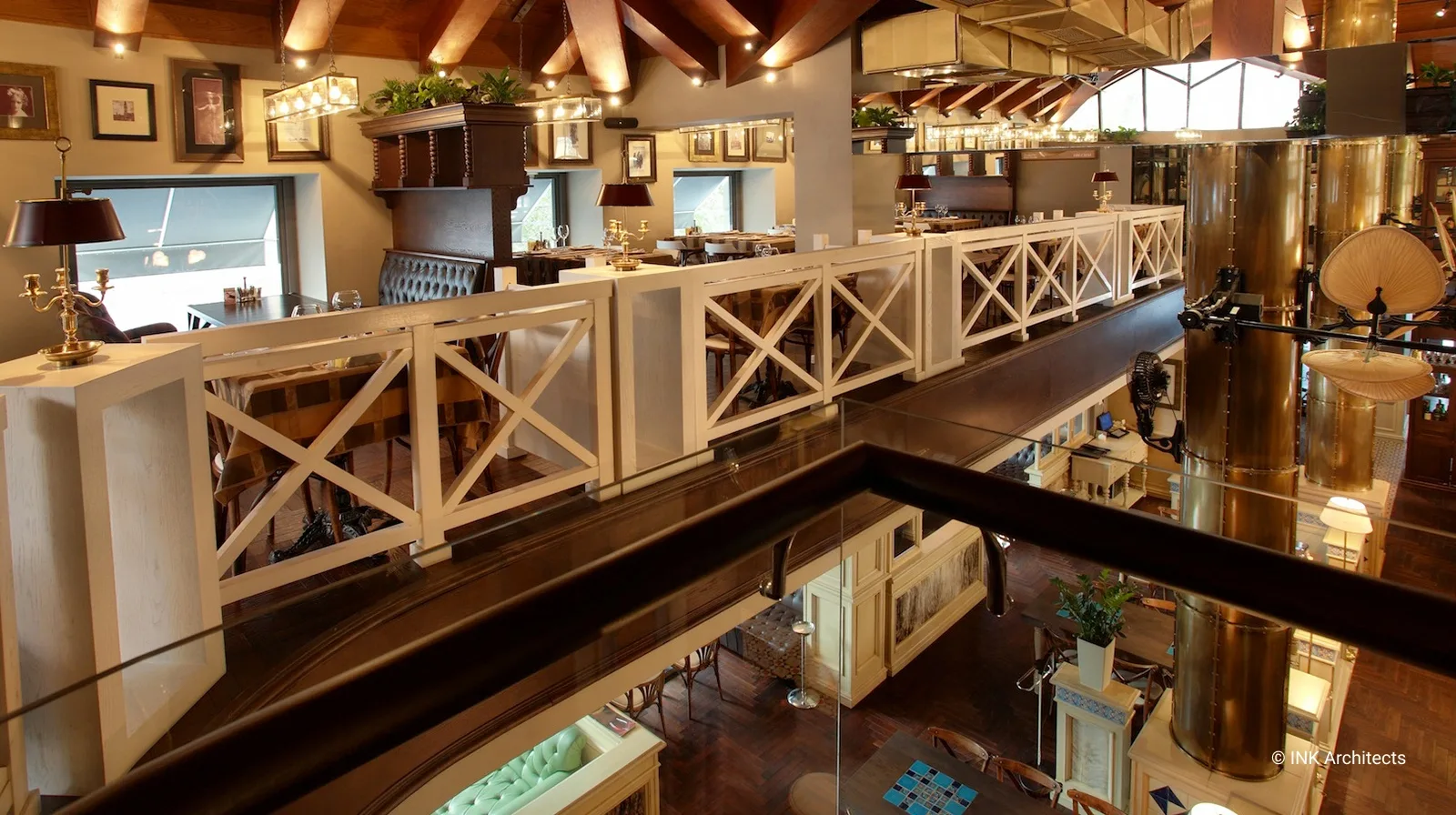 El Mirador трехуровневый ресторан в Алматы с оттенками стилистики пивного ресторана. Фантазии на темы европейской классики с включениями индустриальных технологий двух последних веков отразились в художественной концепции проекта. При этом классика проглядывается в общей композиции пространства, в конструкциях деревянных перегородок, индустриальные признаки присутствуют в используемых материалах. Центральной частью дизайна интерьера является сцена, обыгранная в виде шатра, с почти гротескной трактовкой трехлепестковыми полукружиями оснований и с опорой на колонны отделанных бронзовыми листами. В отделке много дерева, керамика из Мексики, совершенно несочетающиеся между собой вентиляторы, привезены из Америки. В верхнем ярусе доминирует приглушенный свет простейших ламп, насаженных в одну плоскость стеклянного прямоугольника в духе предметов начала ХХ века. В интерьере множество подобных мелочей.