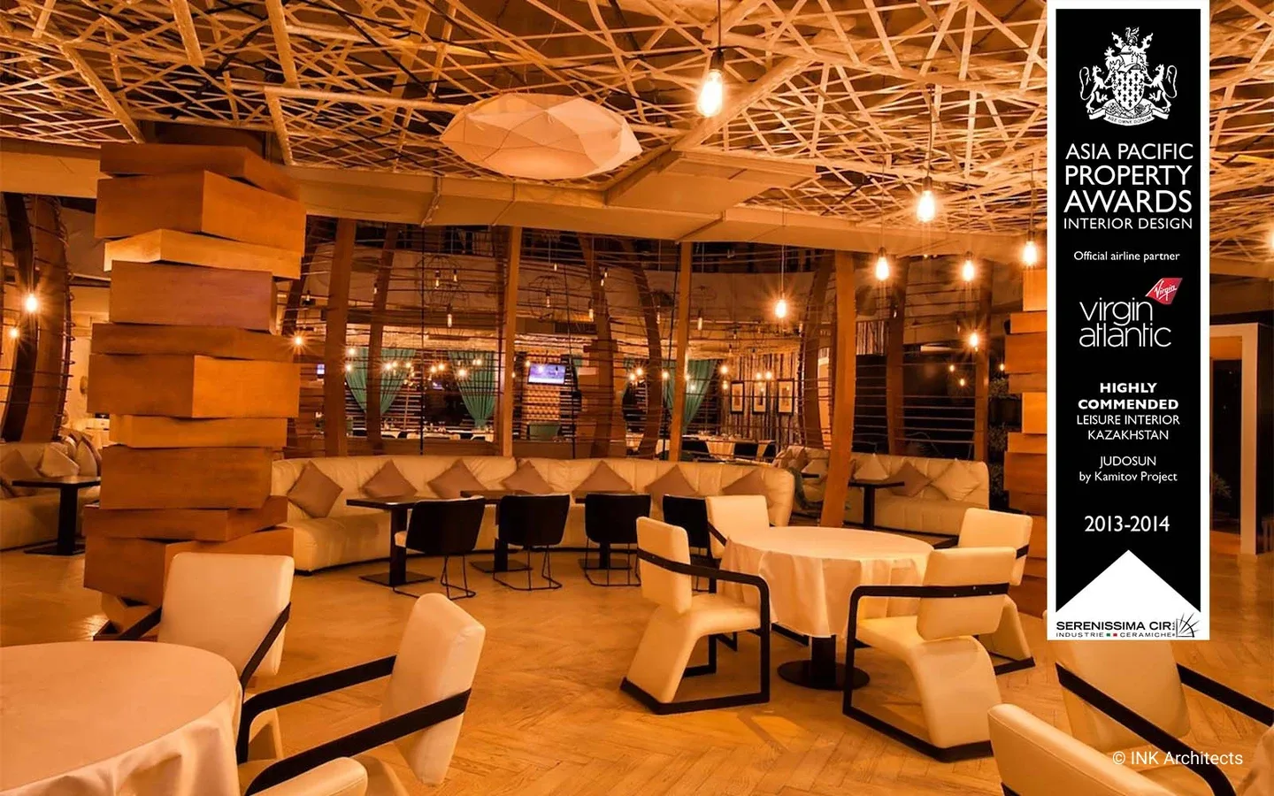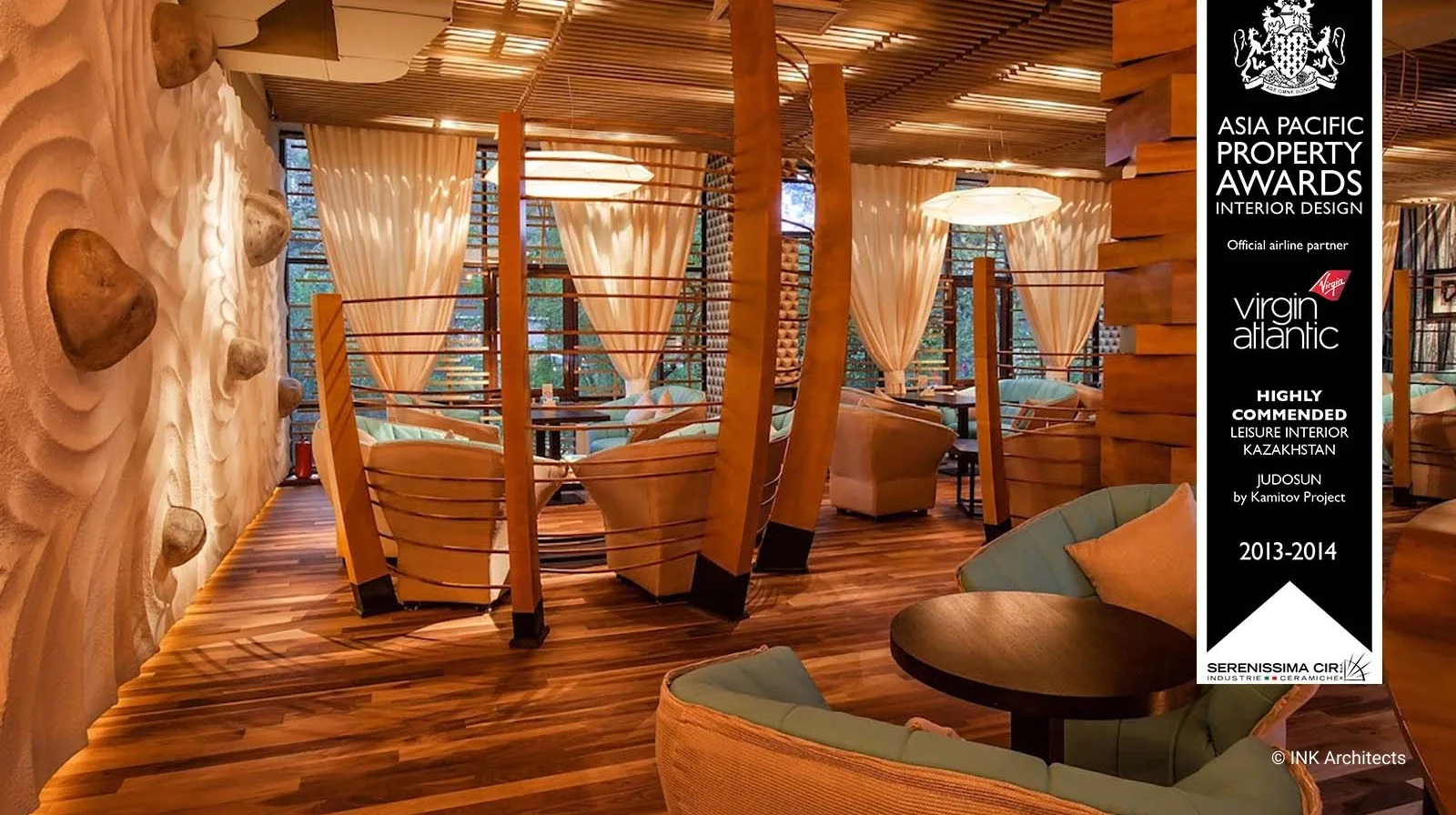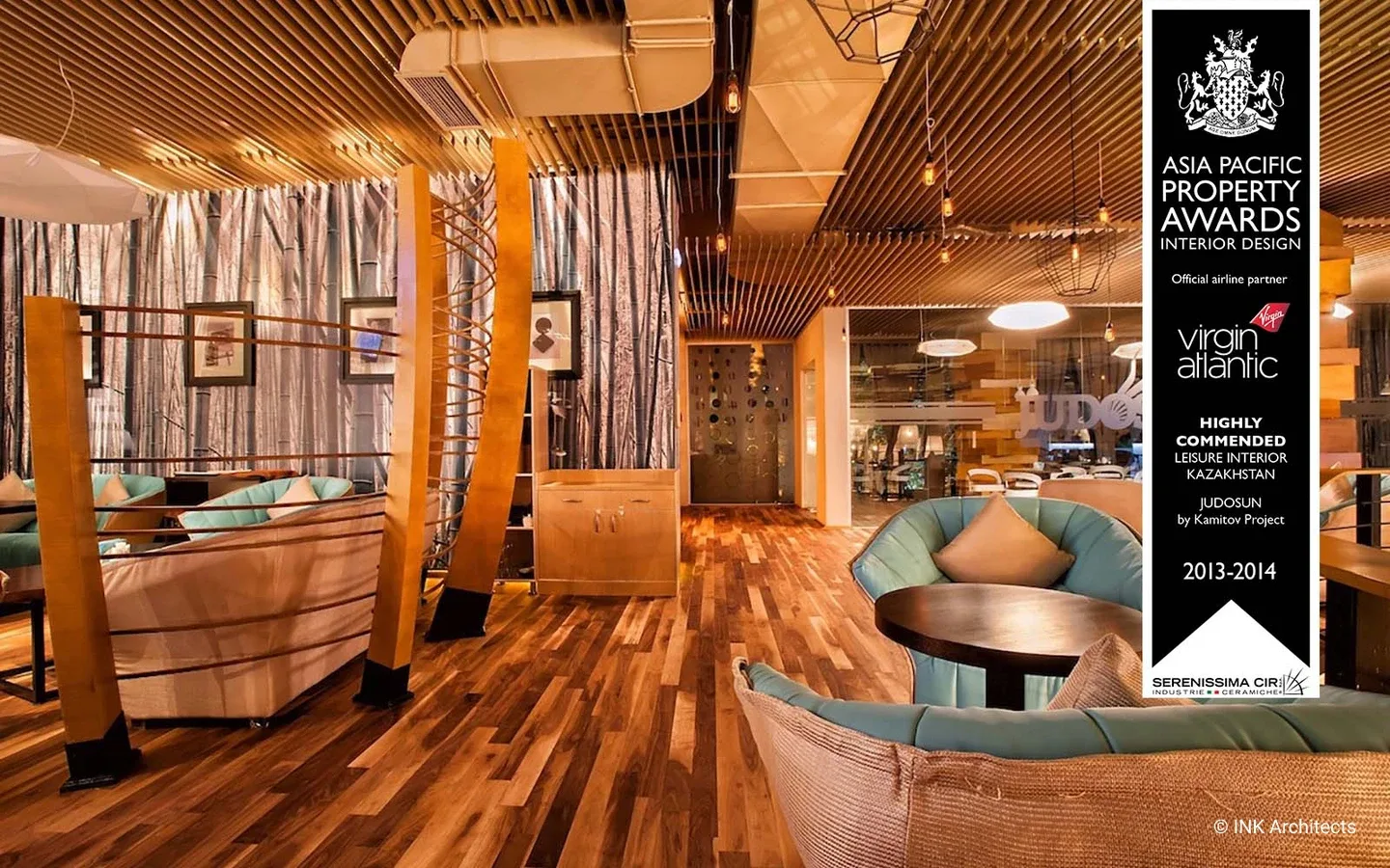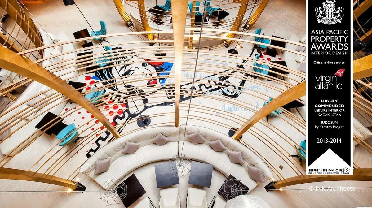 Ресторан Judosun – полная реконструкция с сохранением инженерных сетей бывшего банкетного зала в Алматы. Восточная медитативность, ненавязчивость, чувство меры в контрасте с элементами культуры «дикого Запада» - концептуальные позиции в разработке проекта. Ресторан разбит на два уровня. Первый – ресторан-трансформер для проведения разных мероприятий. Два портала, как два перехода из одного пространства в другое. Полукруглые гнутые деревянные конструкции перегородок - интерпретация китайской традиции и кочевой культуры (юрты). Объемный декор стен, в виде текучих волн песка, навеяны японским садом камней. Второй уровень ресторана более закрытый, с барной стойкой и интегрированным здесь же DJ в секторе, с более расслабляющей обстановкой. Отсюда же раскрывается общий вид на пространство нижнего этажа, прочитывается его ритмическая структура, отчетливо читается изображение известного произведения американского поп-артиста ХХ века, Р. Лихтенштейна, на полу. Проект был удостоен международной премии в Куала-Лумпуре, Малайзия.