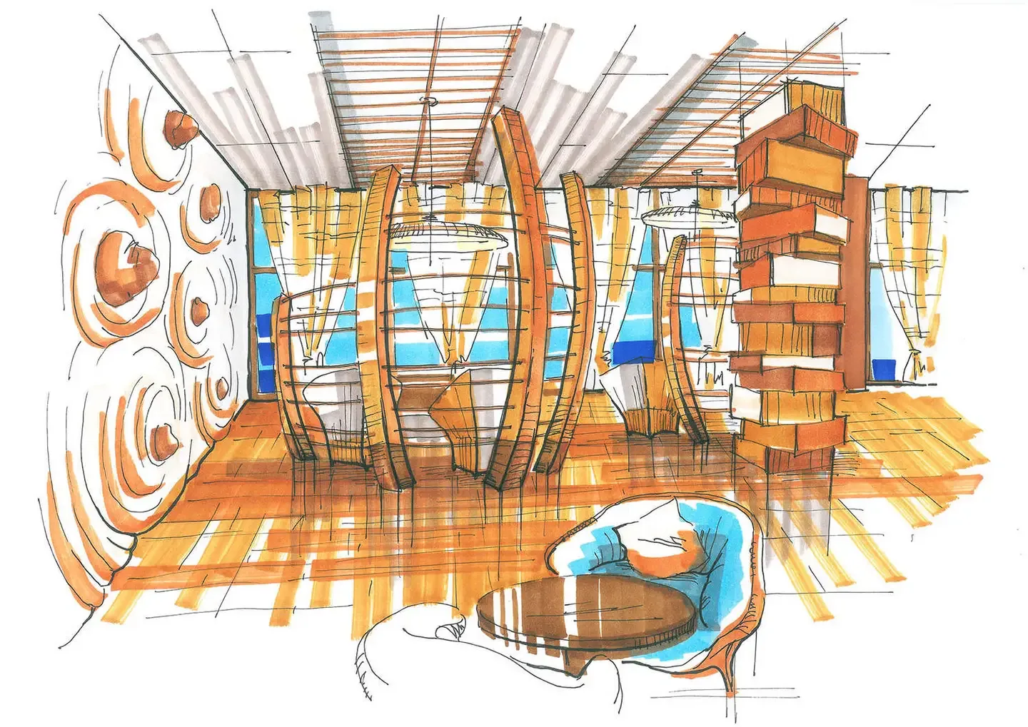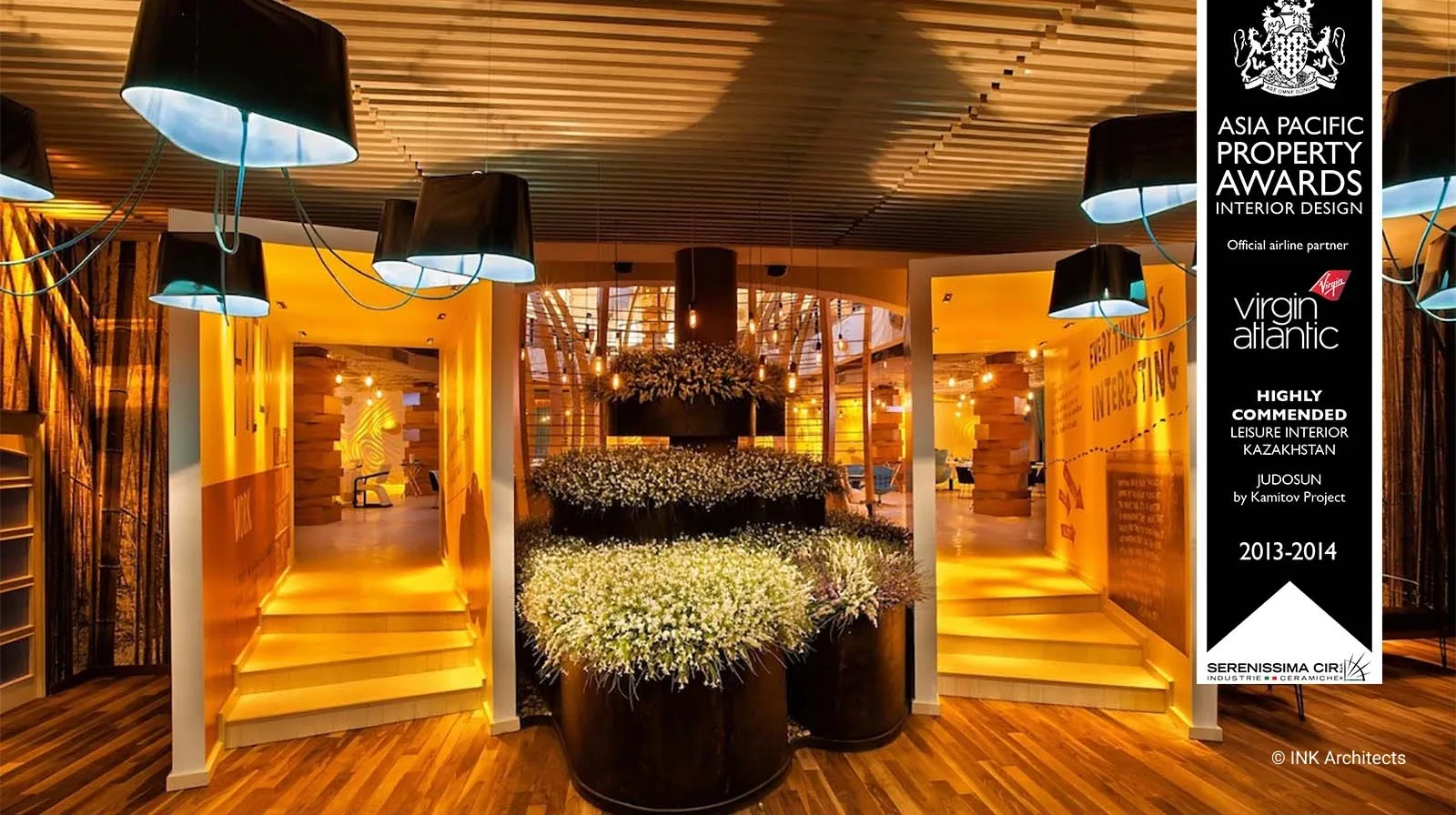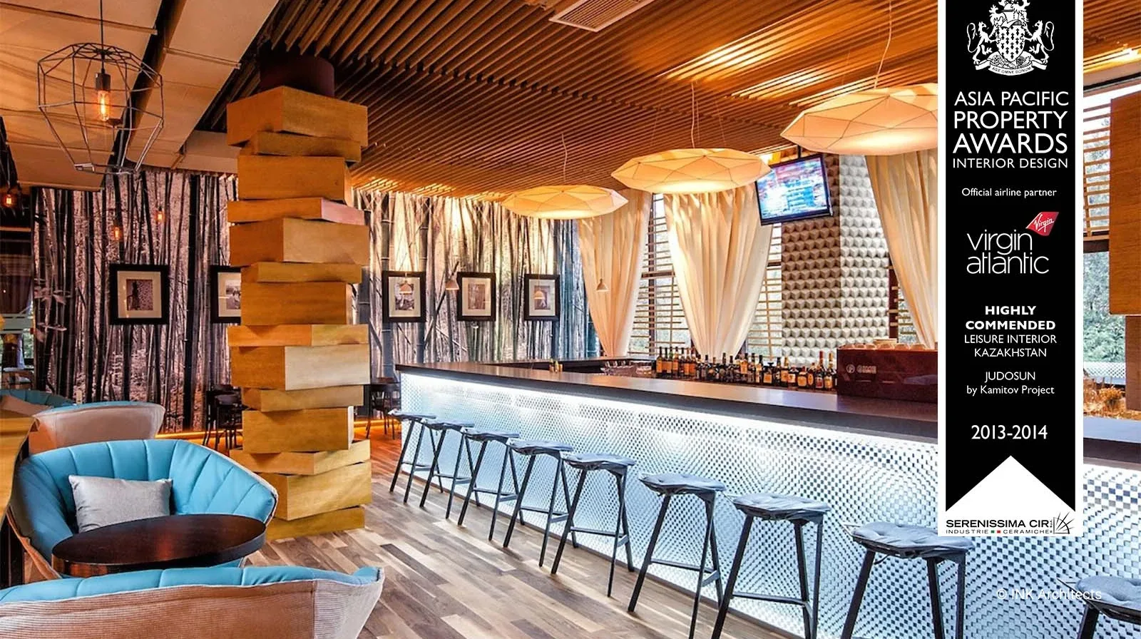 Ресторан Judosun – полная реконструкция с сохранением инженерных сетей бывшего банкетного зала в Алматы. Восточная медитативность, ненавязчивость, чувство меры в контрасте с элементами культуры «дикого Запада» - концептуальные позиции в разработке проекта. Ресторан разбит на два уровня. Первый – ресторан-трансформер для проведения разных мероприятий. Два портала, как два перехода из одного пространства в другое. Полукруглые гнутые деревянные конструкции перегородок - интерпретация китайской традиции и кочевой культуры (юрты). Объемный декор стен, в виде текучих волн песка, навеяны японским садом камней. Второй уровень ресторана более закрытый, с барной стойкой и интегрированным здесь же DJ в секторе, с более расслабляющей обстановкой. Отсюда же раскрывается общий вид на пространство нижнего этажа, прочитывается его ритмическая структура, отчетливо читается изображение известного произведения американского поп-артиста ХХ века, Р. Лихтенштейна, на полу. Проект был удостоен международной премии в Куала-Лумпуре, Малайзия.