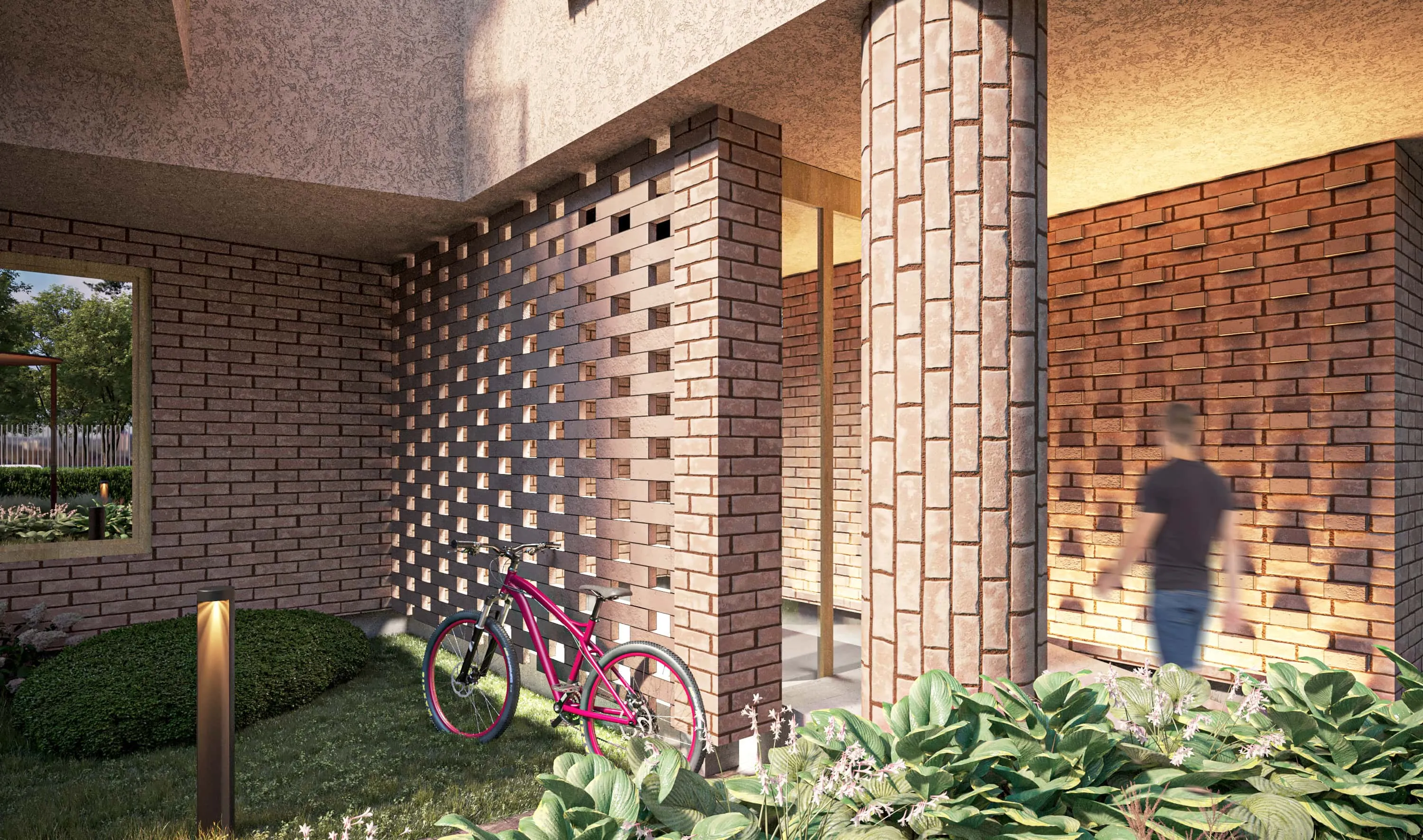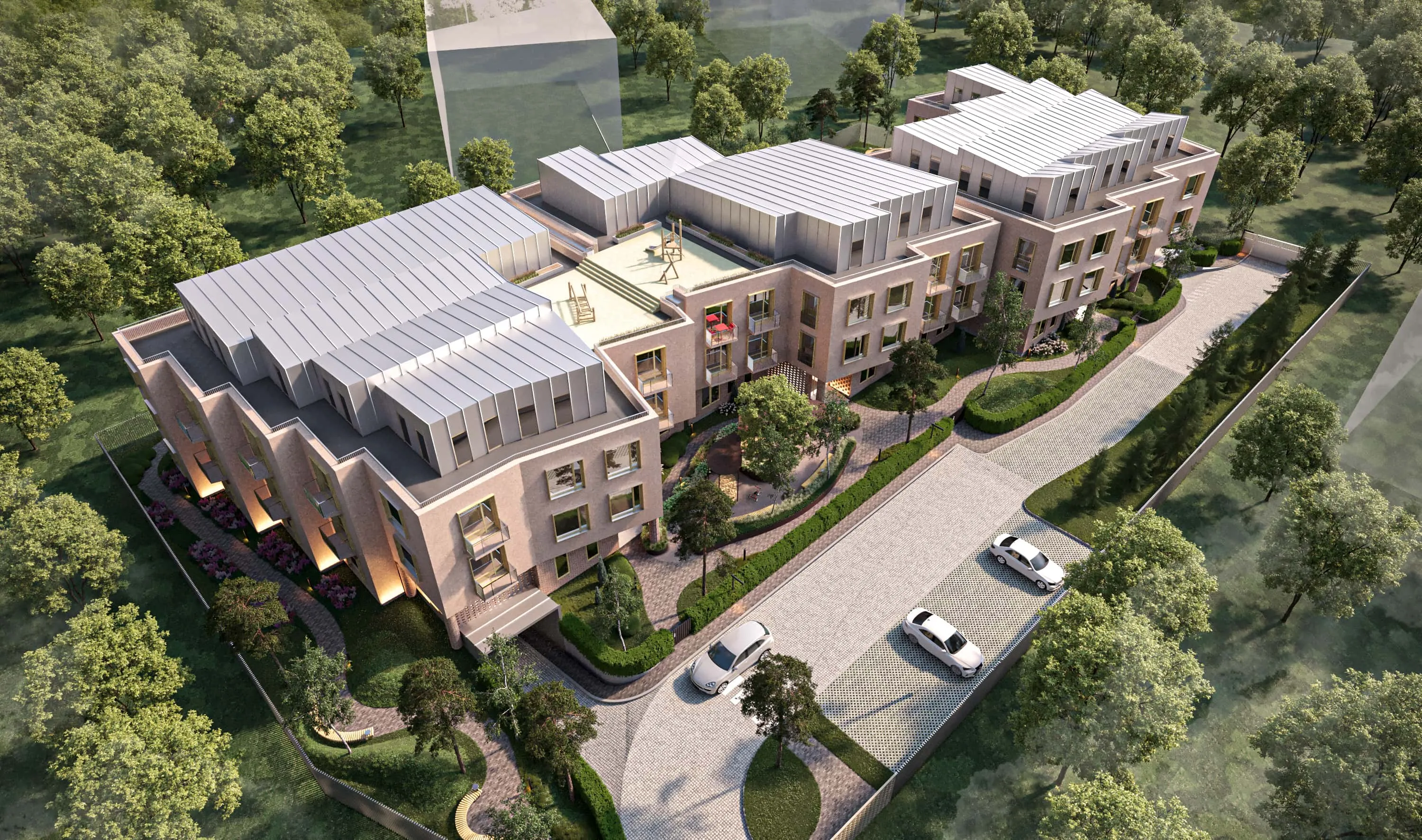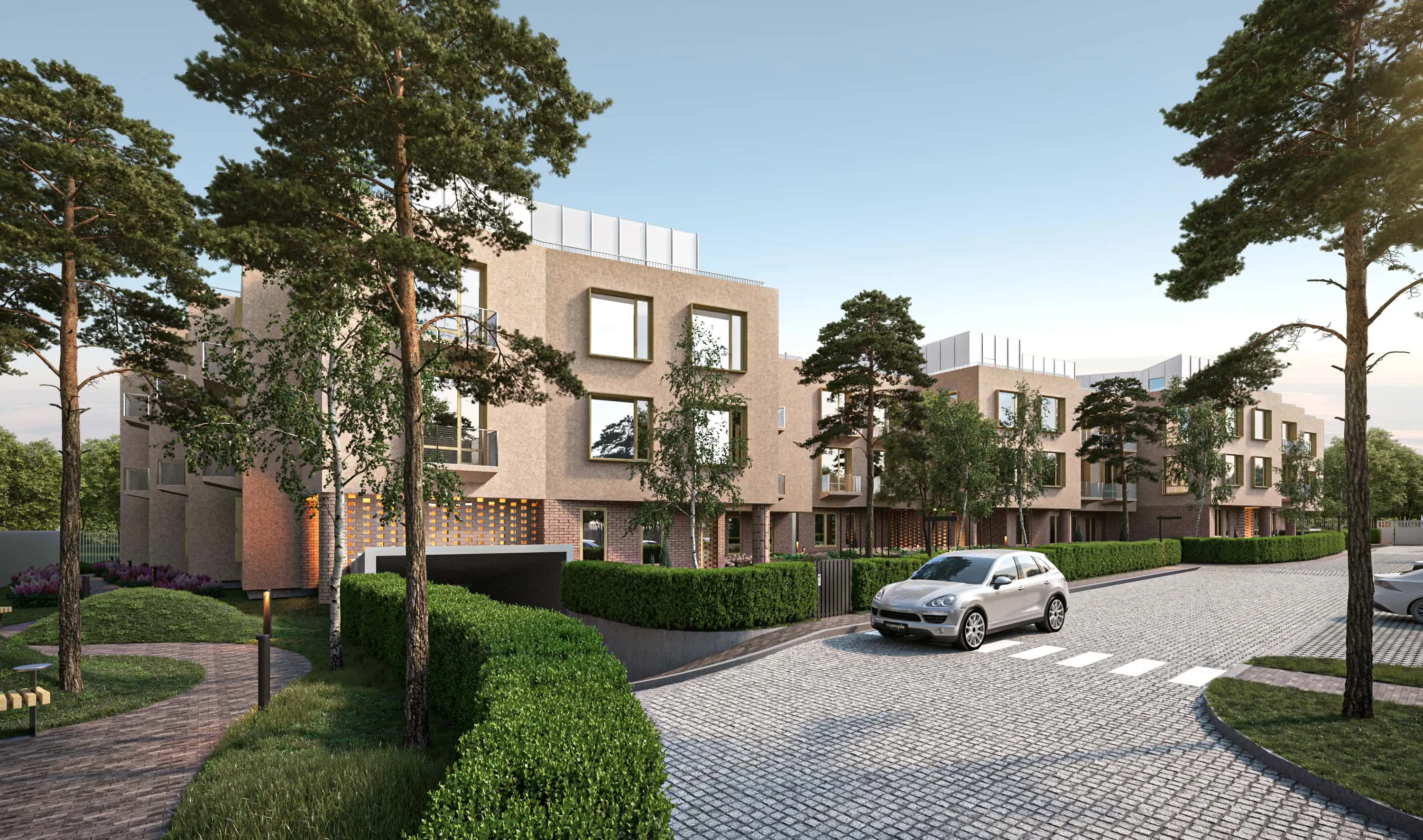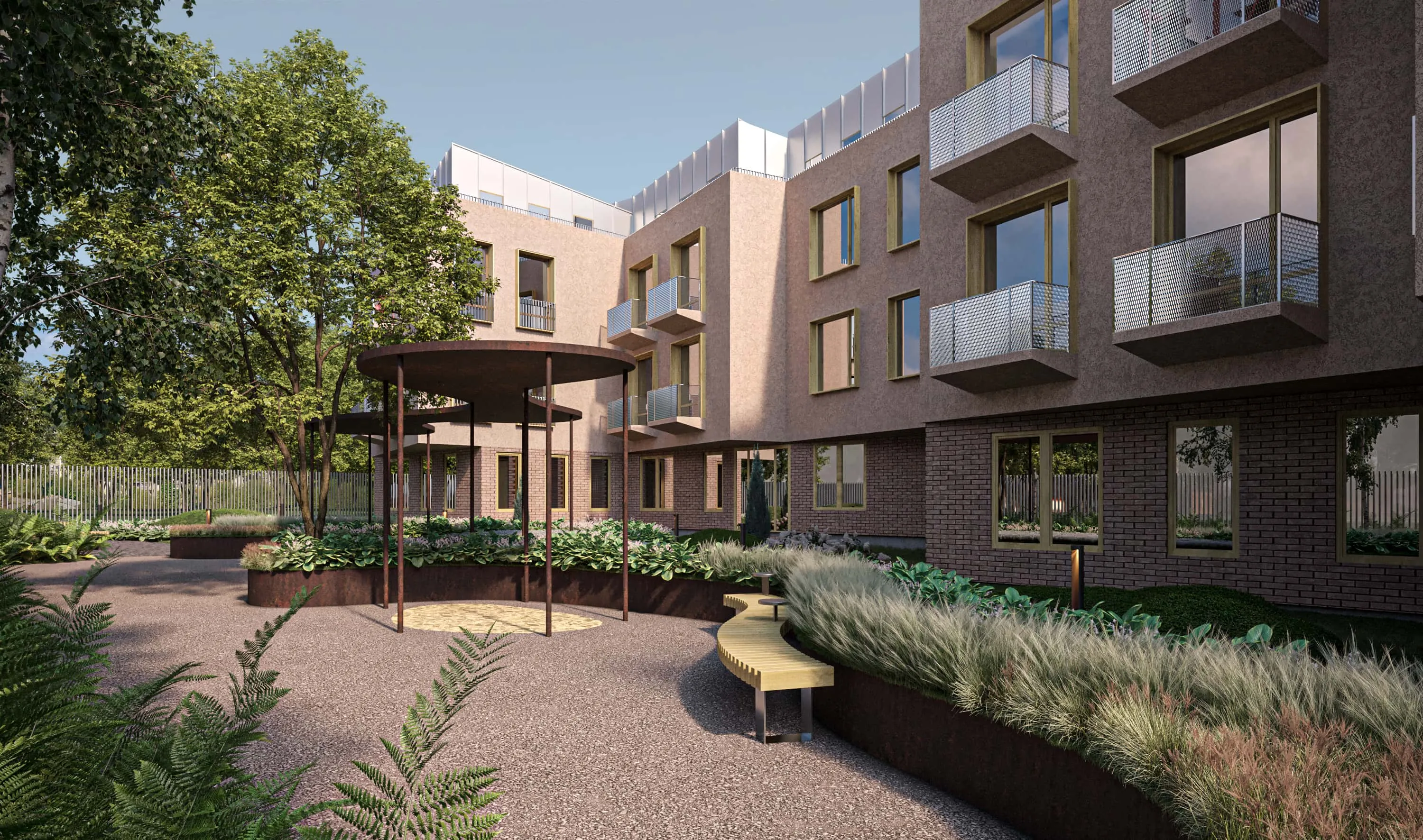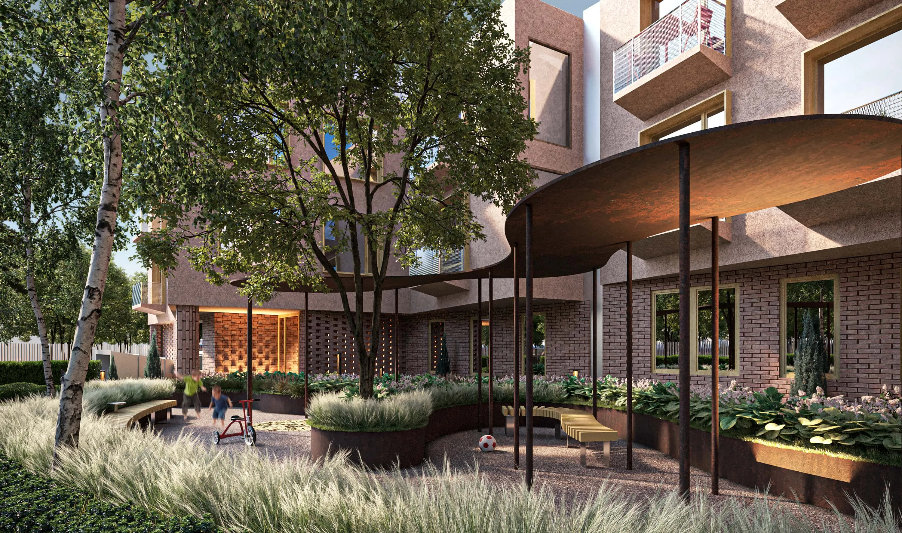 <div class="description">Различные ограничения участка вдохновили на создание здания в форме S с двумя полукруглыми дворами и ступенчатыми фасадами, что позволяет довольно крупной массе здания восприниматься менее монолитно и более соразмерно человеческому масштабу. Первый этаж отделан клинкерным кирпичом, который переходит в каменную отделку на входах. Второй и третий этажи отделаны штукатуркой, чтобы дополнить кирпич, в то время как четвертый мансардный этаж облицован оцинкованной сталью, чтобы визуально облегчить верхнюю часть здания. Окна акцентированы деревянными наличниками, а открытые балконы ограждены металлическими сетчатыми перилами. Чтобы сбалансировать прямые, герметичные контуры здания, концепция ландшафтного дизайна основана на органических линиях и формах. Во дворах установлены навесы и ржавые металлические цветники, которые подчеркивают и усиливают теплые тона кирпича.</div>