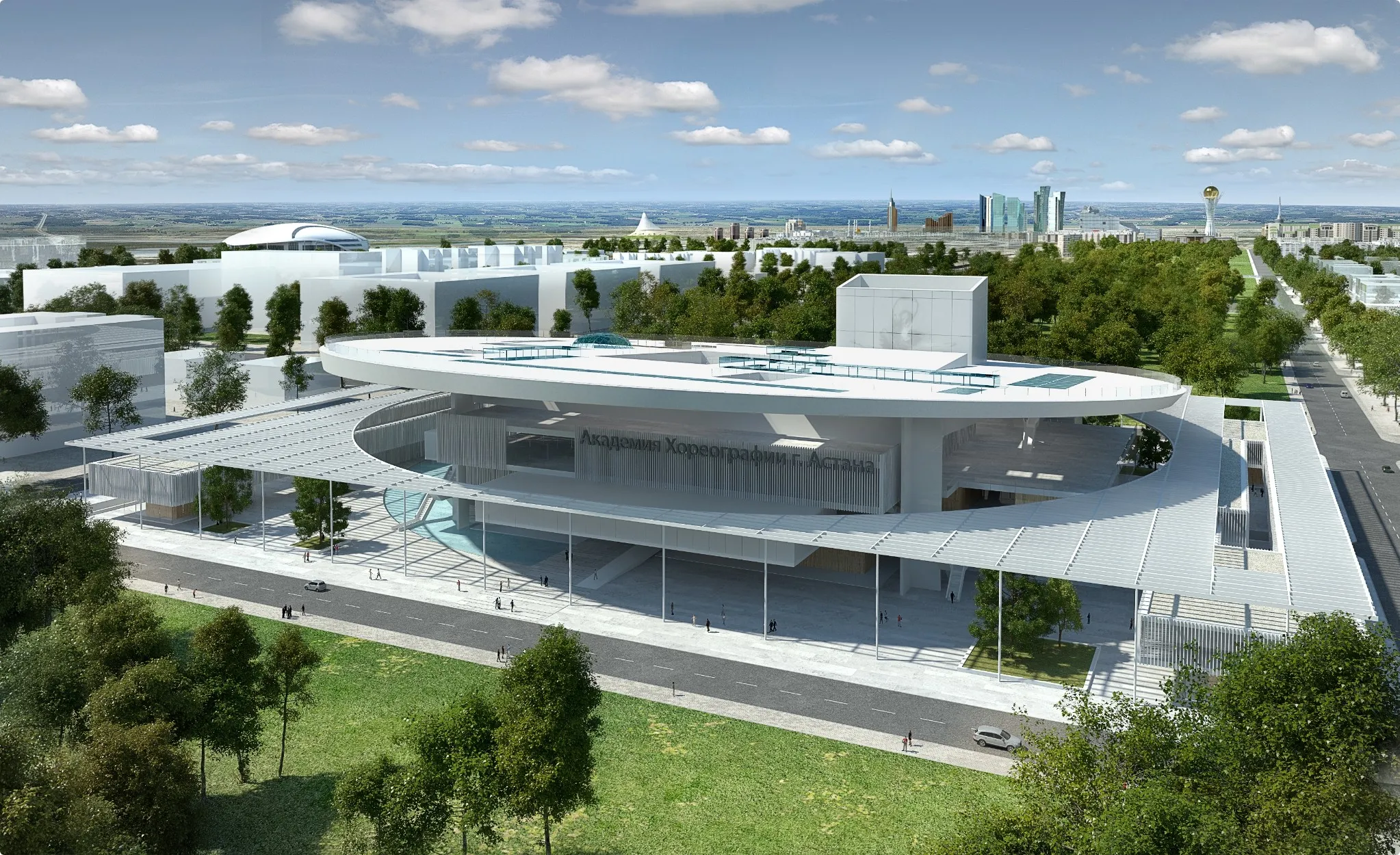 <div class="description"><p>Новая Академия Хореографии расположена в центре Астаны, на линии зеленой оси и прямо рядом с Ботаническим садом. Место проведения Экспо 2017 находилось всего в нескольких сотнях метров от здания академии, а также вблизи отличительной достопримечательности Астаны, Башни Байтек. Контекст был важным движущим фактором для концепции дизайна; идея наклона крыши в сторону административного и делового центра была ключевой, так как она предоставляла пользователям панорамный вид на Ботанический сад и знаковую Башню Байтек. Высокая сторона здания выходила на территорию Экспо 2017. Закругленная форма крыши стала сильным символом, охватывающим динамический спектр уникальных мероприятий.</p></div>