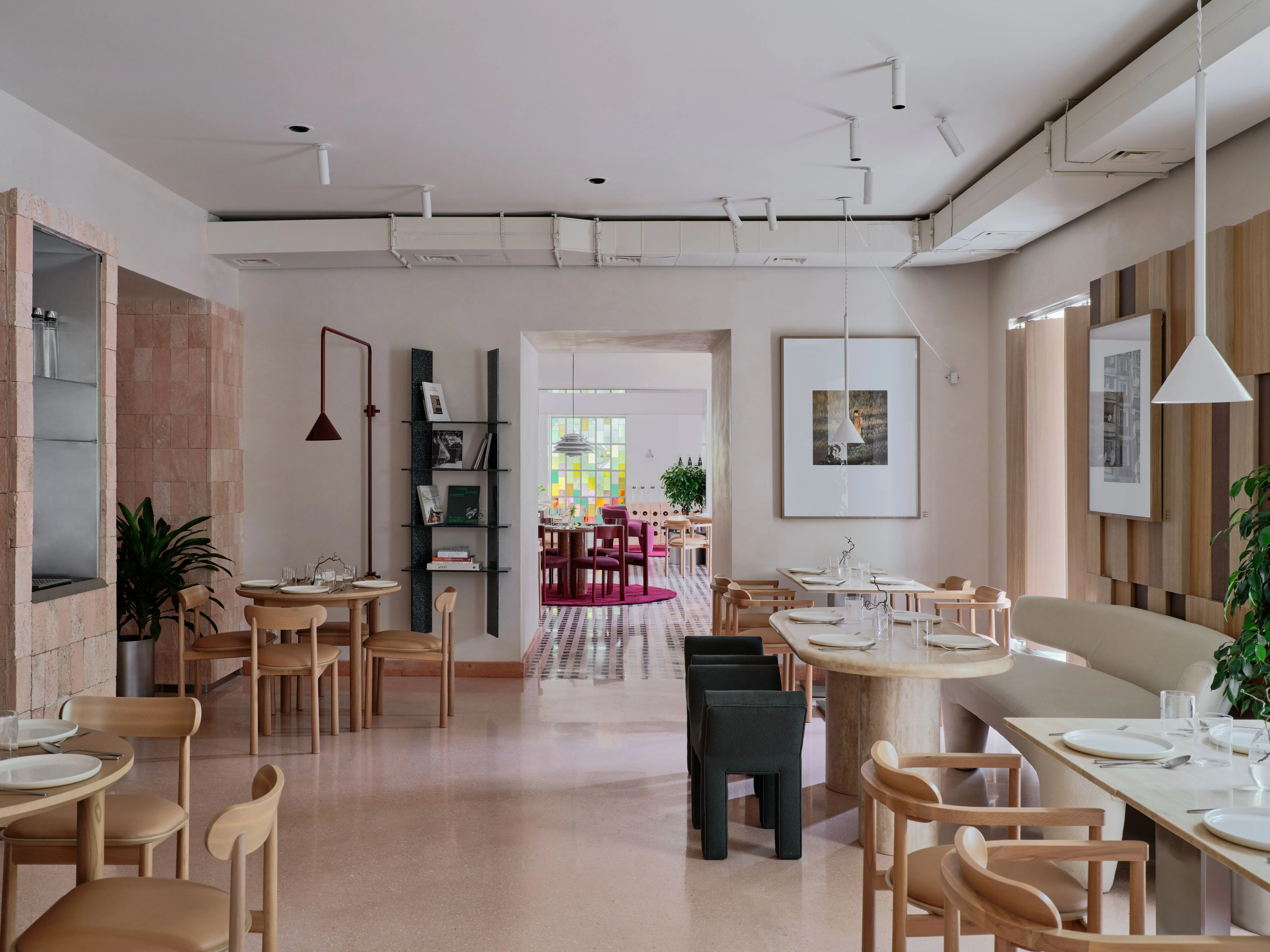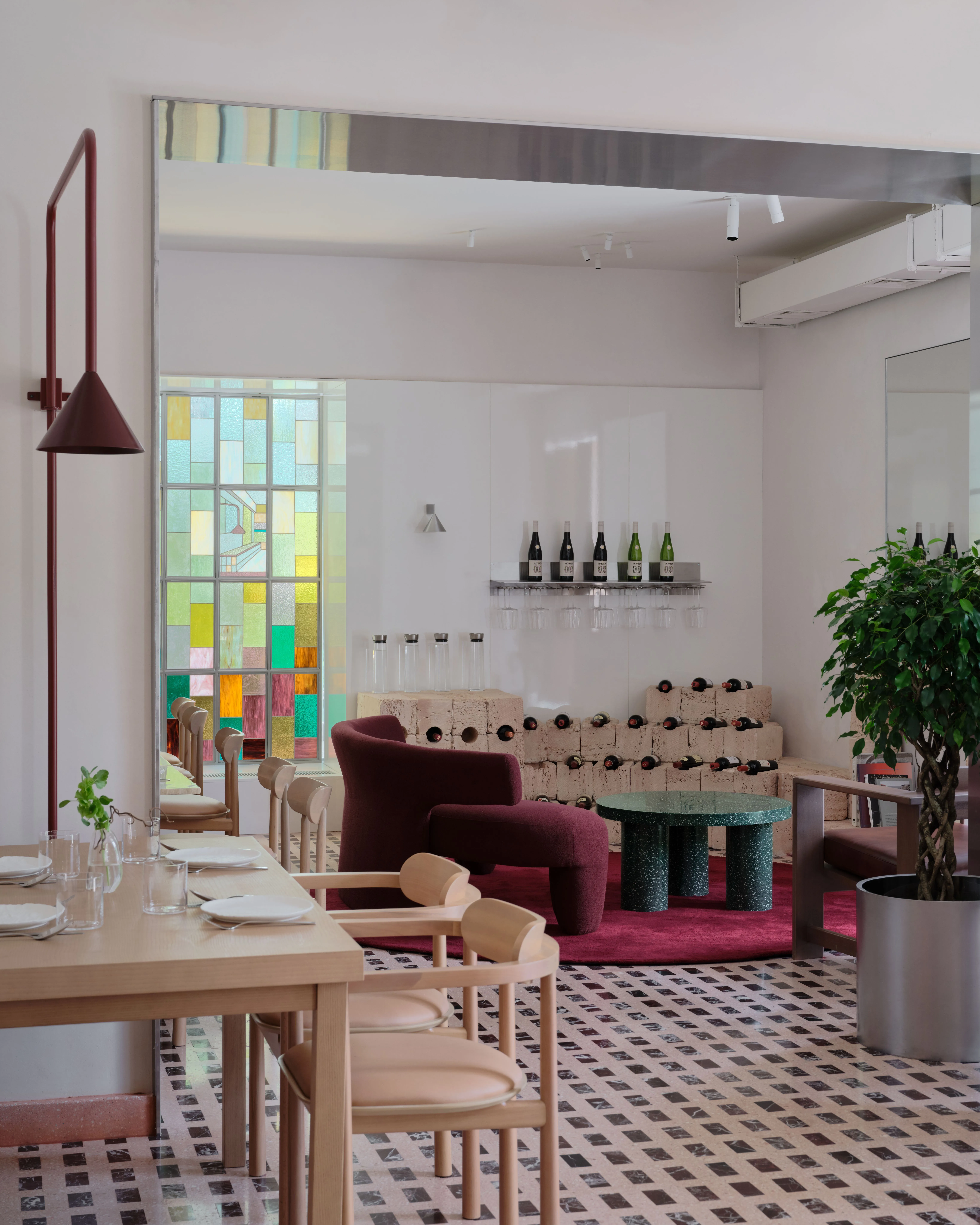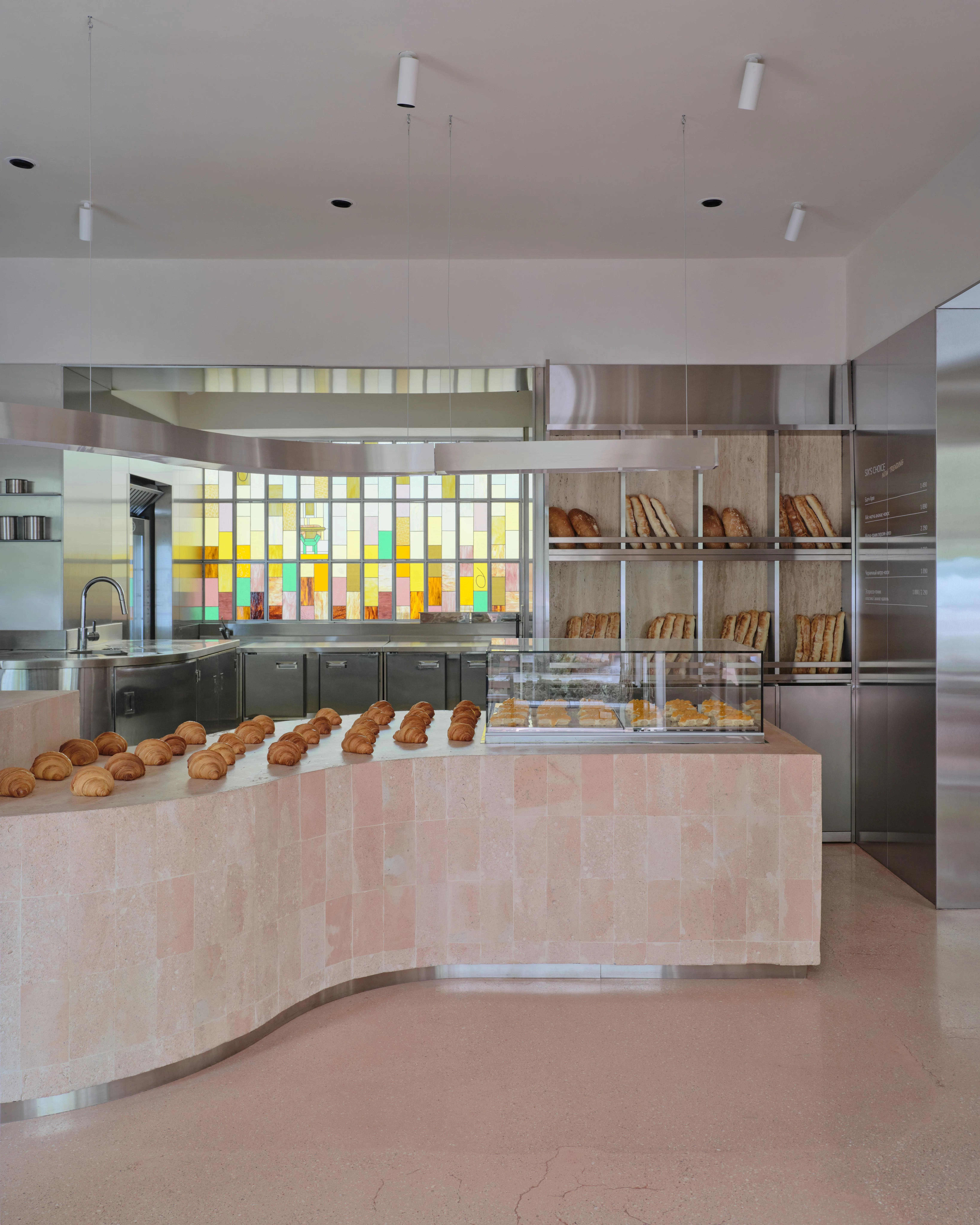 <div class="description">Ресторан Six Coffee + Wine задуман как универсальное заведение, которое плавно переходит от оживленного завтрака и кофейного места утром к уютной винодельне вечером. Эта трансформация возможна благодаря тщательно продуманному дизайну освещения, который адаптируется для создания желаемой атмосферы, и гибкой расстановке столов, которая легко меняется в зависимости от функций. Расположенный в историческом здании сталинской эпохи в центре Алматы, интерьер отдает дань советским архитектурным традициям. Облицовка известняком, терраццо на полу и индивидуально изготовленное витражное окно, созданное местным мастером, вызывают иконографическую эстетику того времени, укореняя пространство в его культурном и историческом контексте. Выдающейся особенностью являются градиентные стеновые панели в коридоре, креативное сотрудничество архитектурной студии NAAW и местного производителя мебели Free-Style. Эта установка добавляет динамичный, современный слой к дизайну, противопоставляя традиции современному штриху. </div>
