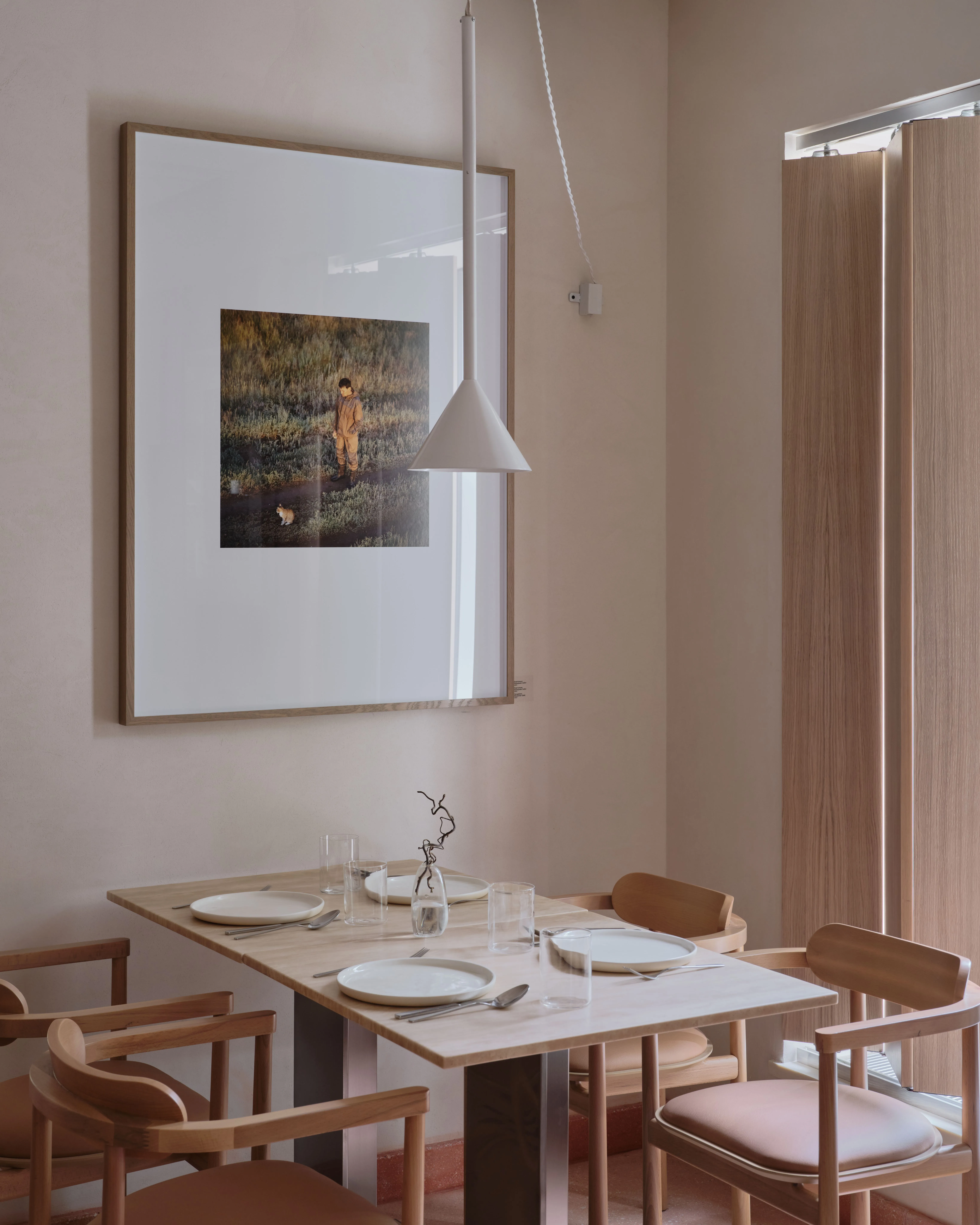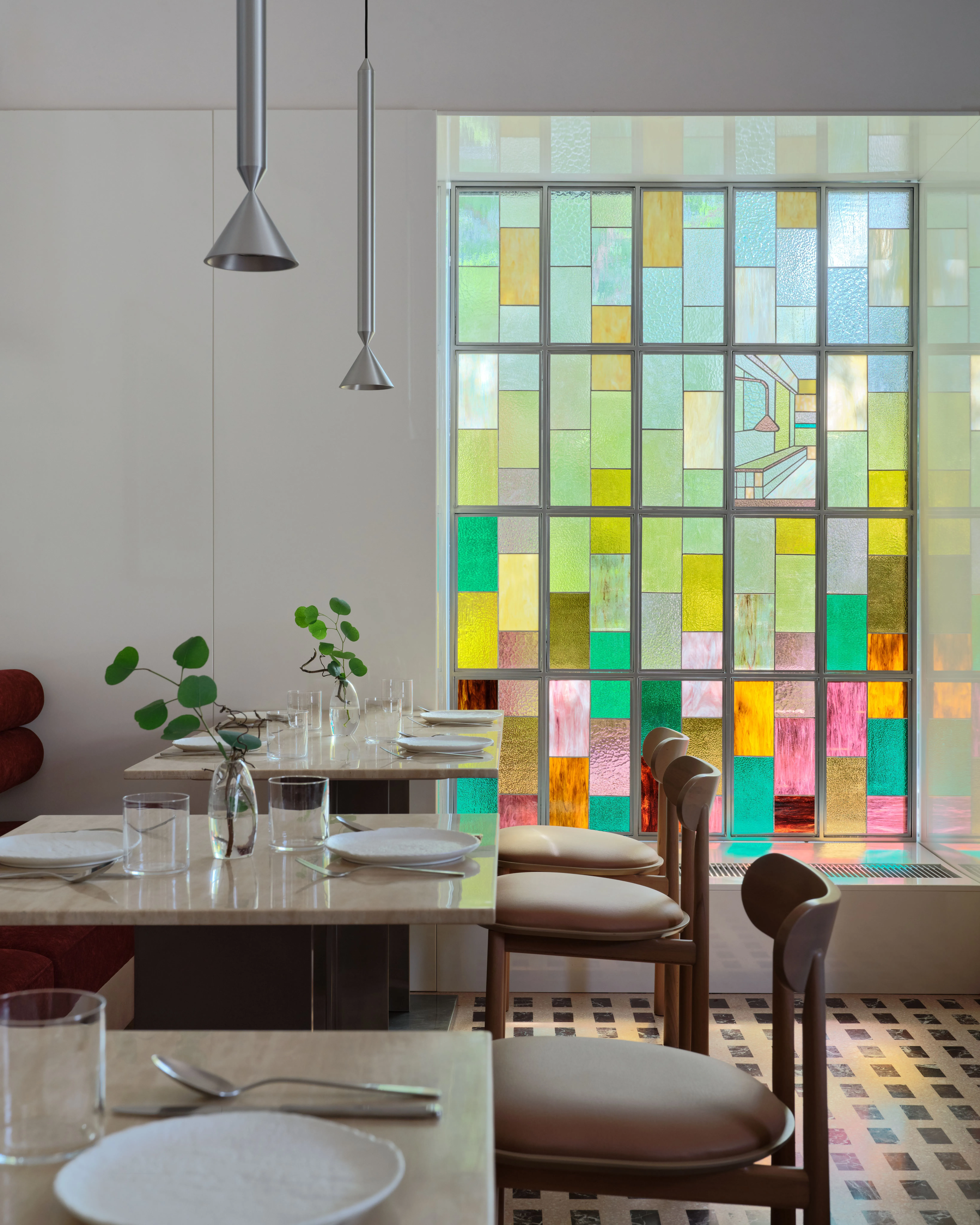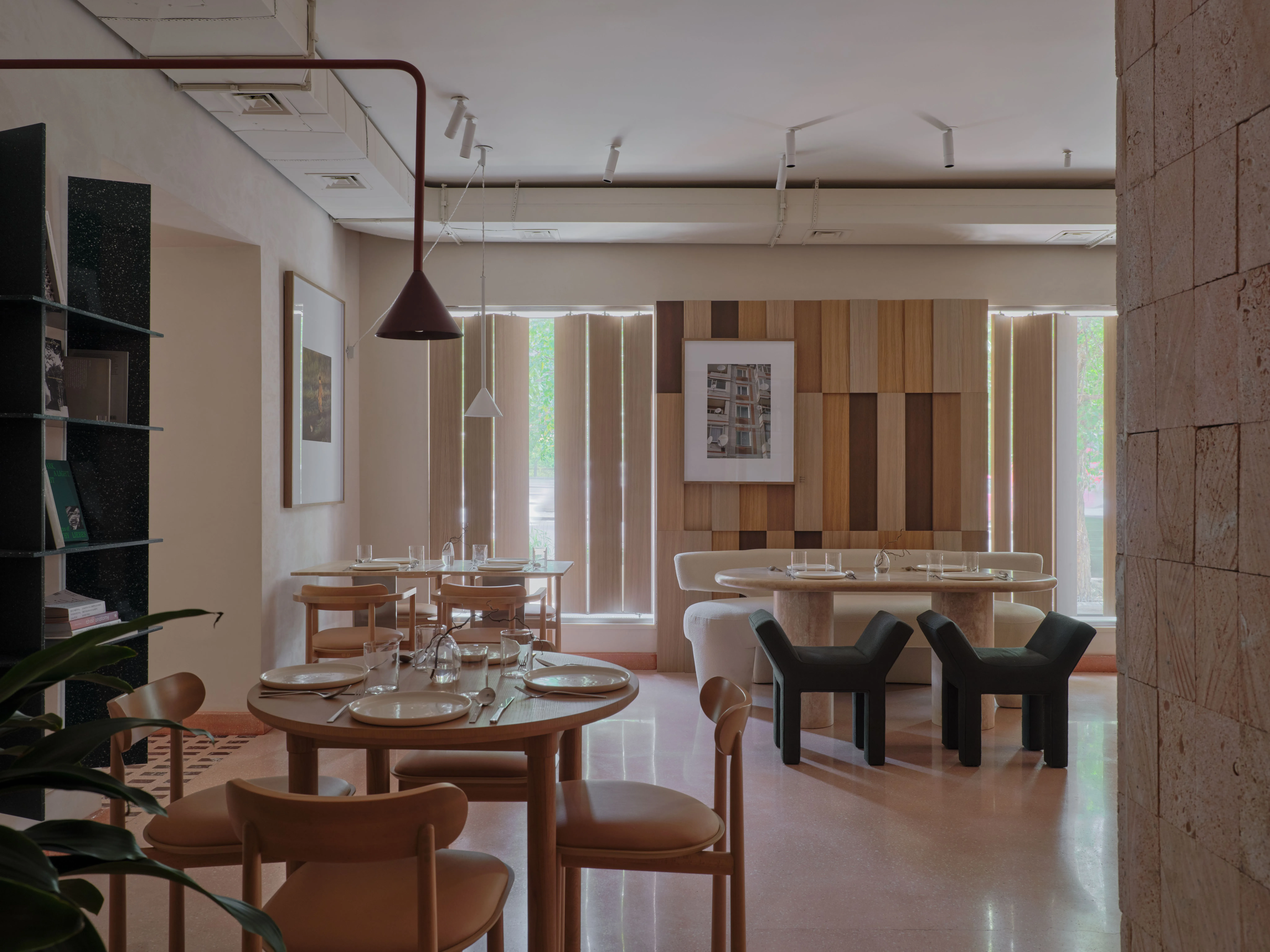 <div class="description">Ресторан Six Coffee + Wine задуман как универсальное заведение, которое плавно переходит от оживленного завтрака и кофейного места утром к уютной винодельне вечером. Эта трансформация возможна благодаря тщательно продуманному дизайну освещения, который адаптируется для создания желаемой атмосферы, и гибкой расстановке столов, которая легко меняется в зависимости от функций. Расположенный в историческом здании сталинской эпохи в центре Алматы, интерьер отдает дань советским архитектурным традициям. Облицовка известняком, терраццо на полу и индивидуально изготовленное витражное окно, созданное местным мастером, вызывают иконографическую эстетику того времени, укореняя пространство в его культурном и историческом контексте. Выдающейся особенностью являются градиентные стеновые панели в коридоре, креативное сотрудничество архитектурной студии NAAW и местного производителя мебели Free-Style. Эта установка добавляет динамичный, современный слой к дизайну, противопоставляя традиции современному штриху. </div>