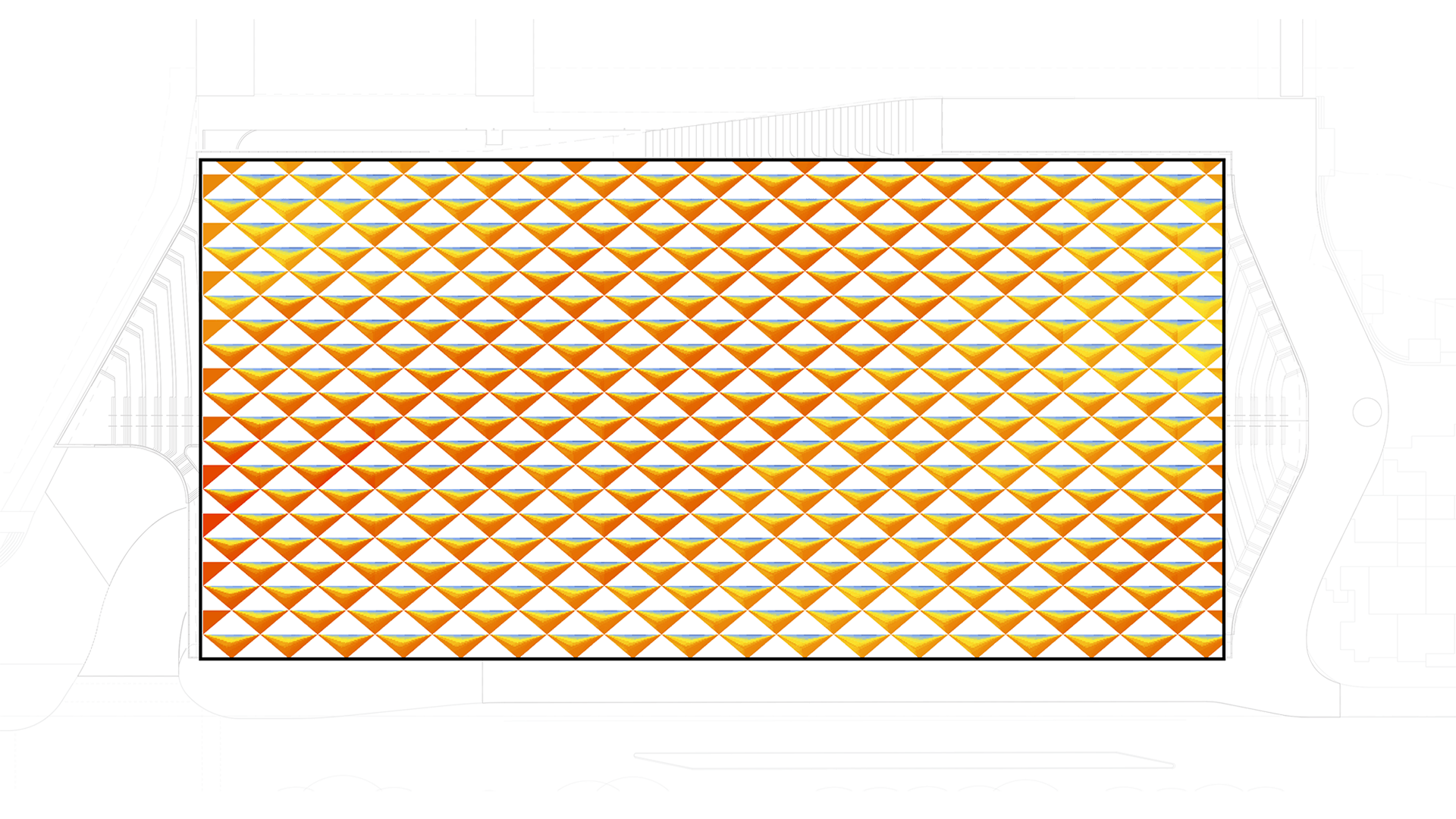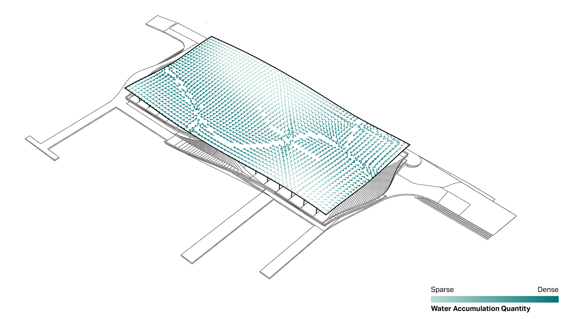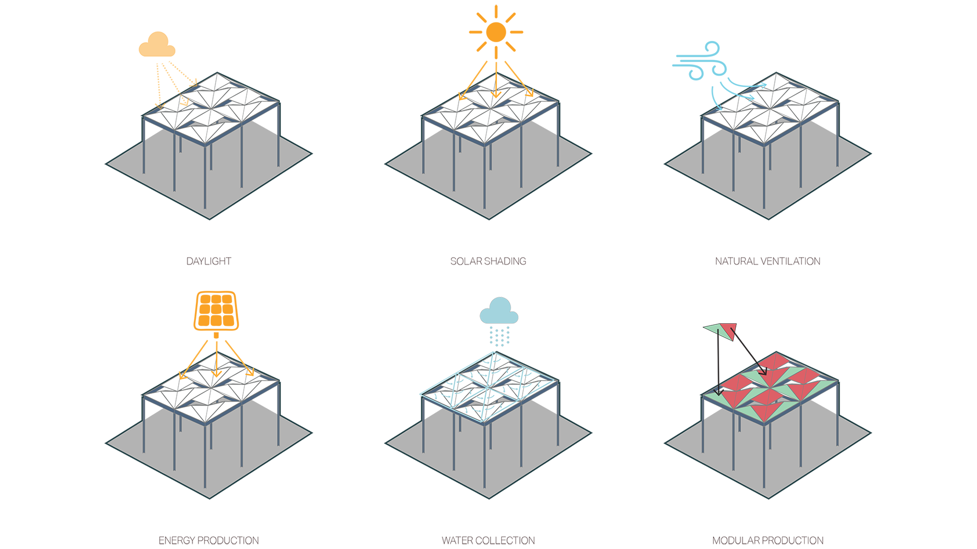 С помощью моделирования были протестированы различные геометрии крыши, чтобы прийти к единому проекту крыши, которая выполняет несколько функций одновременно, таких как отвод сточных вод и дождевой воды, производство солнечной энергии, естественная вентиляция и затенение.