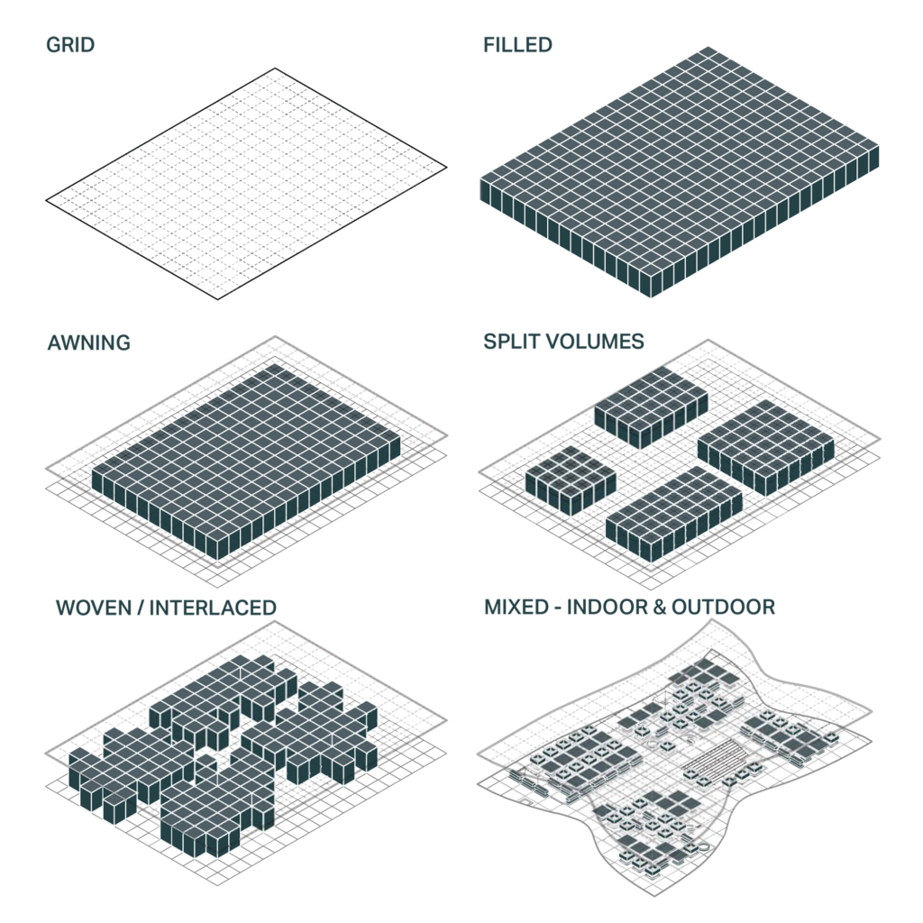 Модули можно программировать по отдельности или объединять в кластеры, обеспечивая разнообразие не только в использовании, но и в масштабе и форме. Здание можно запрограммировать на различные внутренние и внешние функции в зависимости от социальных потребностей пользователей рынка. Это позволяет внутренним и внешним пространствам гибко изменяться, расширяться и сокращаться по мере необходимости. Здание становится адаптивным элементом, который меняется в соответствии с текущими и будущими потребностями различных групп пользователей и заинтересованных сторон.