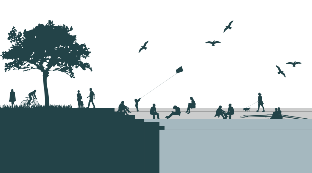 - Создание Связной Набережной: Основное открытое пространство расположено параллельно кромке воды, интегрируясь с прибрежной набережной, которая ведет к новому Рыбному рынку и вокруг открытого пространства Банк-стрит.